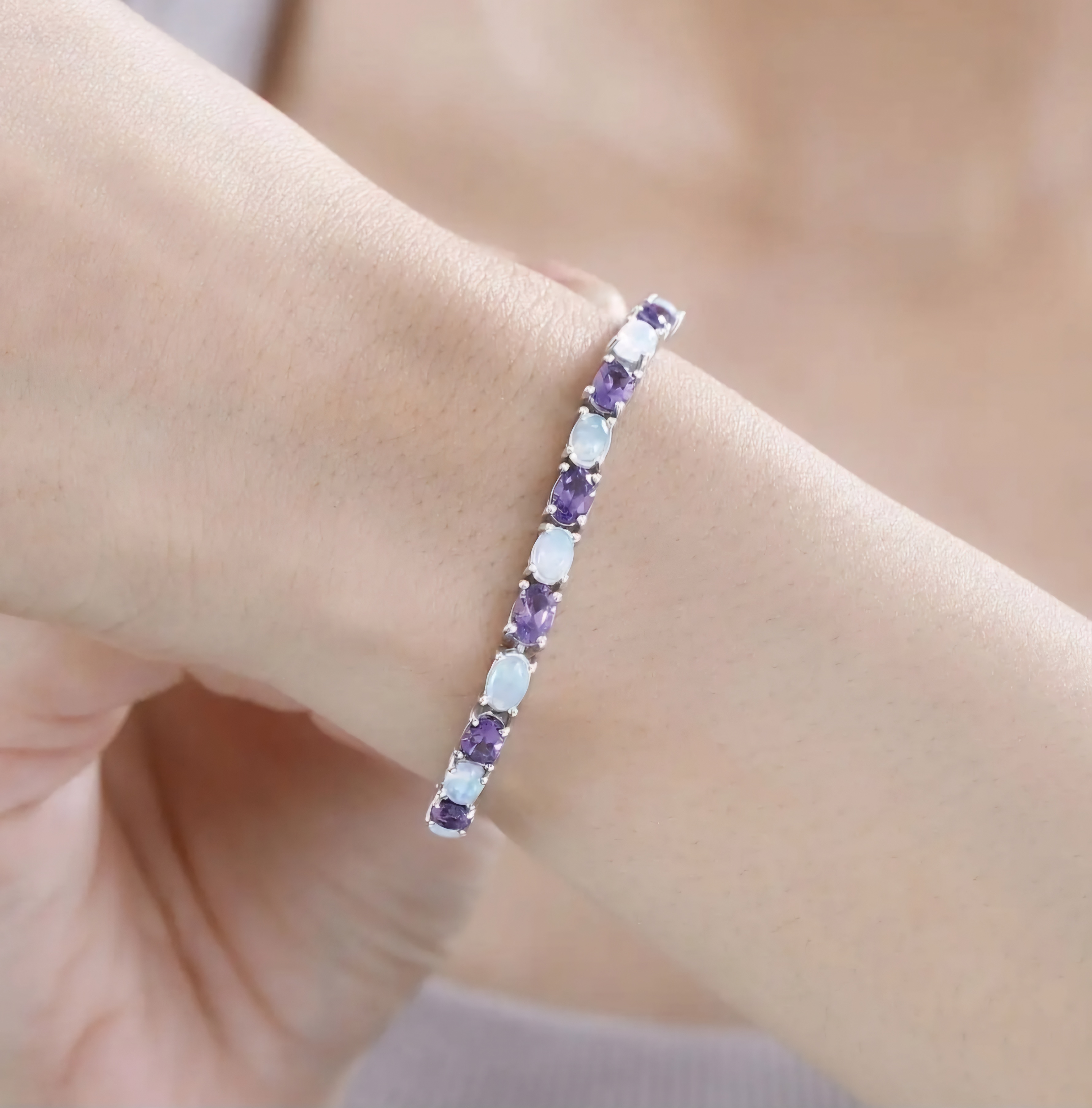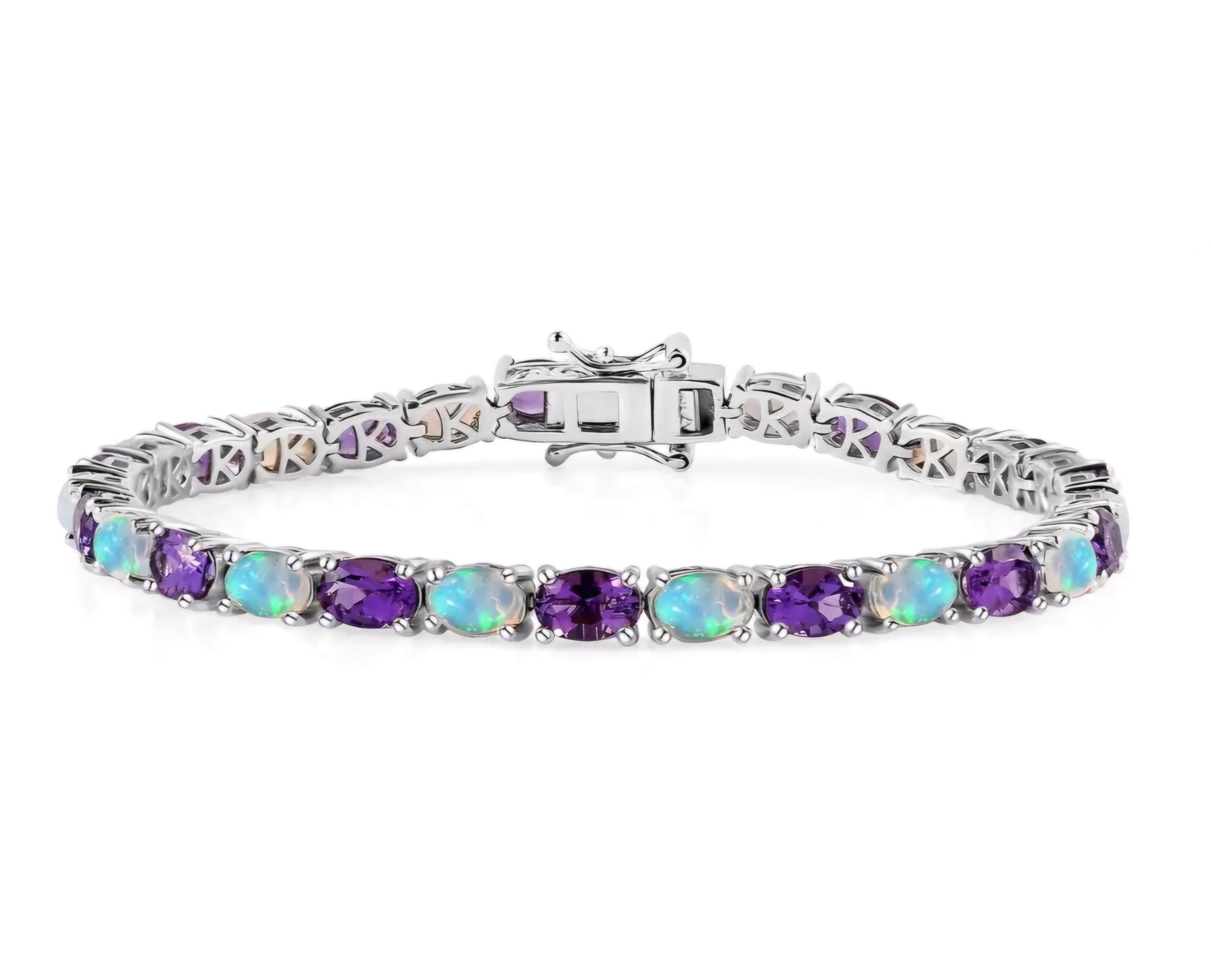 Elevate your jewelry collection with our Amethyst & Ethiopian Opal Oval Tennis Bracelet In Rhodium over Sterling Silver 10.10ctw. This exquisite piece features a stunning combination of amethyst and opal stones set in a sleek rhodium-plated sterling silver setting. Perfect for adding a touch of elegance to any outfit.
