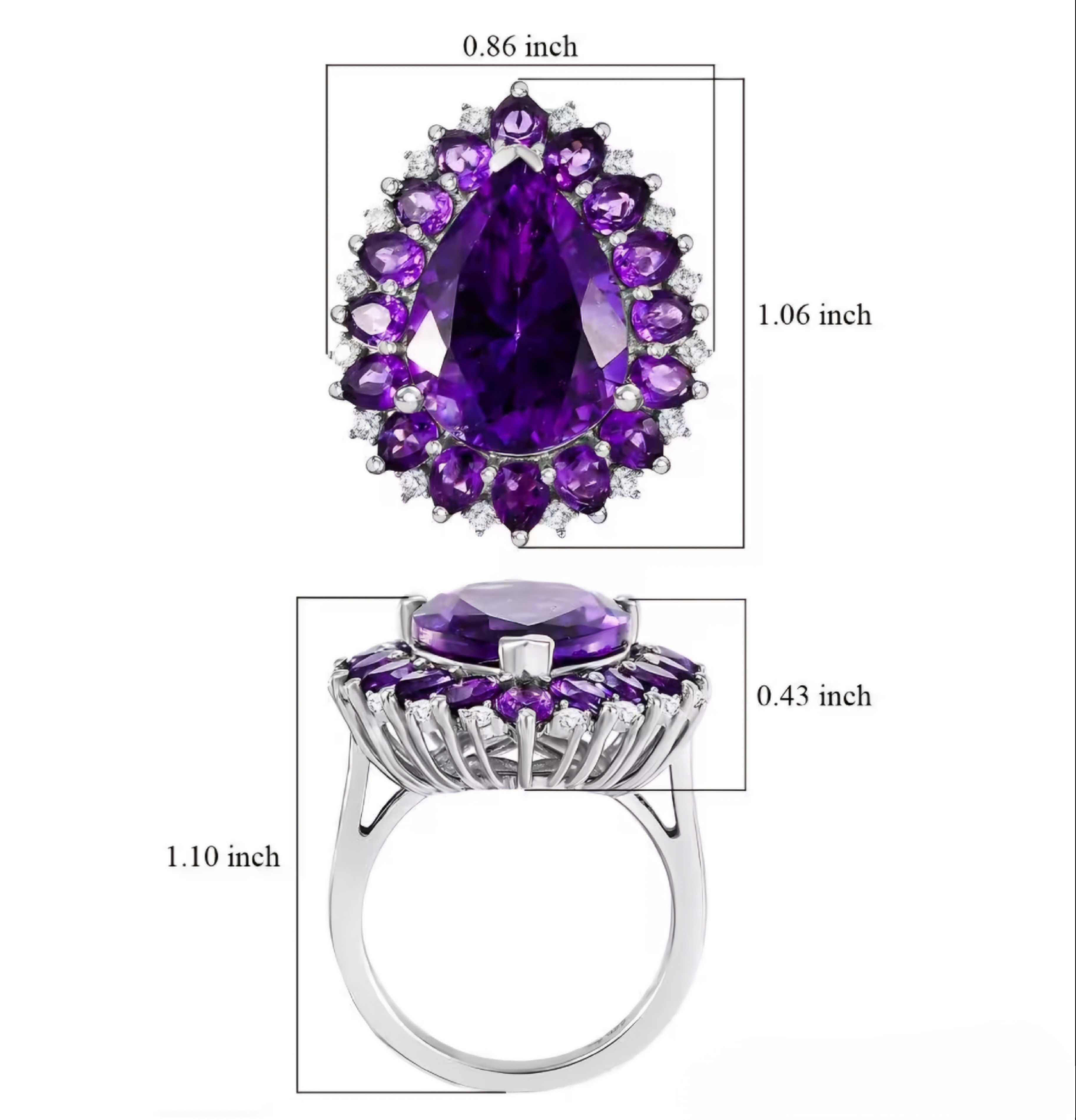 Elevate your jewelry collection with our Amethyst & Moissanite Pear Halo Ring. Boasting a breathtaking 16x12mm pear cut natural and untreated Moroccan Amethyst center stone, this ring is truly a showstopper. The halo of pear cut Amethysts and sparkling round Moissanites enhances the beauty of the large Amethyst stone, creating a piece that exudes luxury and sophistication. The bold, rich purple color of the stones adds a touch of glamour to your look.
