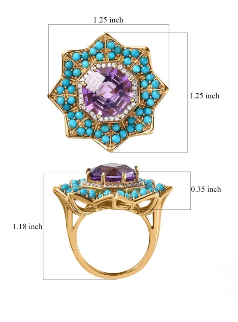 Indulge in opulence and elegance with our exquisite Amethyst, Sleeping Beauty Turquoise & Moissanite Cluster Ring. This magnificent piece is crafted in luxurious 18K Yellow Gold over Sterling Silver, exuding an aura of sophistication. Adorned with a stunning combination of vibrant amethyst, captivating Sleeping Beauty turquoise, and dazzling moissanite, this ring showcases a total carat weight of 8.75ctw. Immerse yourself in the allure of this tasteful blend of gemstones, meticulously designed to captivate and enchant. Elevate your style and make a timeless statement with this resplendent cluster ring.