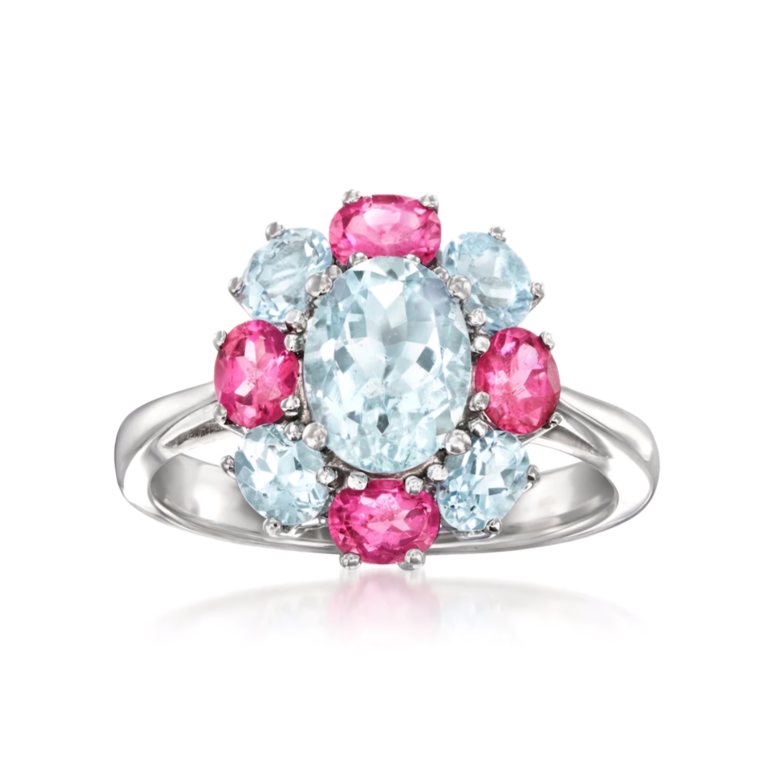 Elevate your jewelry collection with this stunning Aquamarine & Pink Tourmaline Halo Cluster Ring In 14K White Gold 2.70ctw. Featuring a combination of vibrant aquamarine and pink tourmaline stones in a halo cluster design, this ring exudes sophistication and elegance. Crafted in luxurious 14K white gold, this piece is sure to turn heads and make a statement wherever you go.