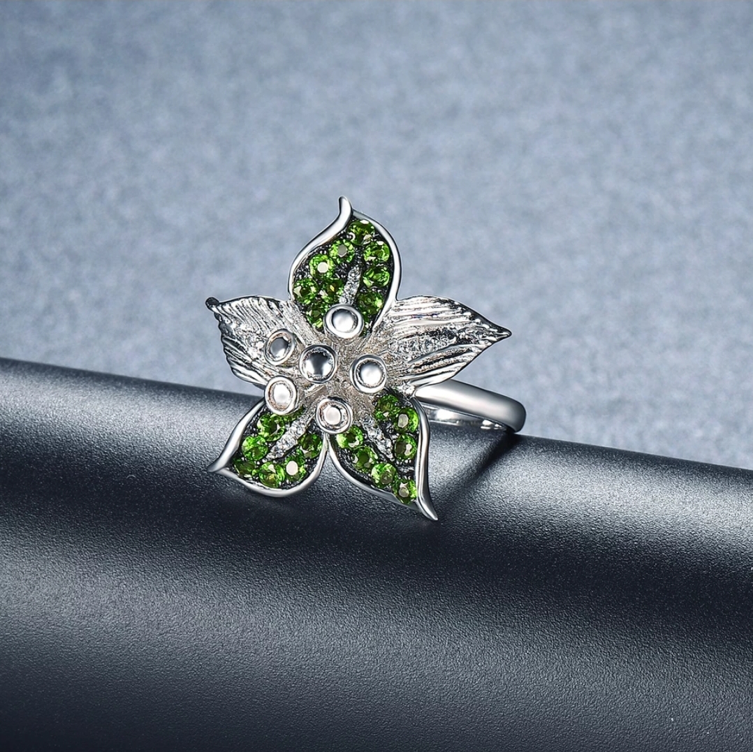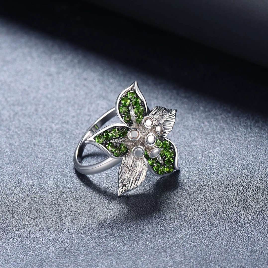 Elevate your fine jewelry collection with this breathtakingly beautiful Chrome Diopside & White Zircon Flower Ring. This stunning piece of art, boasting a total weight of 1.00ctw, is meticulously crafted in premium Sterling Silver. The Chrome Diopside gems burst like a blooming flower that comes alive in vibrant greens, elegantly offset by the sparkling white Zircon. The ring showcases an impressive display of masterful craftsmanship and luxurious shimmer that will make you stand out in any crowd. Exclusive, exquisite, and extraordinary, this Chrome Diopside and White Zircon Flower Ring is your ultimate token of enduring love and timeless elegance.