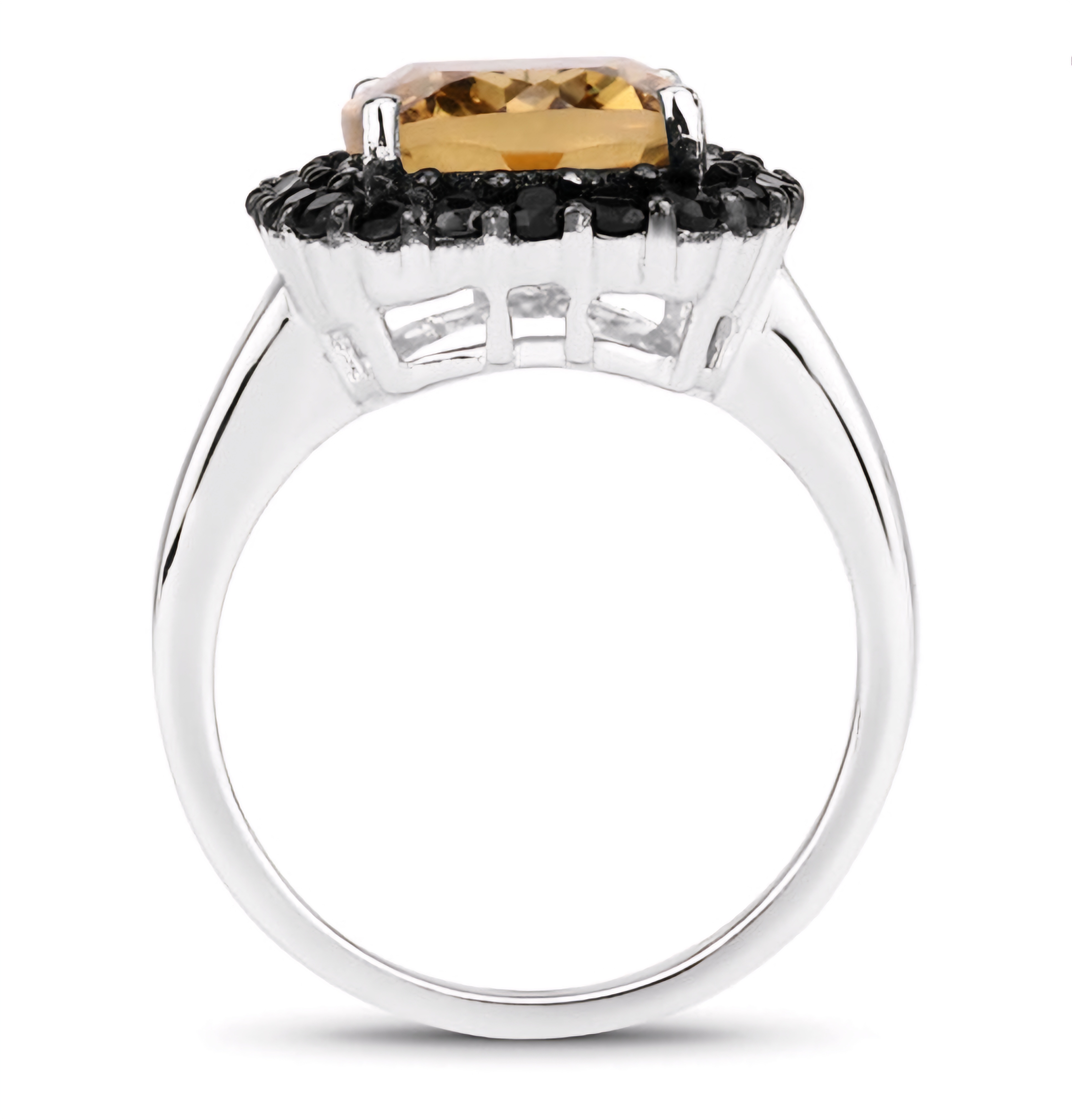 Elevate your style with this stunning Citrine & Black Sapphire Cushion Halo Ring. The 14x10mm rectangle cushion cut citrine center stone shines brightly, surrounded by a halo of round black sapphires set in black rhodium. The two-tone mounting gives this ring a cool and edgy vibe that is sure to make a statement in the world of fashion.