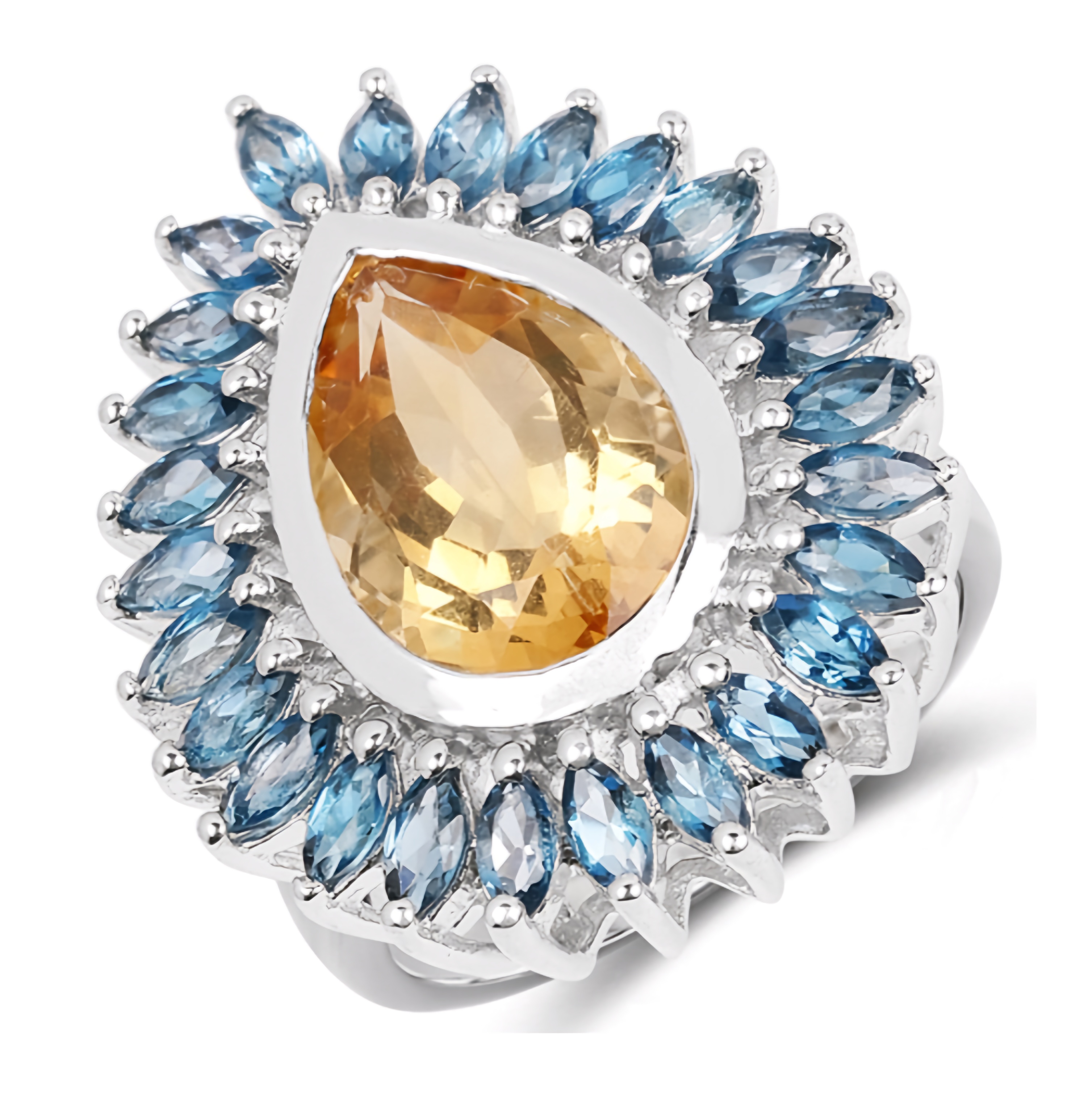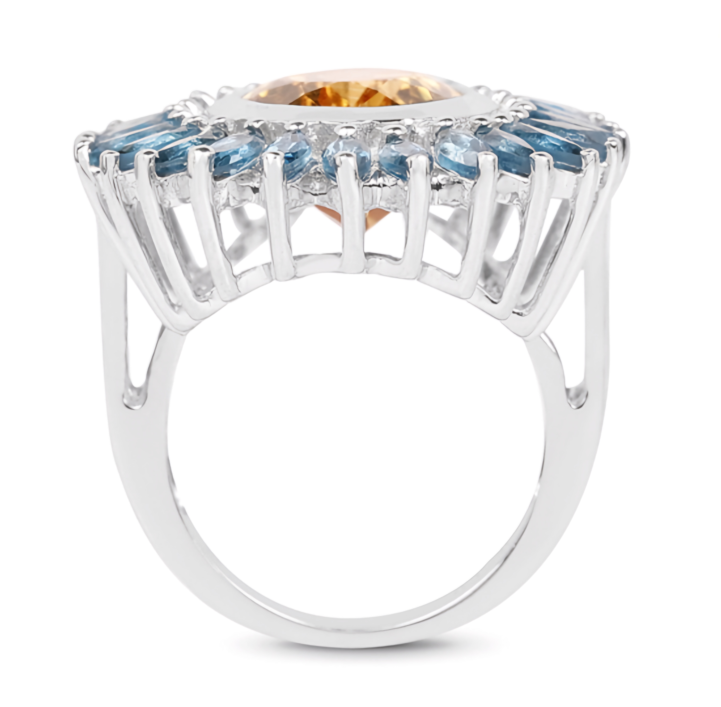 Introducing the exquisite Citrine & London Blue Topaz Halo Ring in Rhodium over Sterling Silver 7.54ctw. This stunning piece features a vibrant citrine center stone encircled by a halo of mesmerizing London blue topaz gemstones. The rhodium plating adds a touch of elegance and durability to the sterling silver band. With a total carat weight of 7.54ctw, this ring is a true statement piece that will dazzle on any occasion. Experience the perfect blend of luxury and sophistication with this magnificent Citrine & London Blue Topaz Halo Ring.