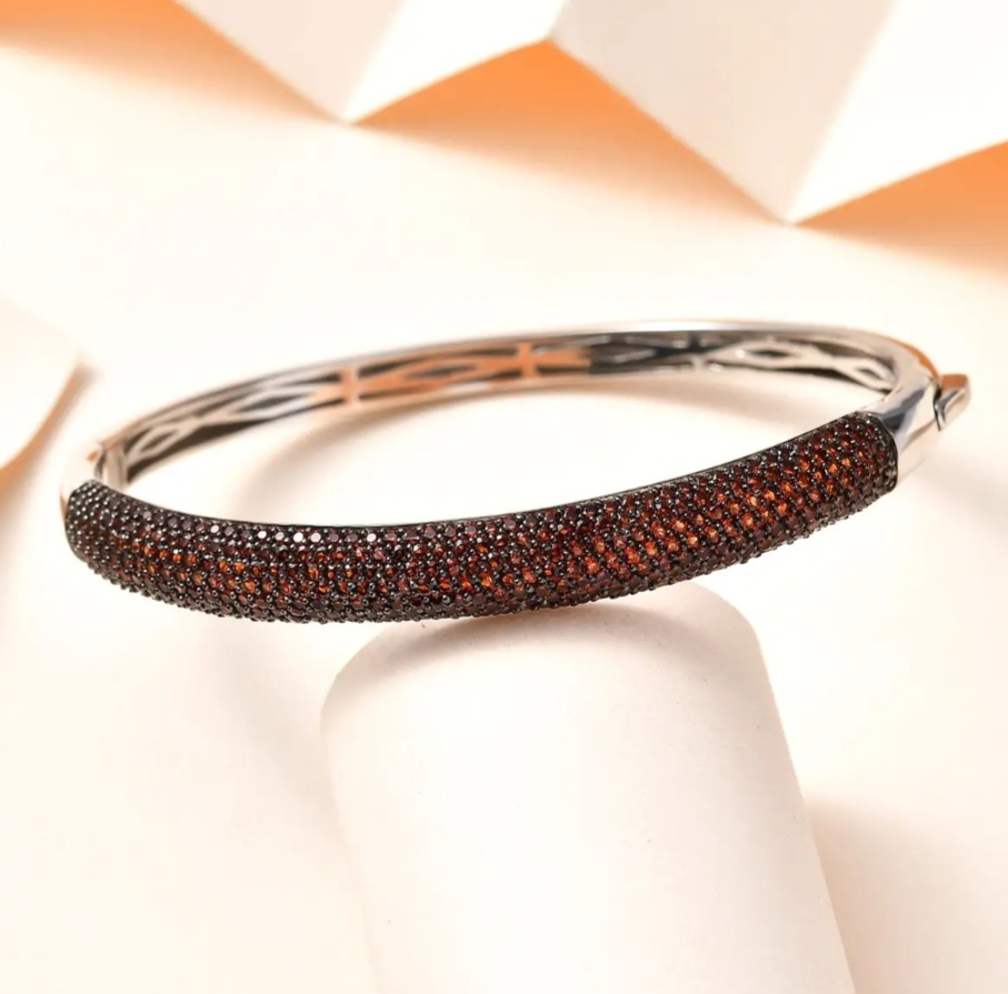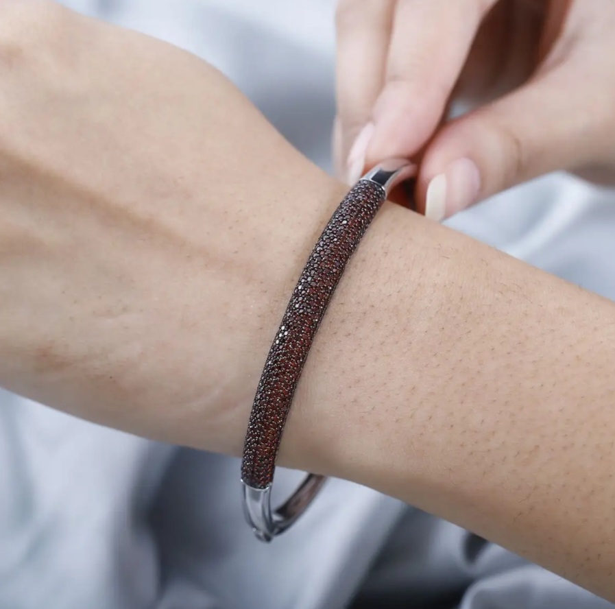 Introducing the exquisite Garnet Cluster Bangle Bracelet in Rhodium over Sterling Silver 4.10ctw, a stunning piece that effortlessly embodies opulence and elegance. Crafted with meticulous attention to detail, this bracelet features an enchanting cluster of mesmerizing garnet gemstones, totaling 4.10 carats, delicately set in lustrous rhodium over sterling silver. The rich red hues of these captivating garnets evoke a sense of passion and allure, while the sleek bangle design exudes a timeless sophistication. Elevate your ensemble with this luxurious accessory, a true testament to impeccable craftsmanship and refined taste.