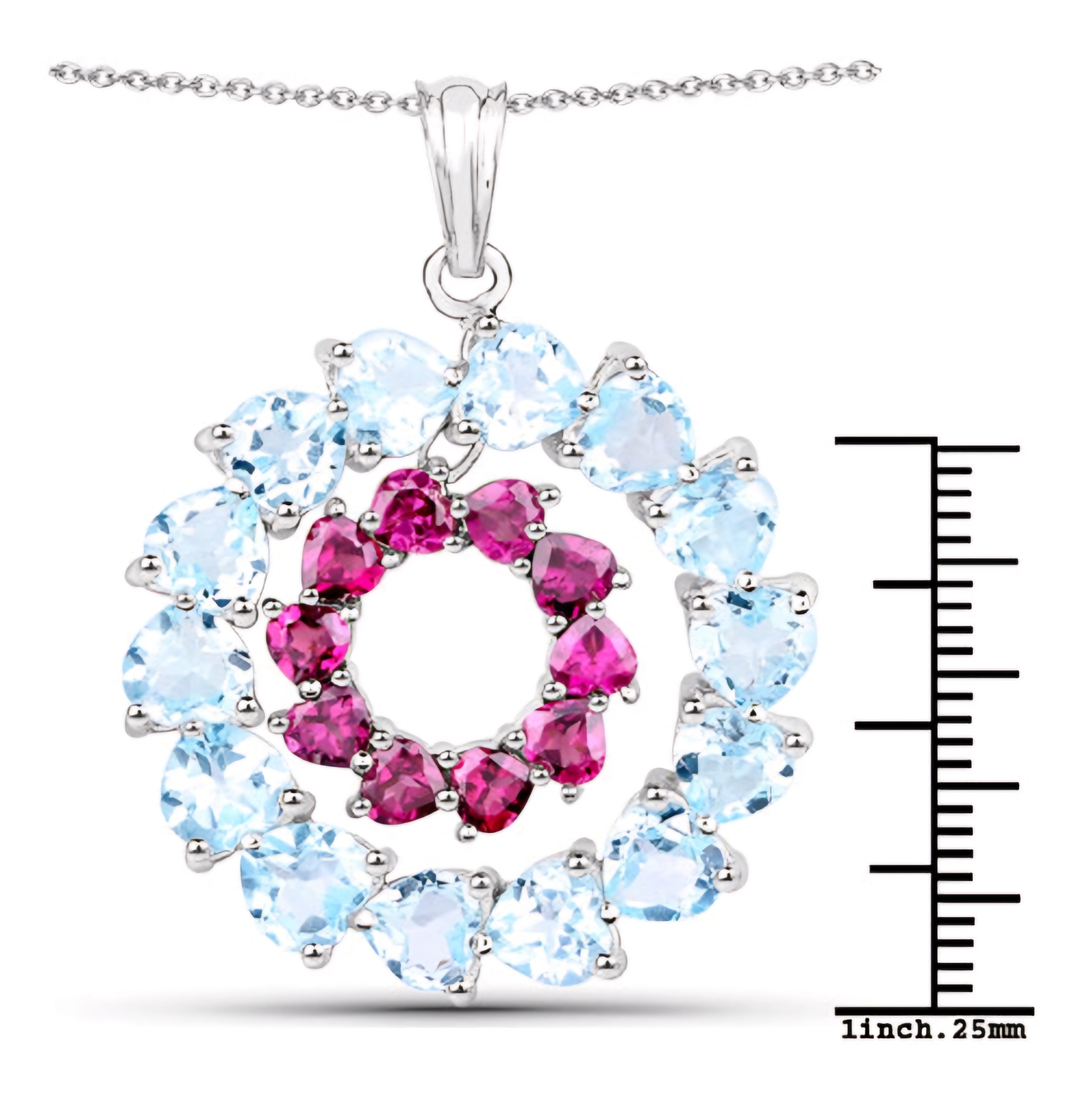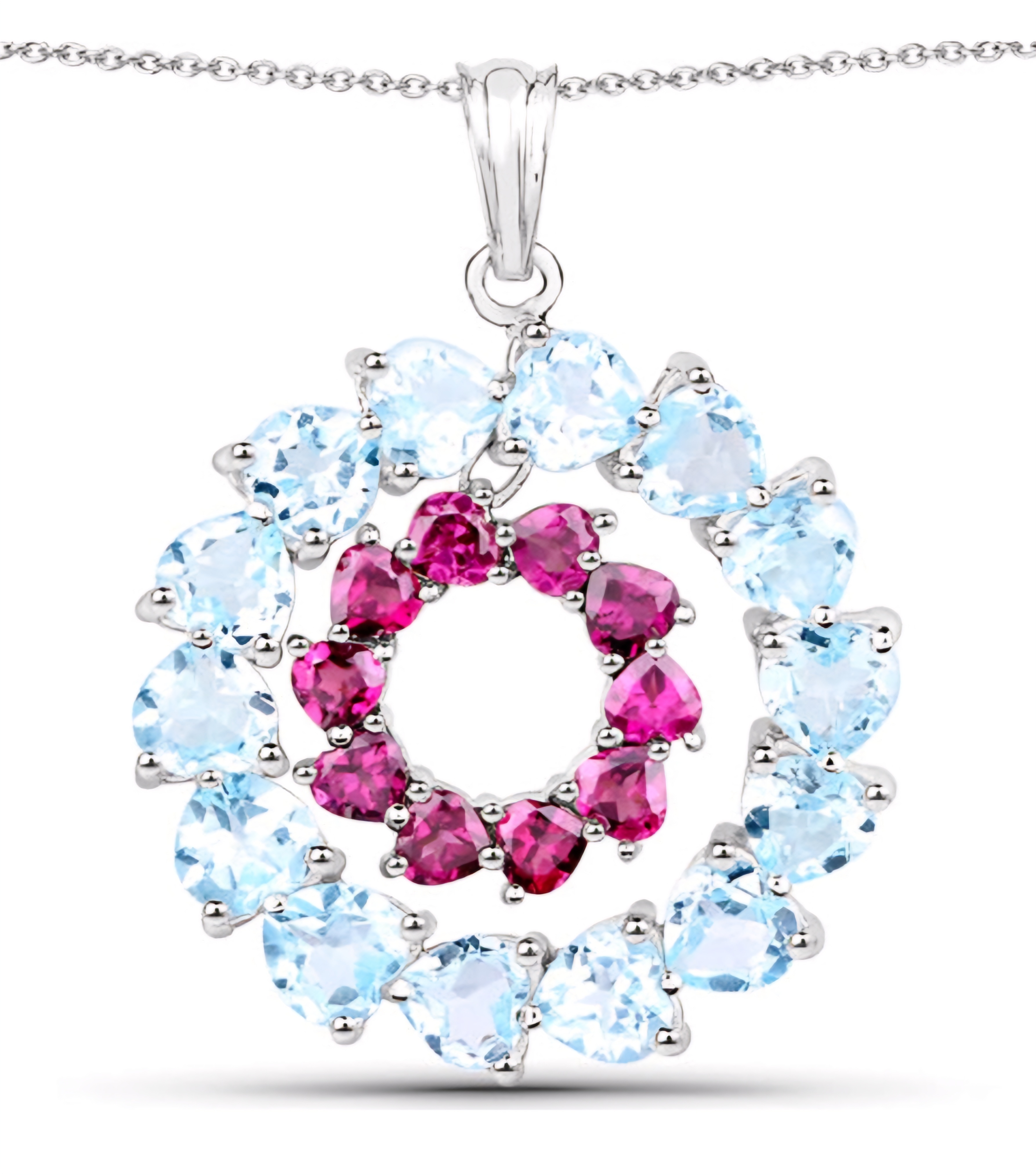 Introducing our exquisitely crafted Sky Blue Topaz & Rhodolite Garnet heart Pendant Necklace, an unrivaled blend of elegance and opulence. Encased in a lustrous Rhodium over Sterling Silver setting, this necklace features a heavenly 14.00ctw of radiant Sky Blue Topaz and dazzling Rhodolite Garnet gemstones. Indulge in the celestial beauty of this statement piece, perfectly designed to elevate any ensemble with its divine allure.