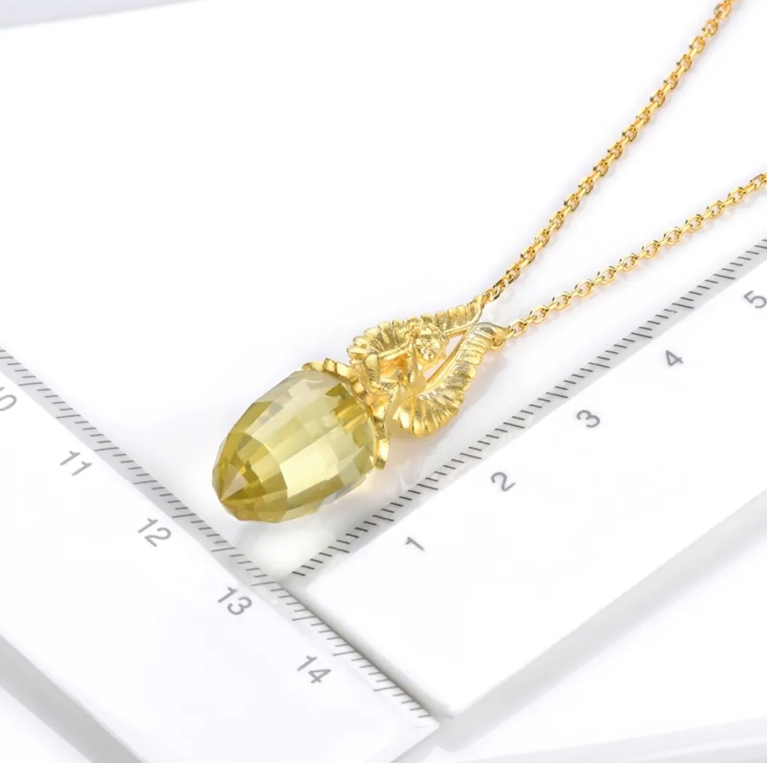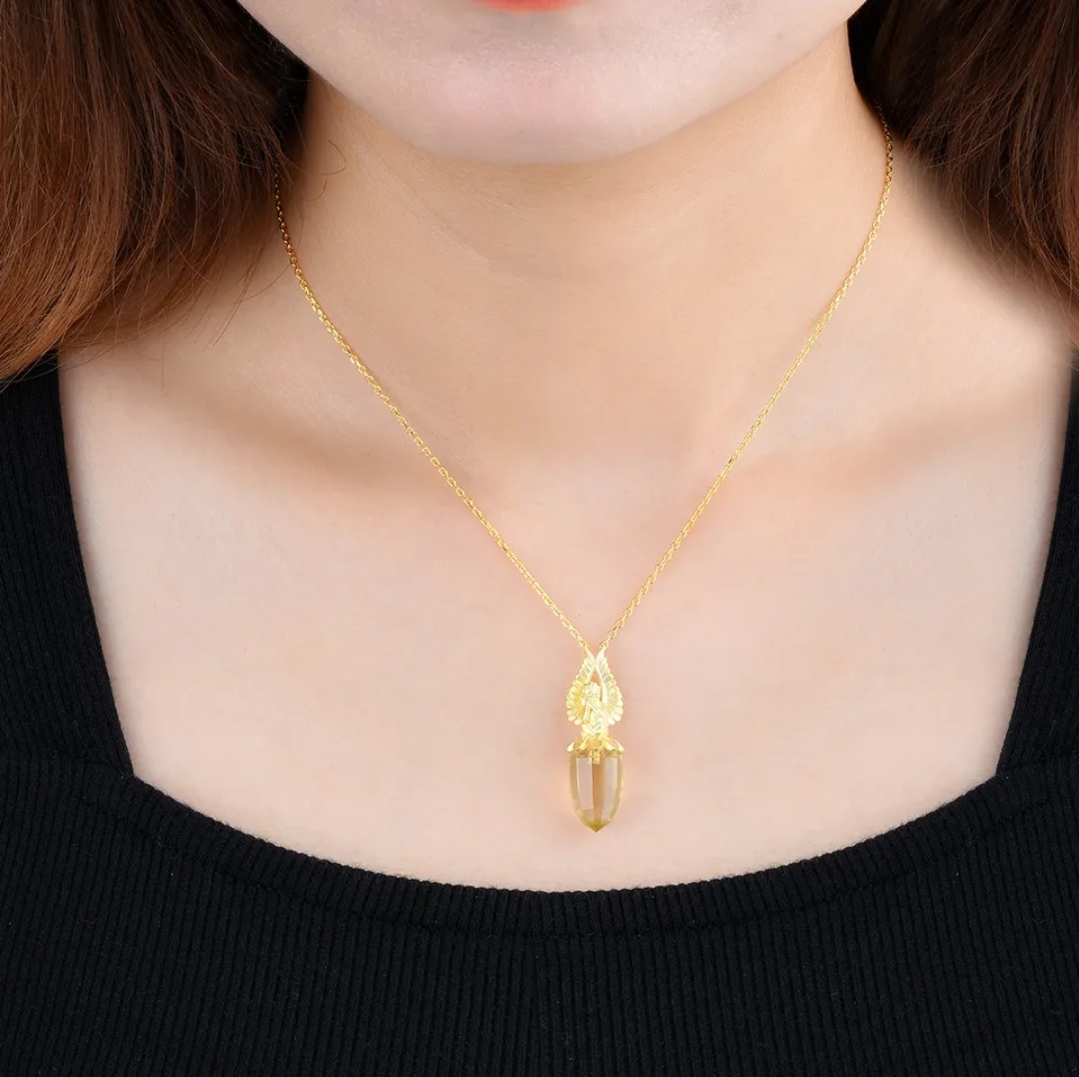 Make a grand statement with our Lemon Quartz Briolette Angel Pendant Necklace in 18k Yellow Gold over Sterling Silver. Designed for the fashion-forward woman who loves to make an entrance, this necklace embodies the perfect blend of glamour and sophistication. The pendant features a mesmerizing lemon quartz briolette, suspended beautifully from an exquisite angel motif. The necklace is crafted from the finest quality 18k yellow gold over sterling silver, ensuring a long-lasting, luxurious finish. Take your look from ordinary to extraordinary with this angelic pendant necklace that will add a touch of elegance to any outfit.