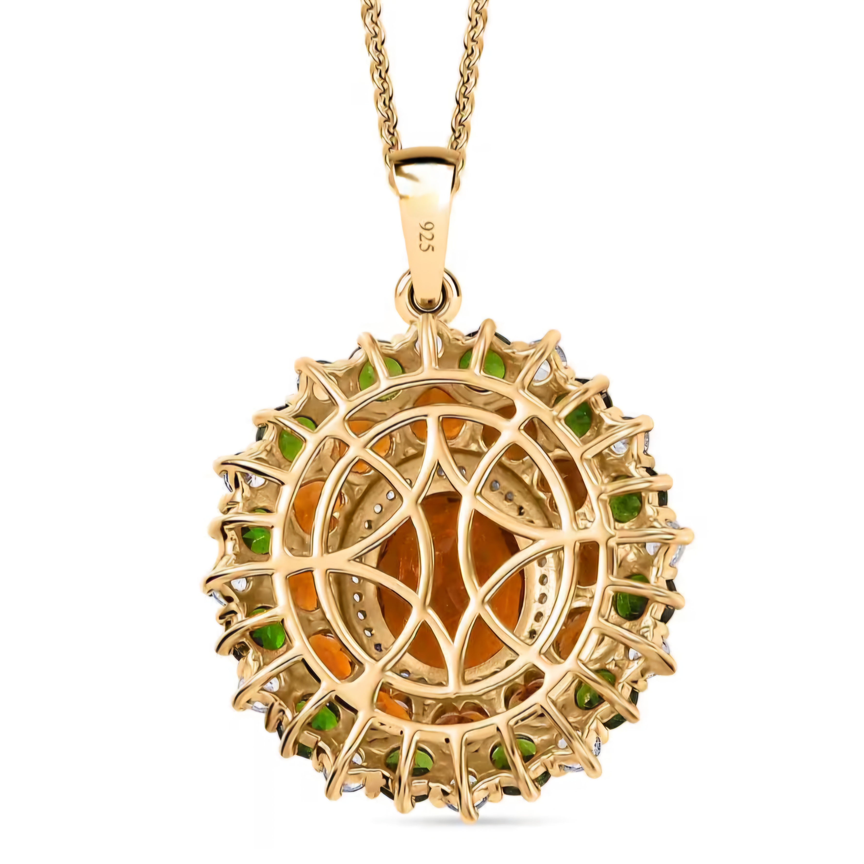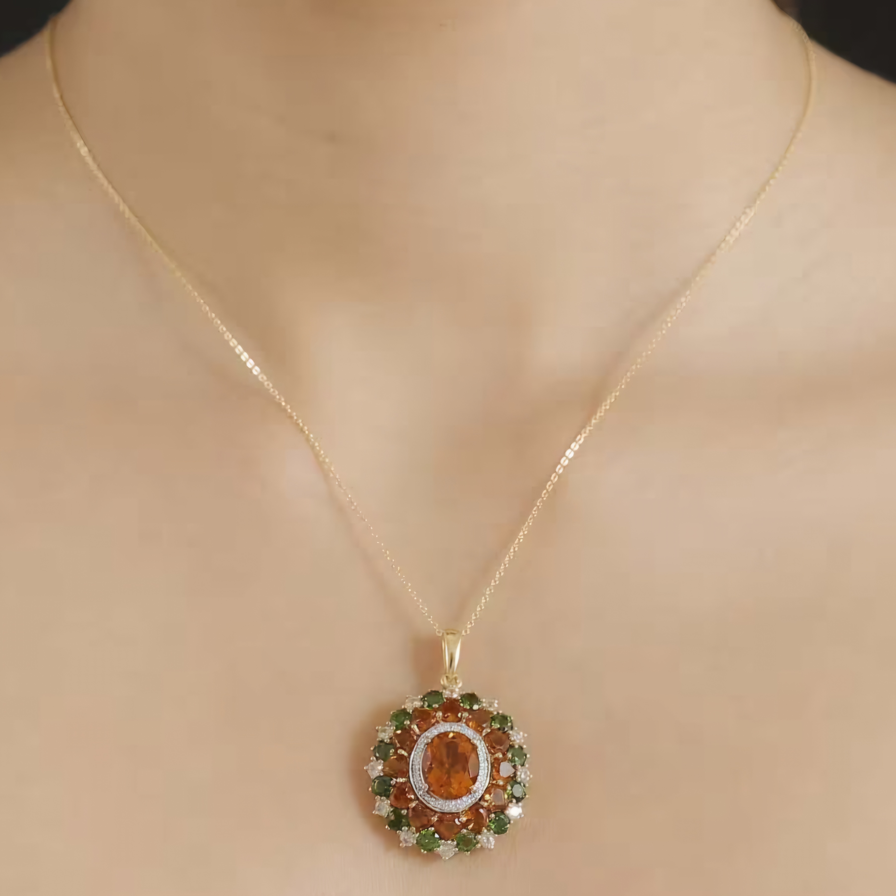Elevate your look with this exquisite pendant necklace featuring a stunning combination of oval and heart-shaped Madeira Citrine, round cut Chrome Diopside, and Zircon set in 18K yellow gold over sterling silver. With a total carat weight of 9.85ctw, this luxurious piece exudes elegance and sophistication. Treat yourself to the ultimate accessory that will surely turn heads wherever you go.