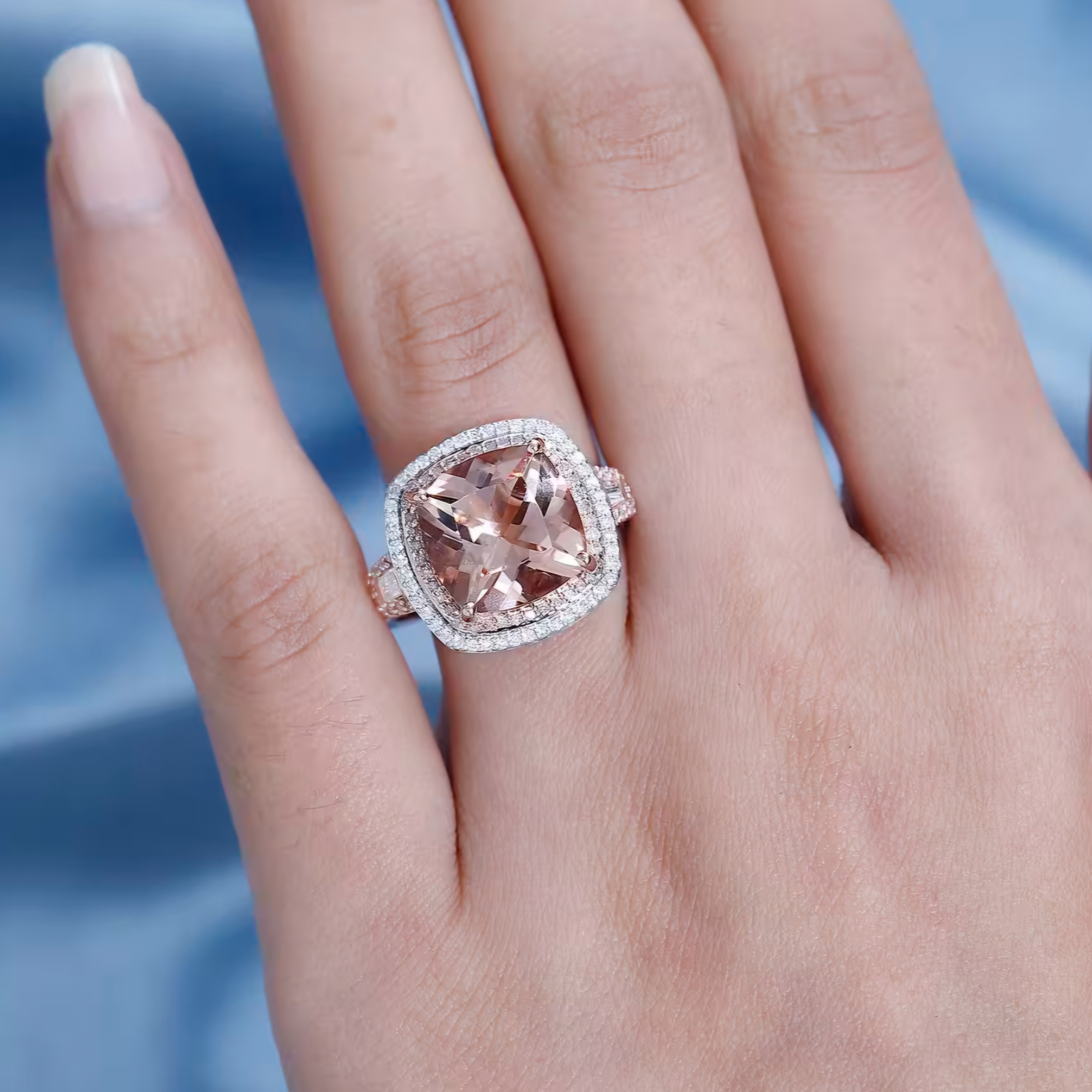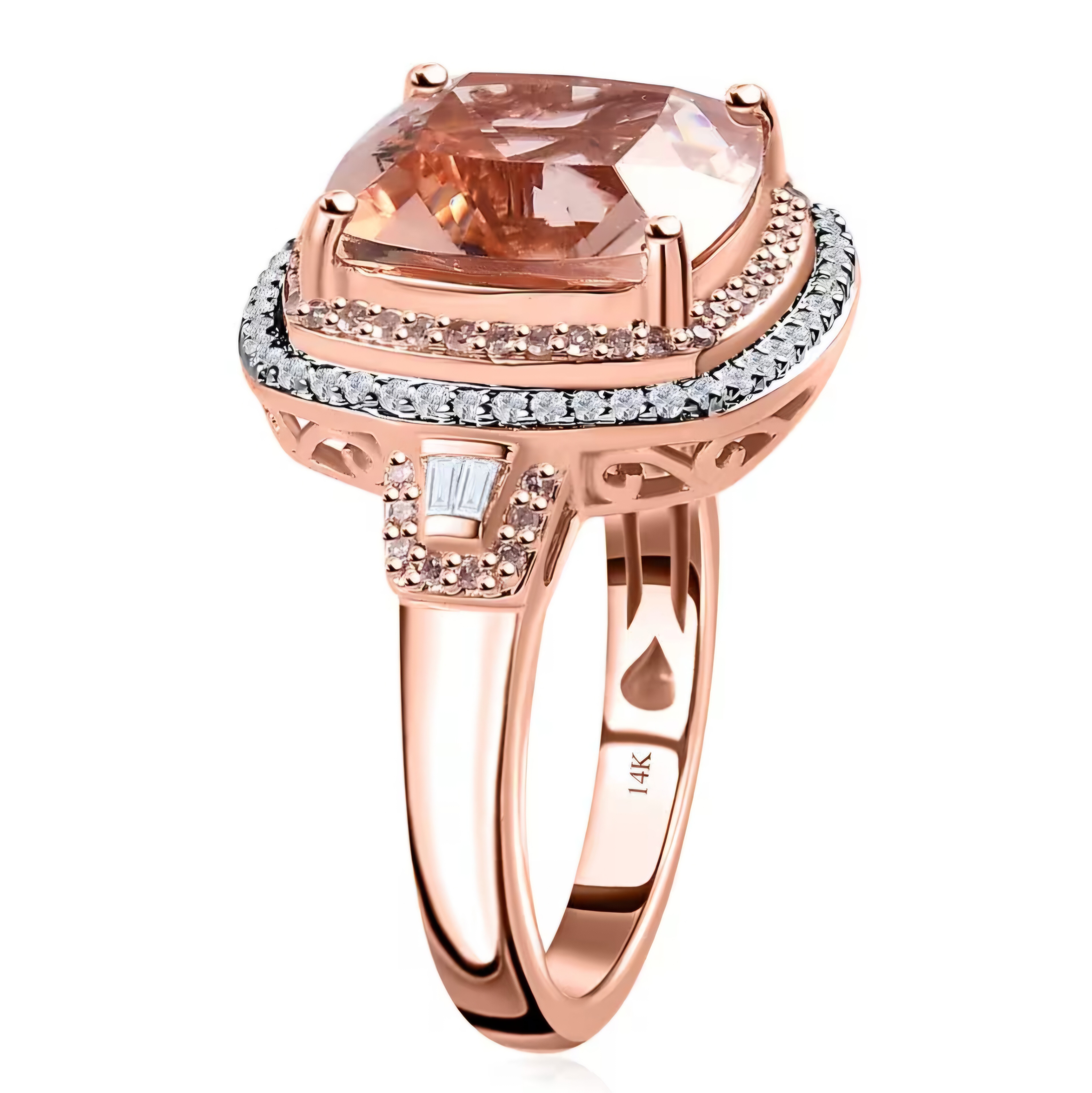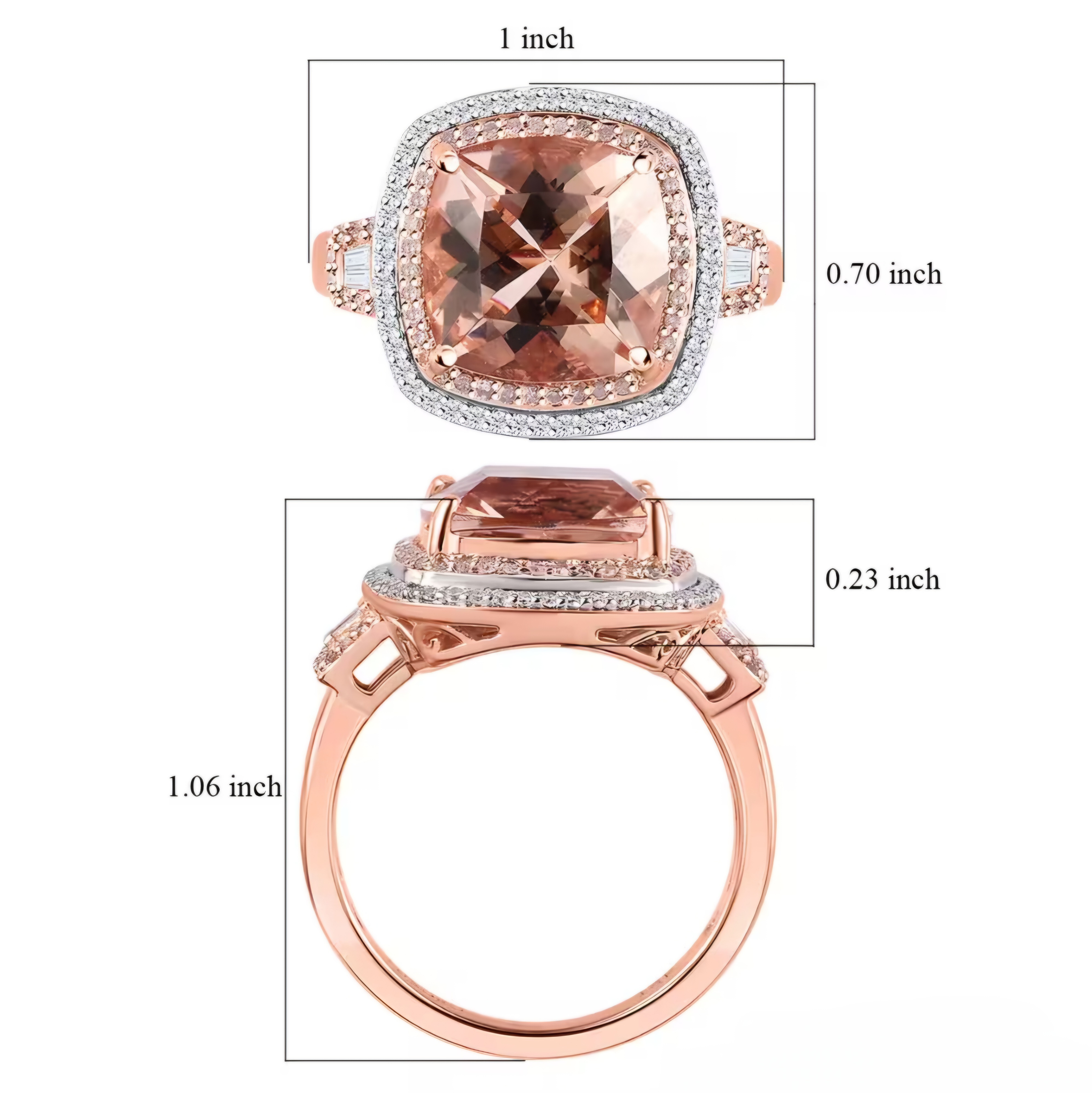 Elevate your jewelry collection with this stunning Morganite, Pink/White Diamond Halo Ring In 14K Rose Gold 6.85ctw. The mesmerizing pink morganite gemstone is surrounded by a halo of sparkling pink and white diamonds, creating a truly magnificent piece. Crafted in lustrous 14K rose gold, this ring exudes elegance and sophistication. Whether worn for a special occasion or as an everyday statement piece, this ring is sure to turn heads and elevate any outfit.