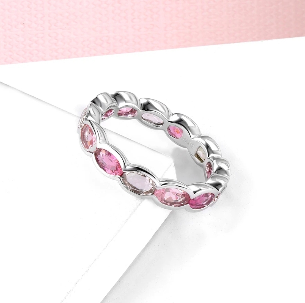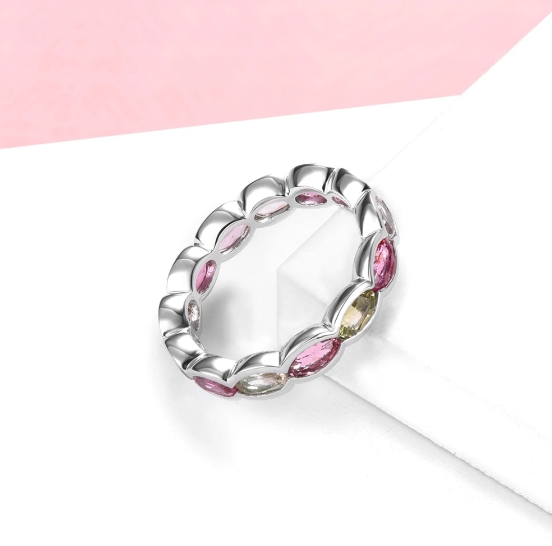 This durable and elegant eternity band ring features natural Multi Color Tourmaline 5×3mm ovals that are bezel set 3.00ctw. Crafted in solid 925 Sterling Silver with your choice in Rhodium over, 18K Yellow Gold over or 18K Rose Gold over 3.00g.