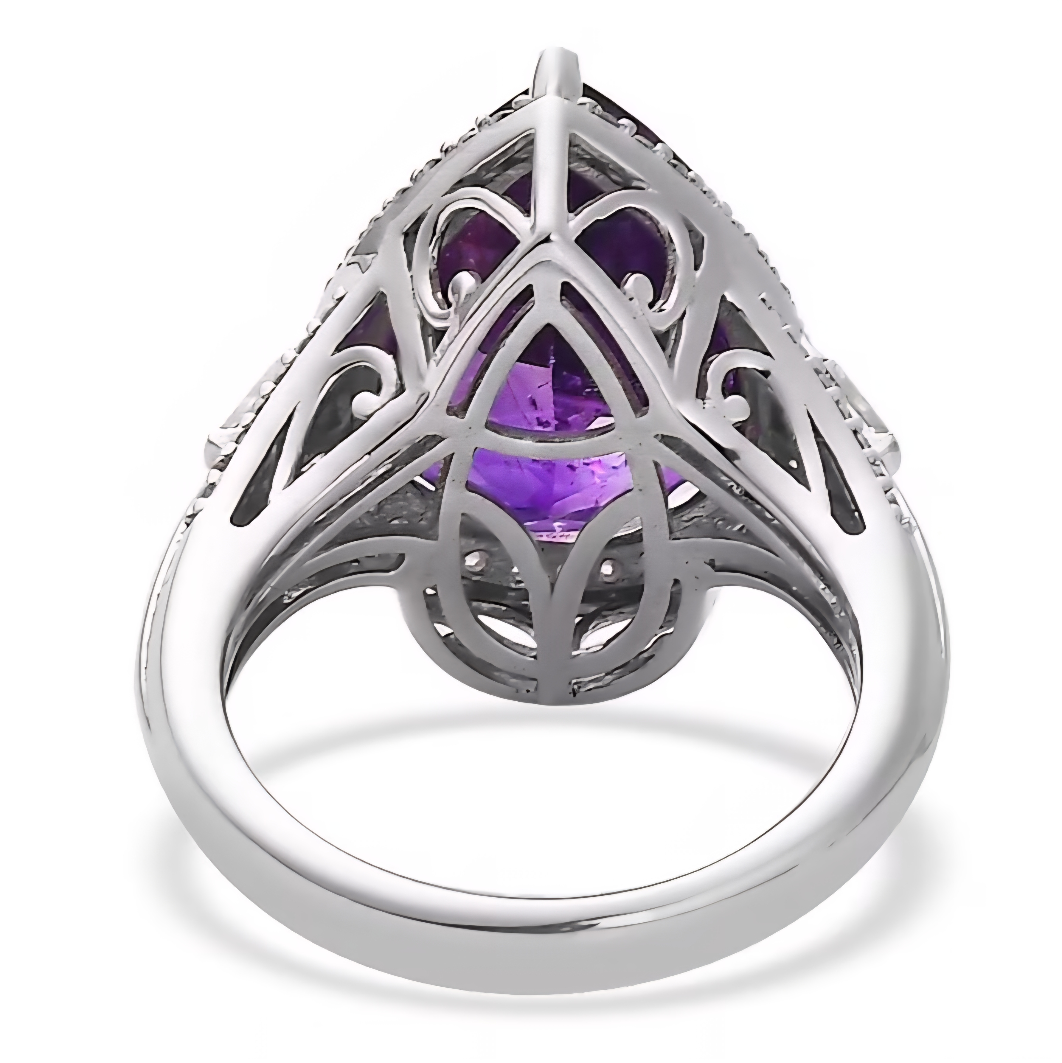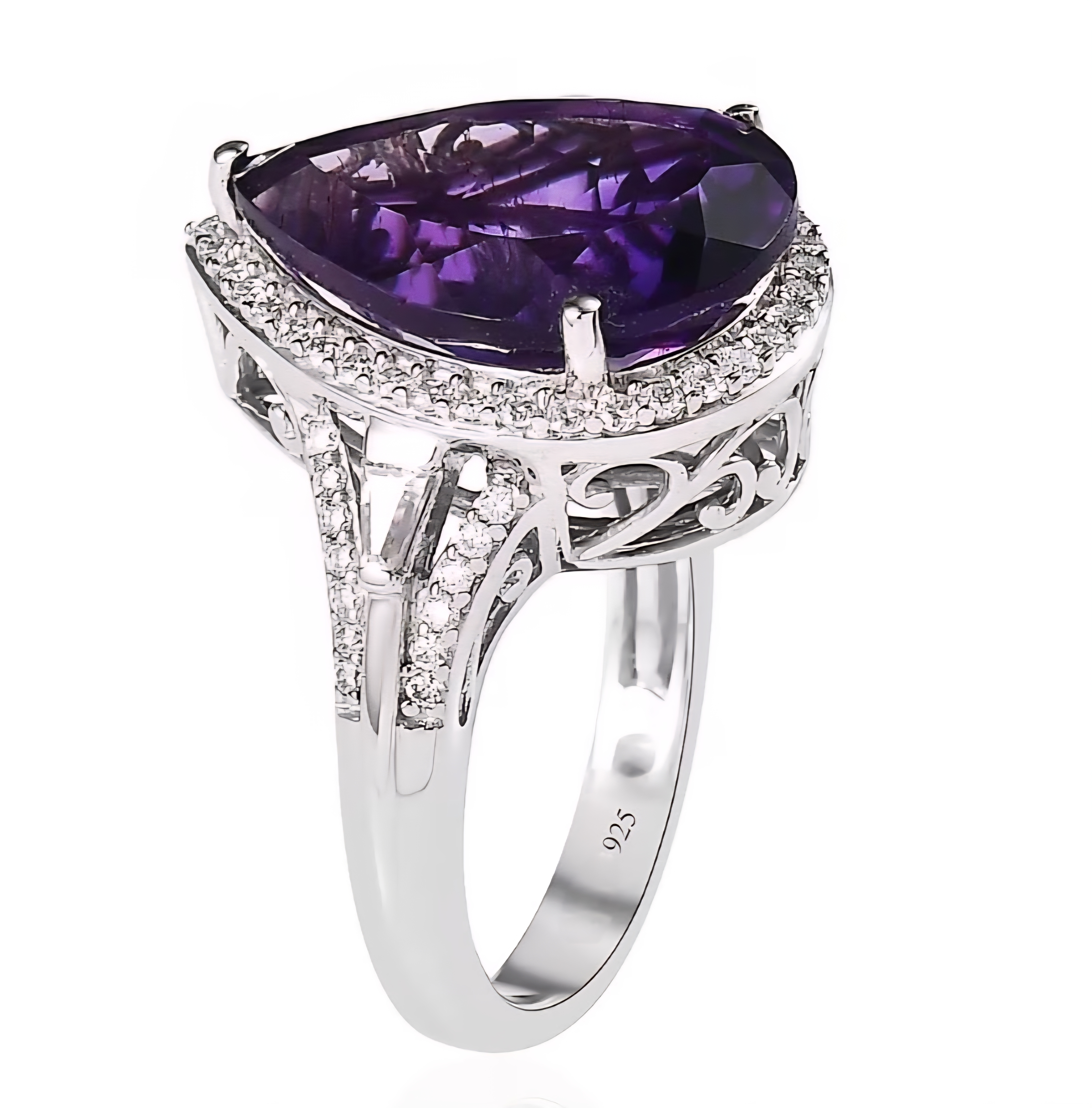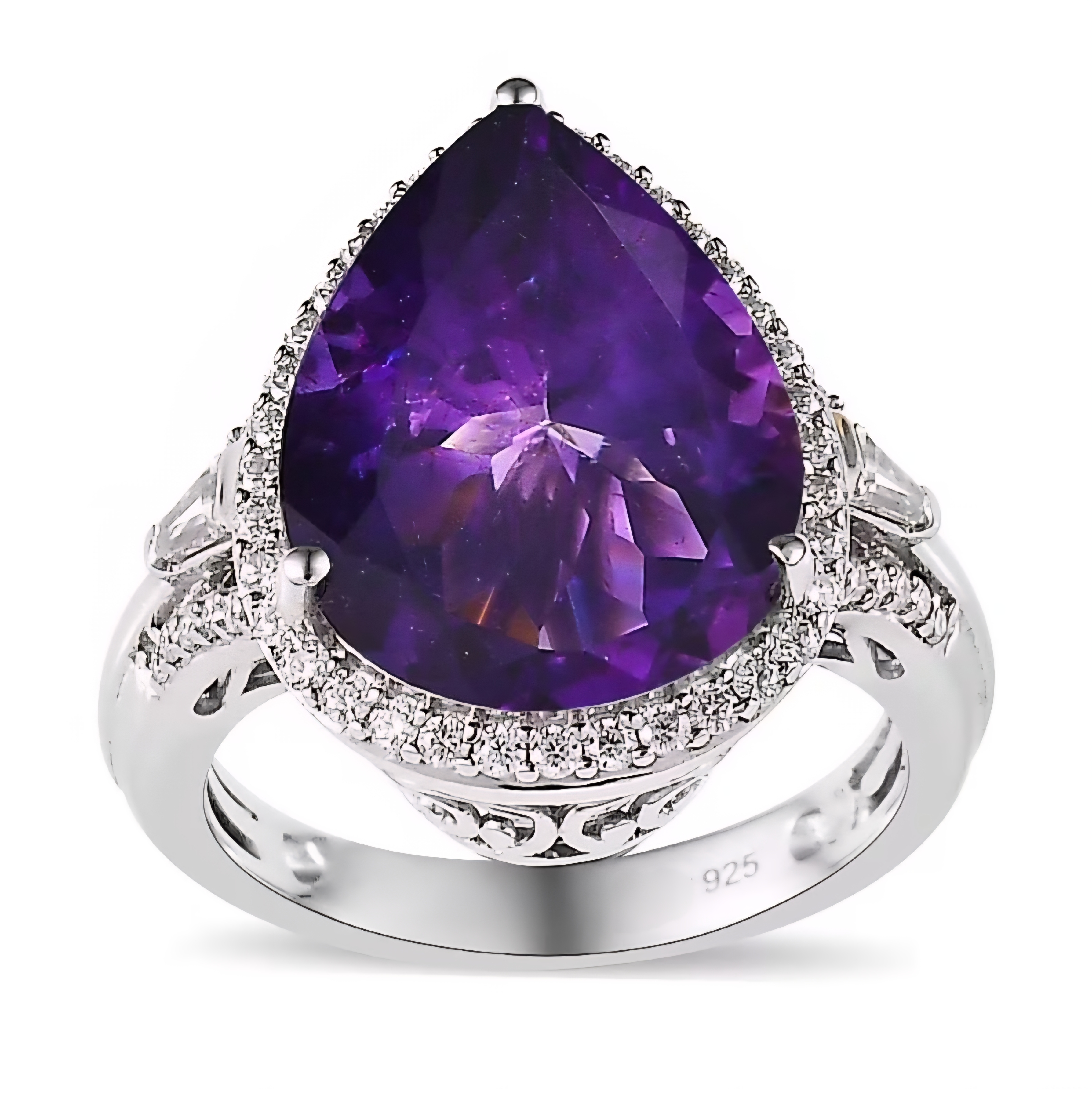 This elegant halo ring features a richly colored pear shaped amethyst as the focal point, framed by a bright halo of colorless moissanite for added sparkle and dimension. Tapered baguette moissanites accent the sides, giving the design a refined silhouette with a clean, structured look. Crafted in solid 925 sterling silver and finished in rhodium plating, this piece delivers a bold gemstone presence with a crisp white metal finish that enhances the amethyst’s deep purple color.
