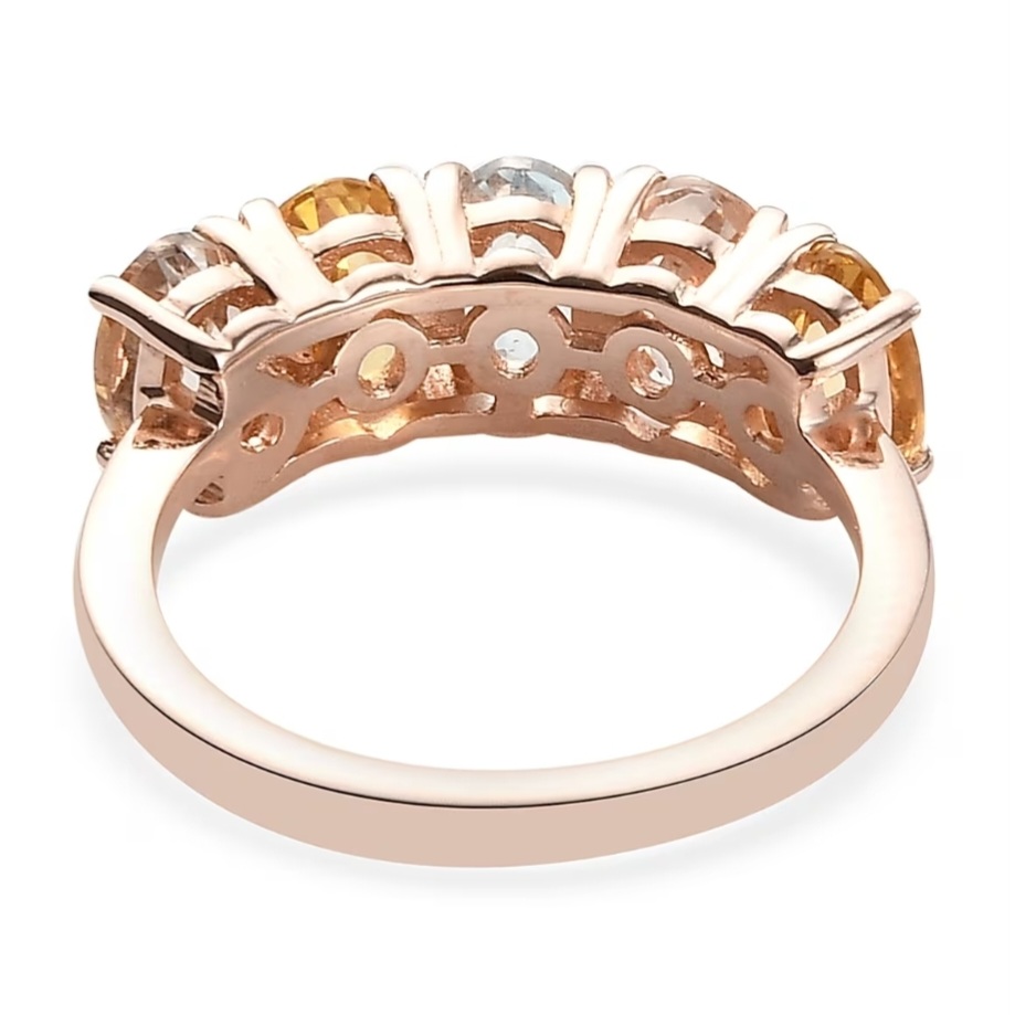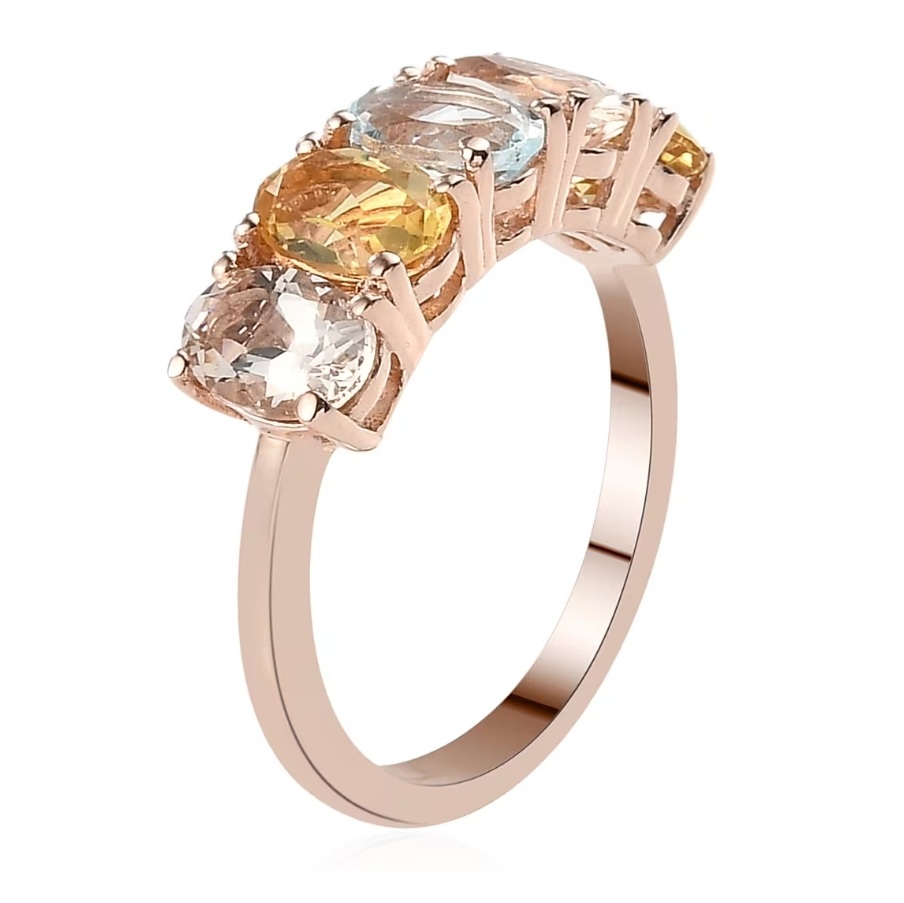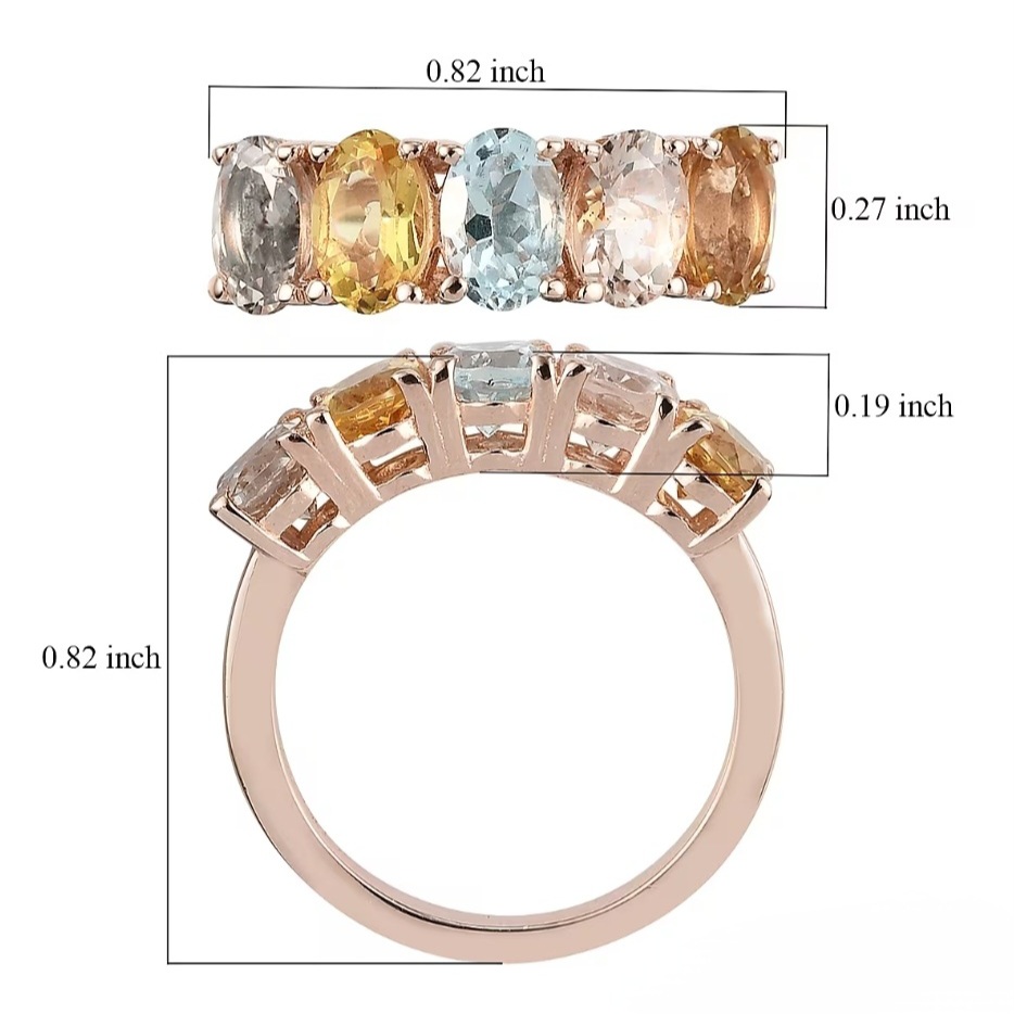 The stones are set in a smooth, low-profile layout that keeps the ring wearable and refined, making it well suited as a stackable piece or a subtle standalone statement. Finished in 18k rose gold vermeil over sterling silver, the warm metal tone complements the pastel beryl colors and ties the composition together cleanly.