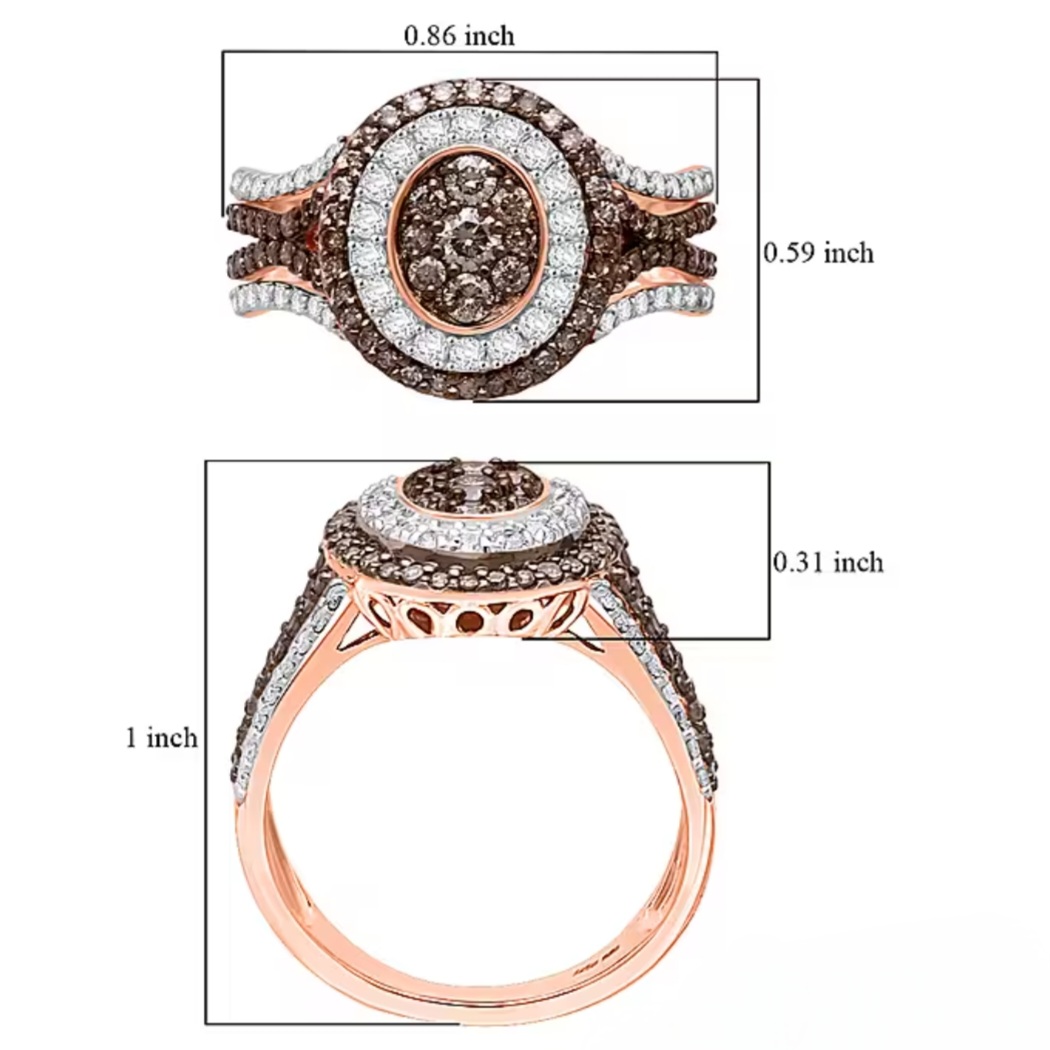This diamond cluster halo ring features rich brown diamonds set at the center, creating a deep, smoky brilliance that feels bold and grounded. A surrounding halo of white diamonds adds contrast and lift, sharpening the profile and amplifying the overall sparkle without overpowering the center cluster.