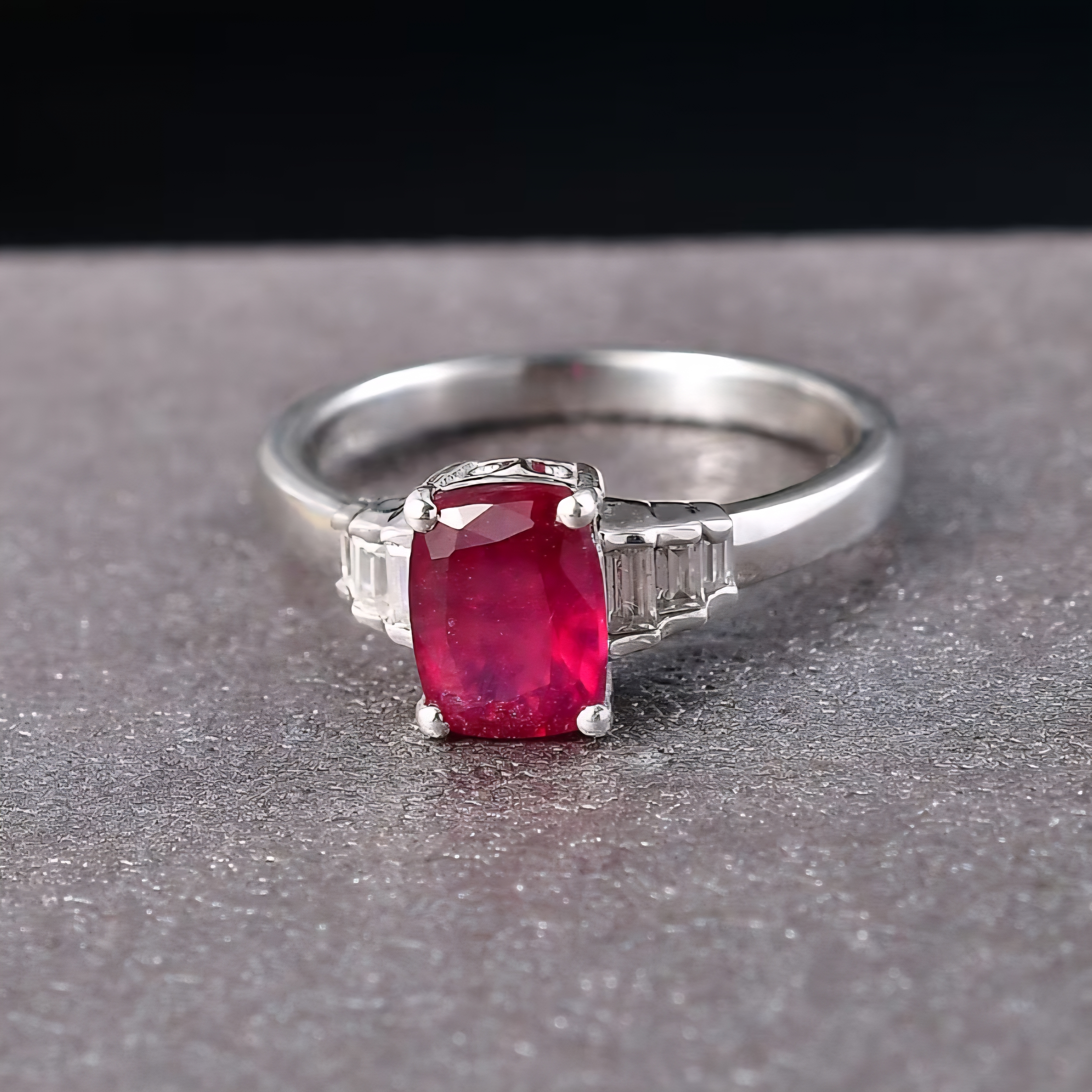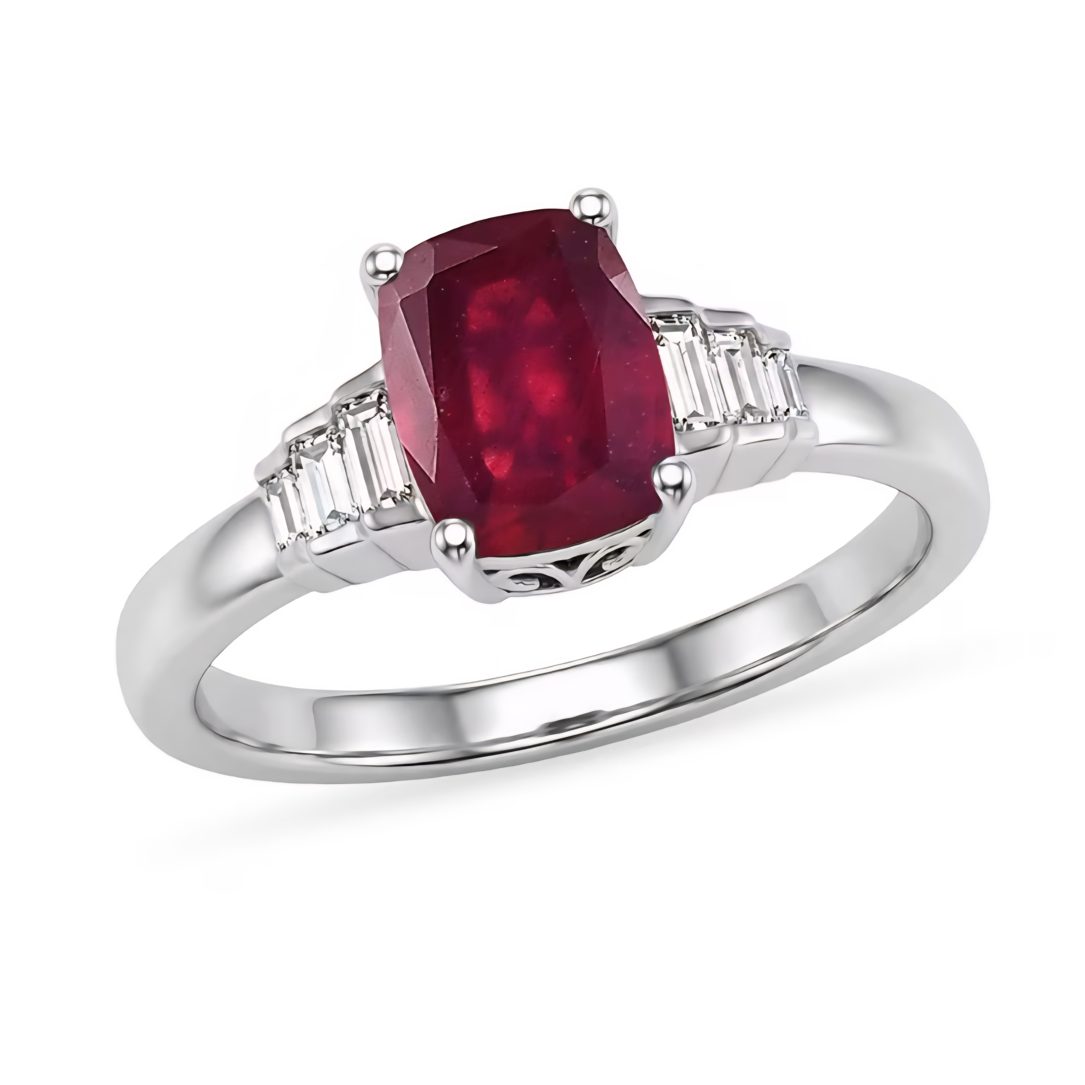 A vivid cushion-cut ruby takes command at the center of this refined, architectural ring. The 8×6mm ruby delivers saturated red color with strong depth, flanked by clean baguette-cut moissanite accents that add structure and sharp contrast rather than noise.