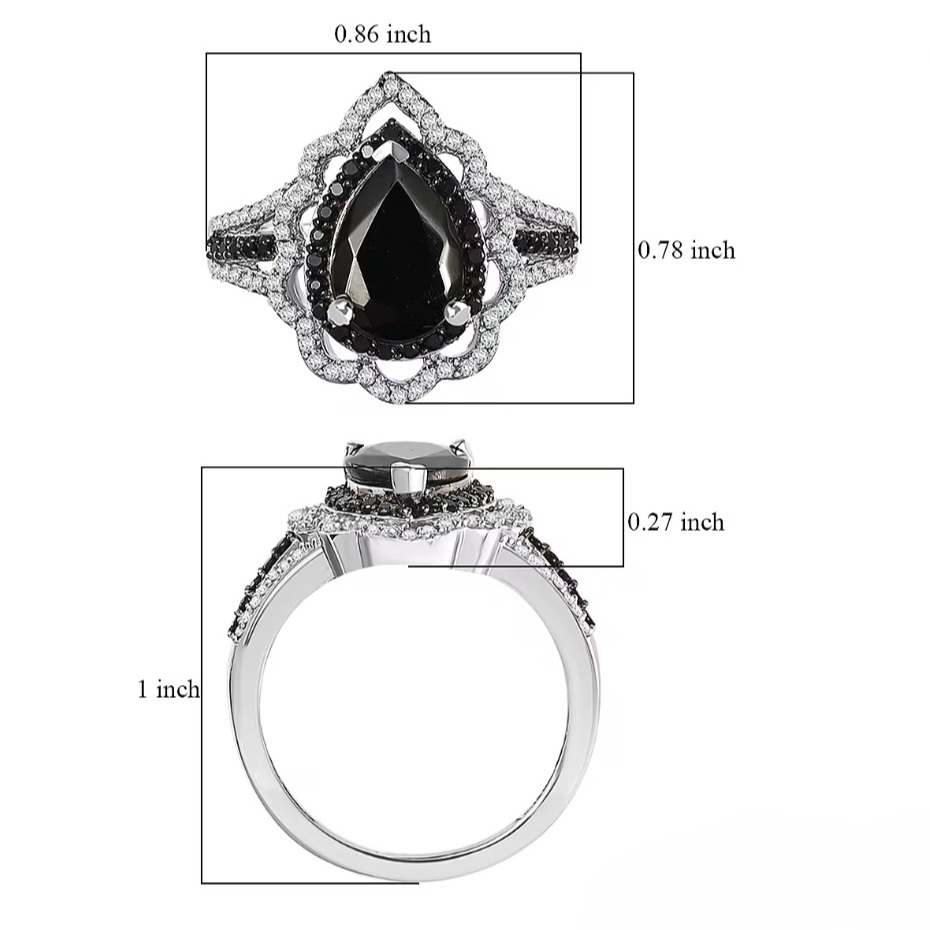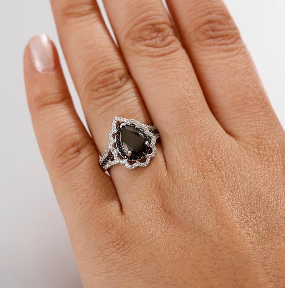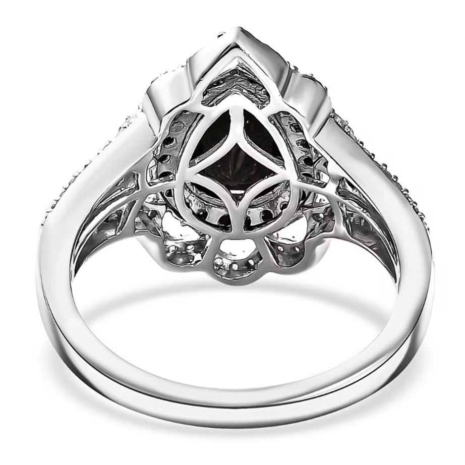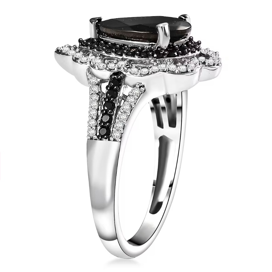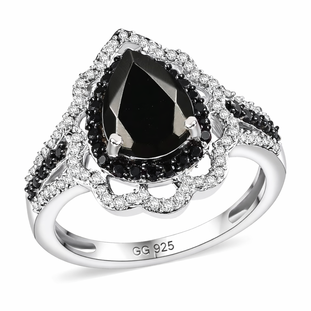 A double halo frame sharpens the silhouette. The inner halo of black Thai spinel (0.40ctw) reinforces the depth of the center stone, while the outer halo of white zircon (0.37ctw) introduces contrast and precision brilliance around the perimeter. The bright white zircon creates the visual separation that makes the black center read even stronger.