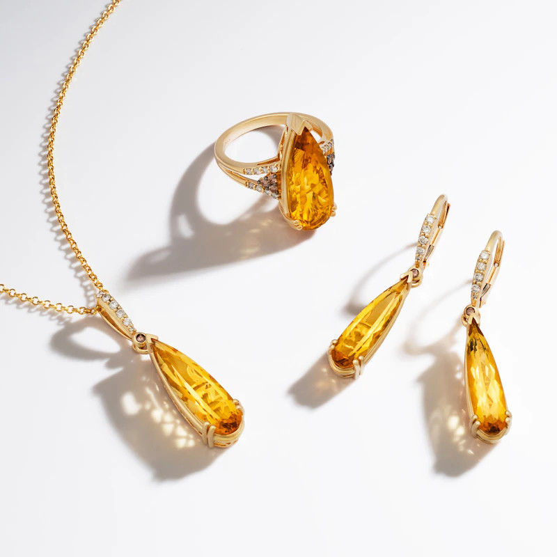 This bold design showcases an elongated pear-shaped citrine set vertically for maximum drama. The golden stone is flanked by diamond accents in a split-shank arrangement, with clusters of rich brown diamonds adding warmth against bright white diamonds. Finished in solid 14K yellow gold with touches of black rhodium, the ring balances fiery brilliance with refined contrast, making it a statement piece full of elegance and edge.