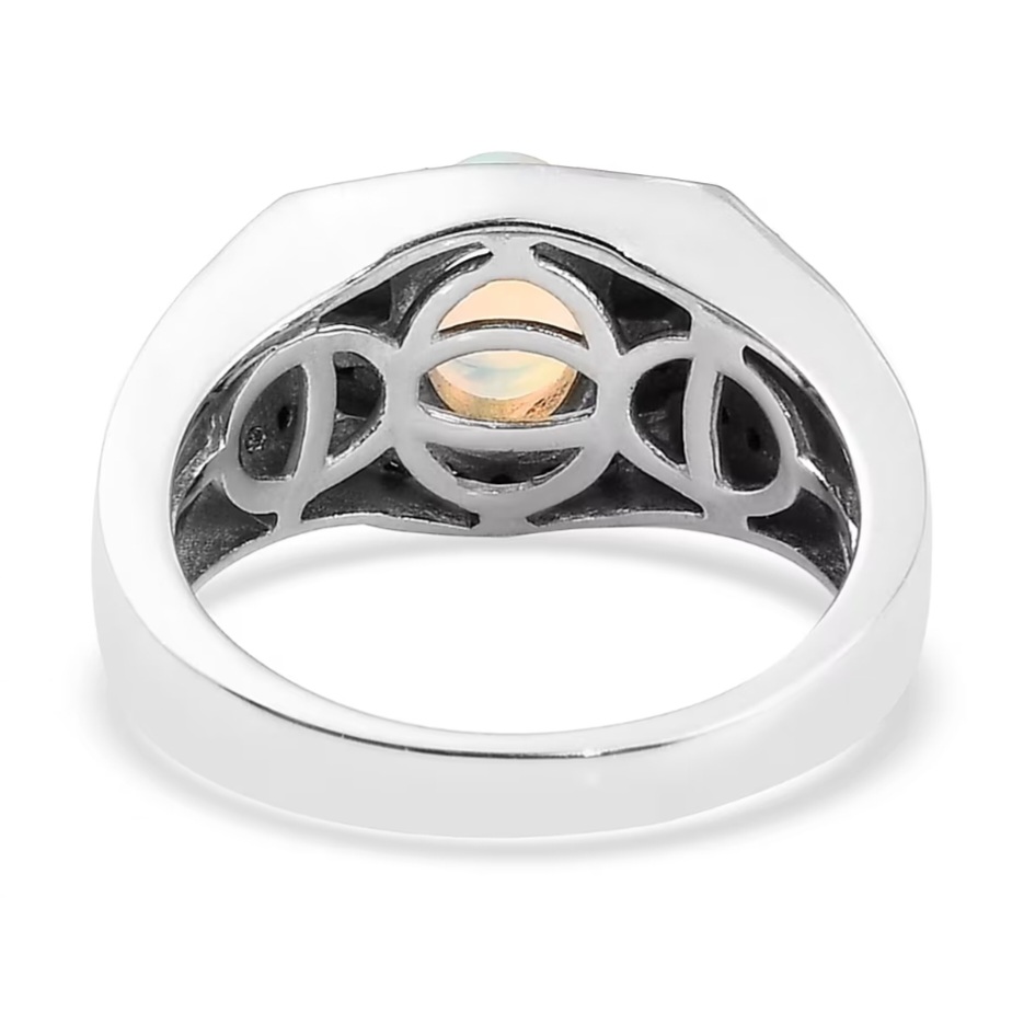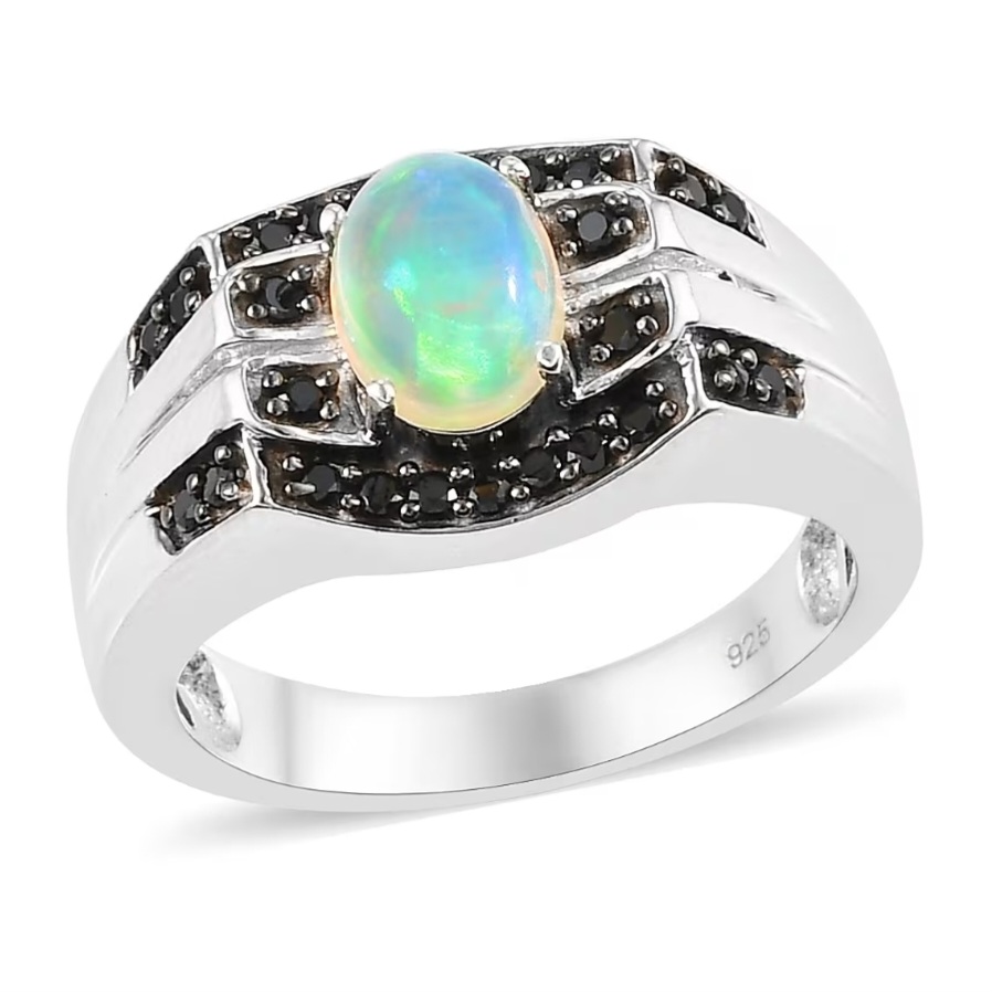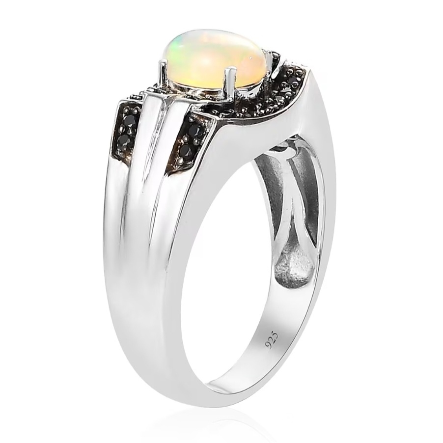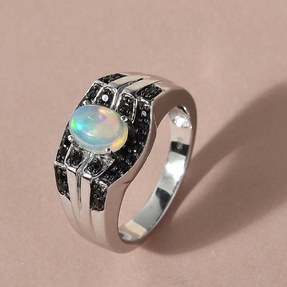 Black spinel accents are worked into the design to add structure and edge. Their dark tone frames the center stone and reinforces the ring’s masculine character, creating a deliberate contrast that keeps the opal grounded. Subtle black rhodium detailing on the spinel settings deepens this effect, adding shadow and definition without overwhelming the design.