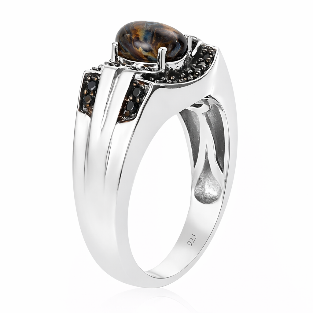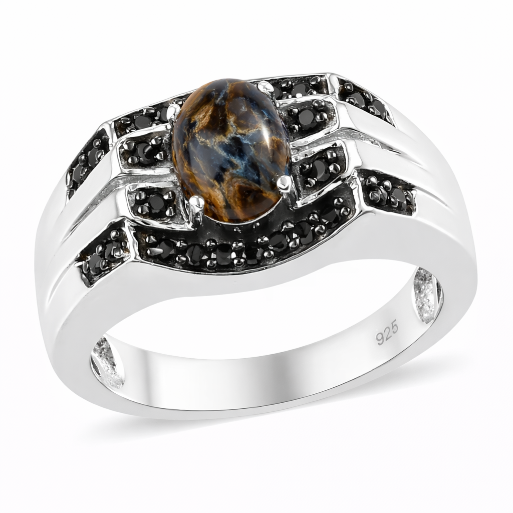 This design is also offered with a pietersite center stone, bringing a darker, storm-like character to the same bold setting — ideal for those drawn to pattern and depth over light play.