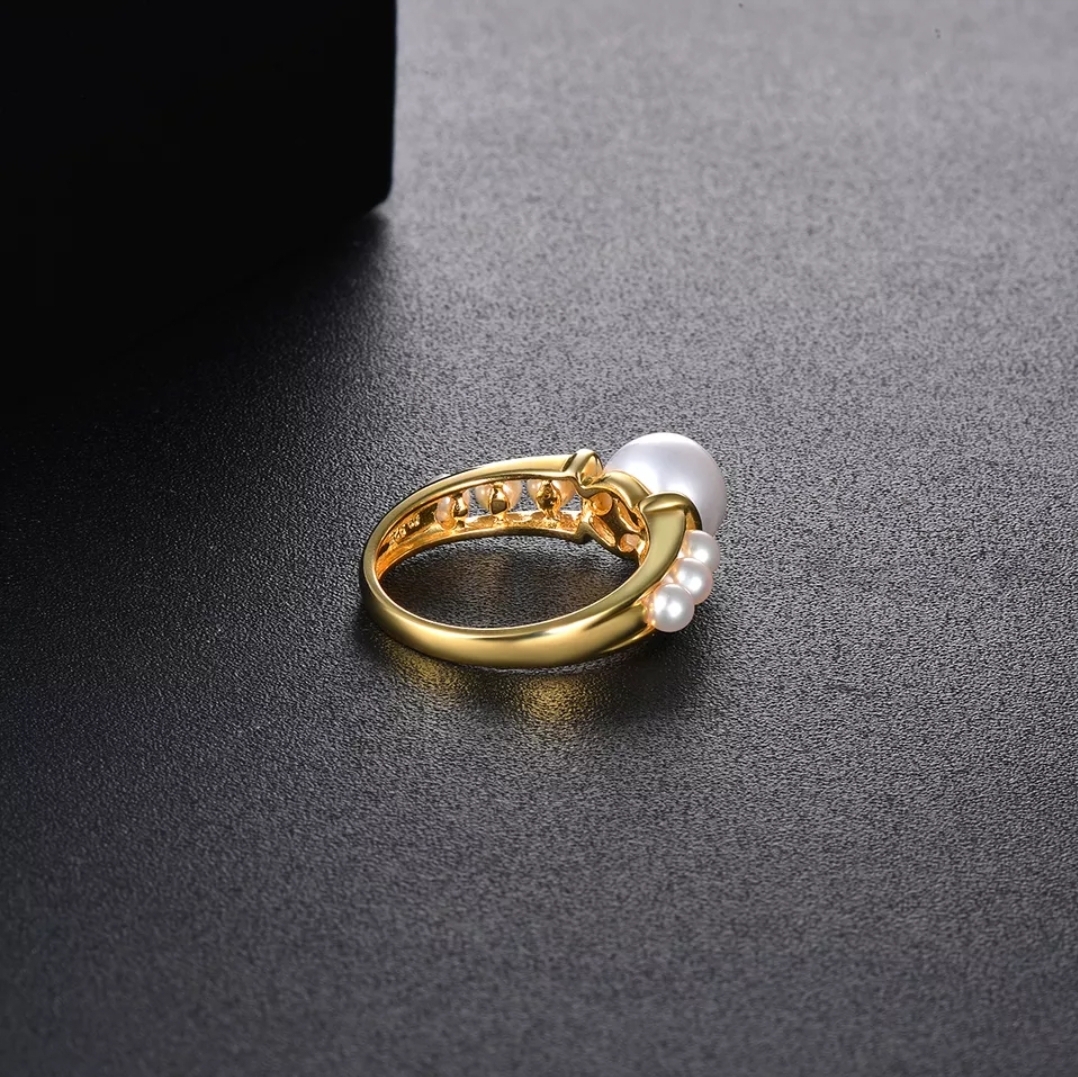 Pearl lovers this luxurious ring is for you. Hosted center stage is a large high-quality 9mm round White Freshwater Pearl. Three, 3-4mm's run down the sides of the shank all set in a luscious amount of 18K Vermeil Yellow Gold over solid 925 Sterling Silver.