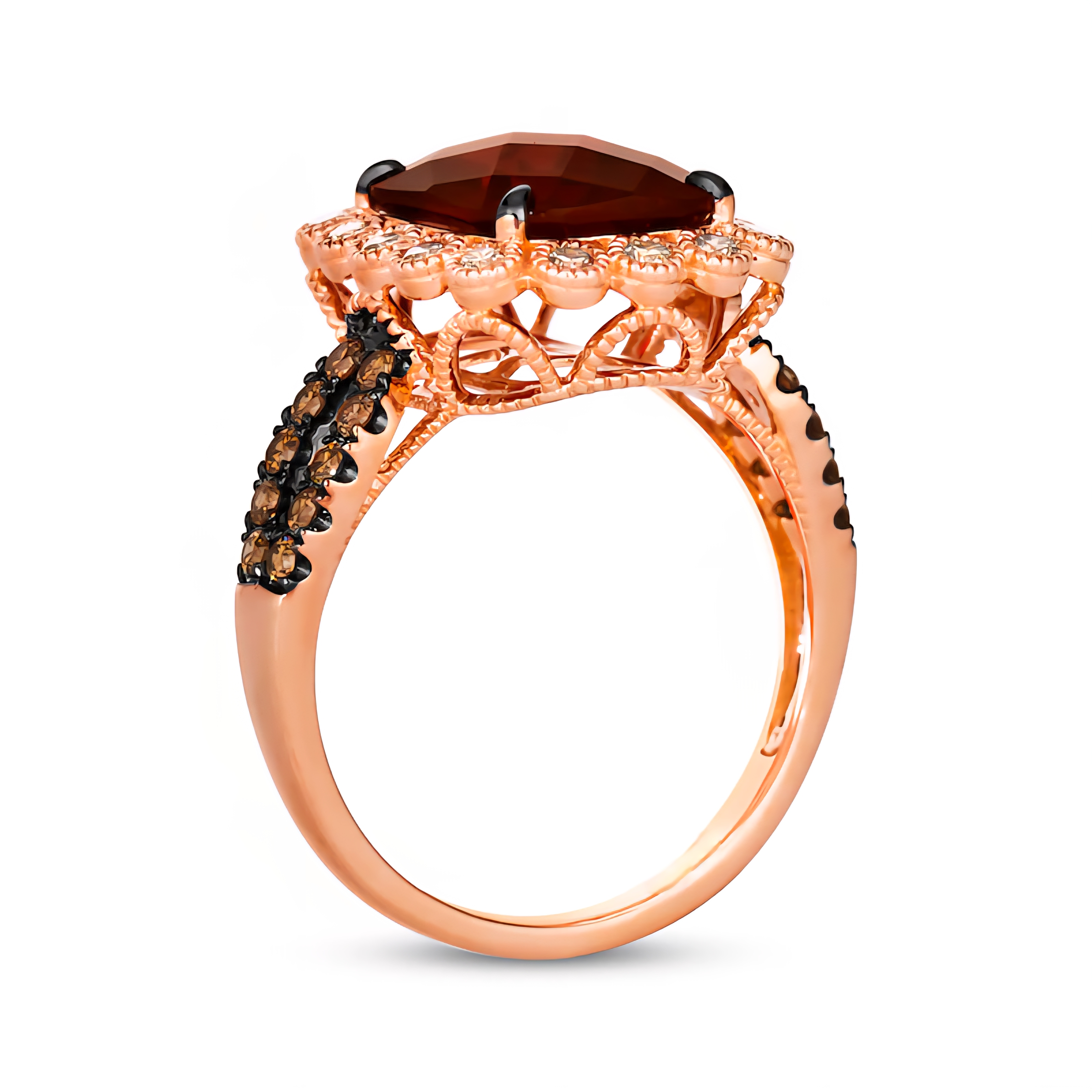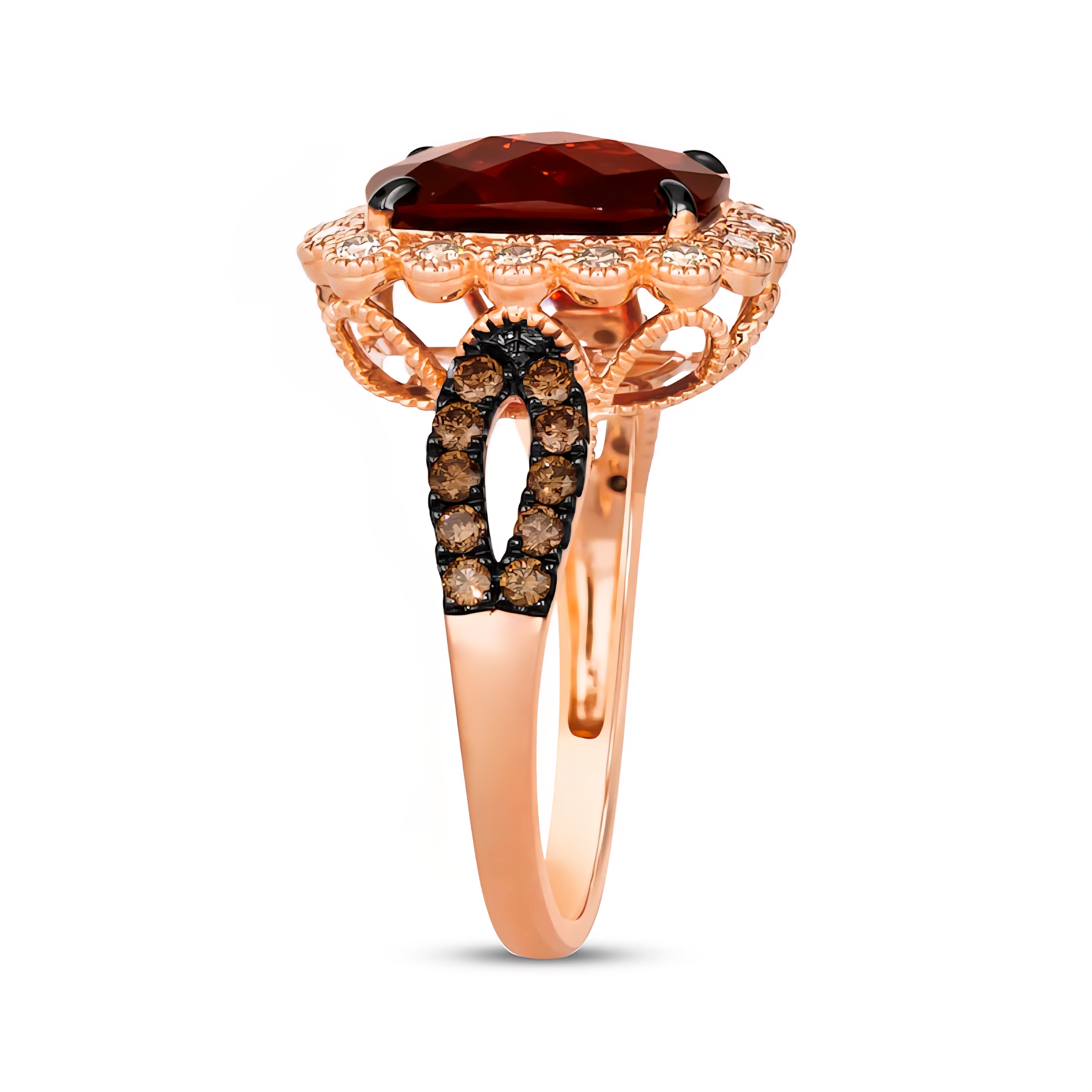 This bold fashion ring centers on a checkerboard cushion-cut garnet that commands attention with its deep red glow. A halo of round white diamonds adds brilliance, while twin split shanks shimmer with brown diamond accents framed in black rhodium. Crafted in solid 14K rose gold, the design balances richness, contrast, and timeless elegance—making it a standout piece for any collection.