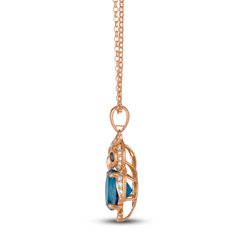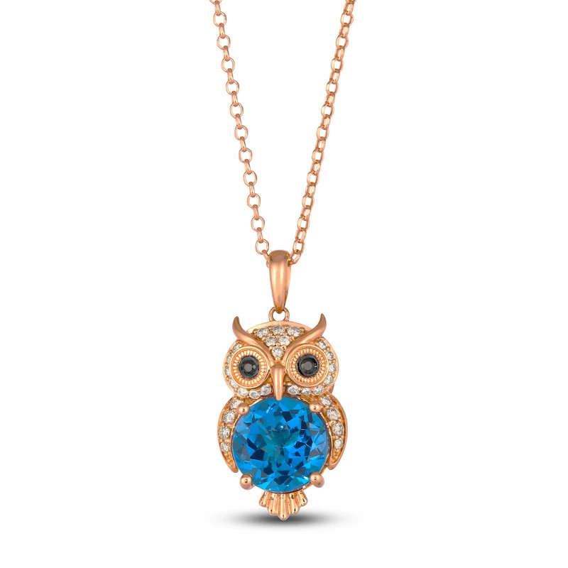 Playful yet luxurious, this owl pendant showcases a bold London Blue Topaz as its centerpiece, symbolizing wisdom and mystery. Champagne diamonds shimmer along the wings and body, while two black diamond eyes bring the design to life with striking detail. Crafted in solid 14K rose gold and finished with black rhodium, this pendant blends artistry with elegance, making it a meaningful piece that stands out with charm and sophistication.