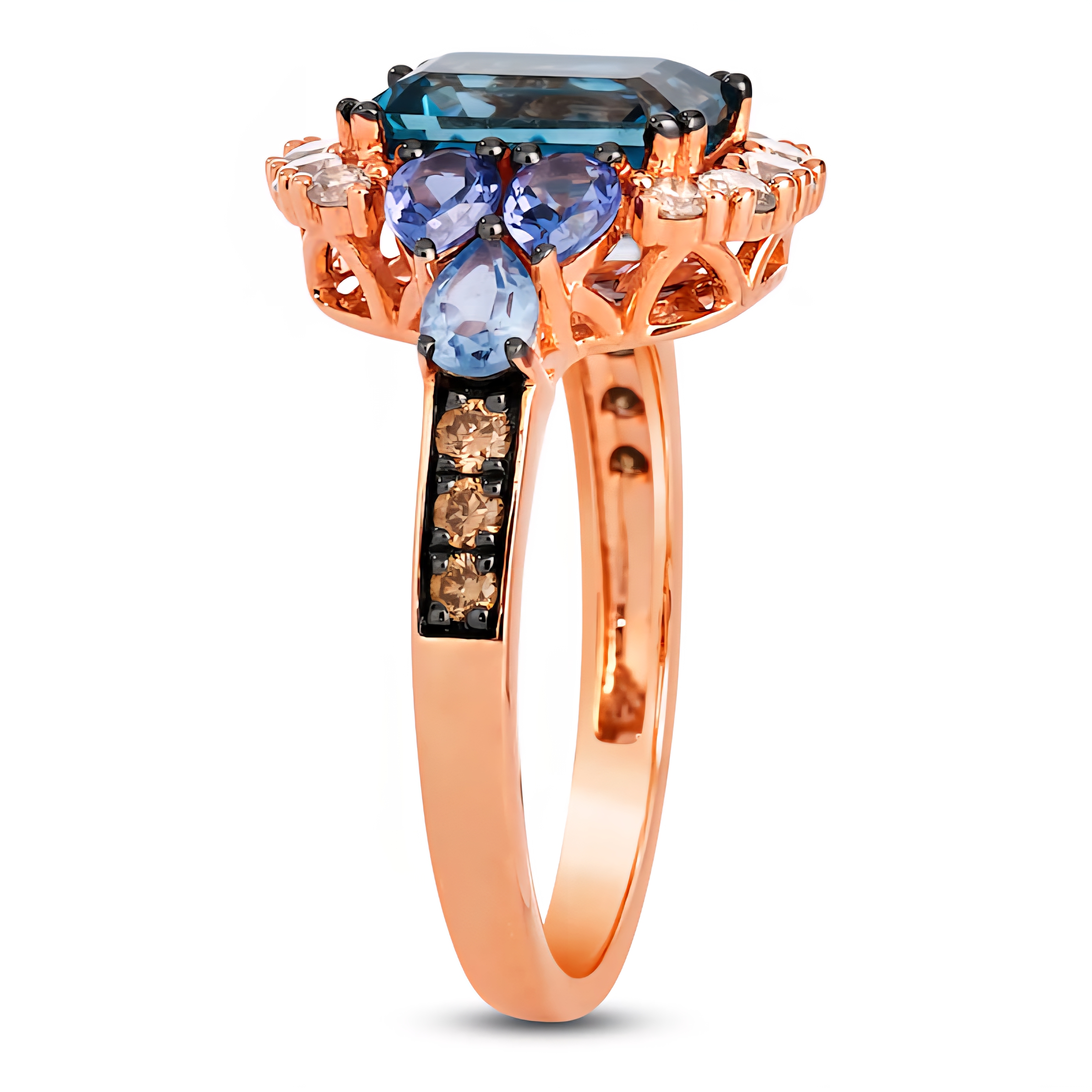 At the heart of this design, a 2.50ct (9×7mm) emerald-cut London Blue Topaz radiates bold ocean-deep color. Pear-cut Tanzanite and Aquamarine stack along the shoulders, shifting from twilight indigo to crystal-clear blue. A halo of white diamonds brings brilliance, while brown diamonds trail the shank with subtle warmth. Crafted in solid 14K Rose Gold with black rhodium accents, this piece is a fearless mix of contrast and elegance — a ring that refuses to be overlooked.