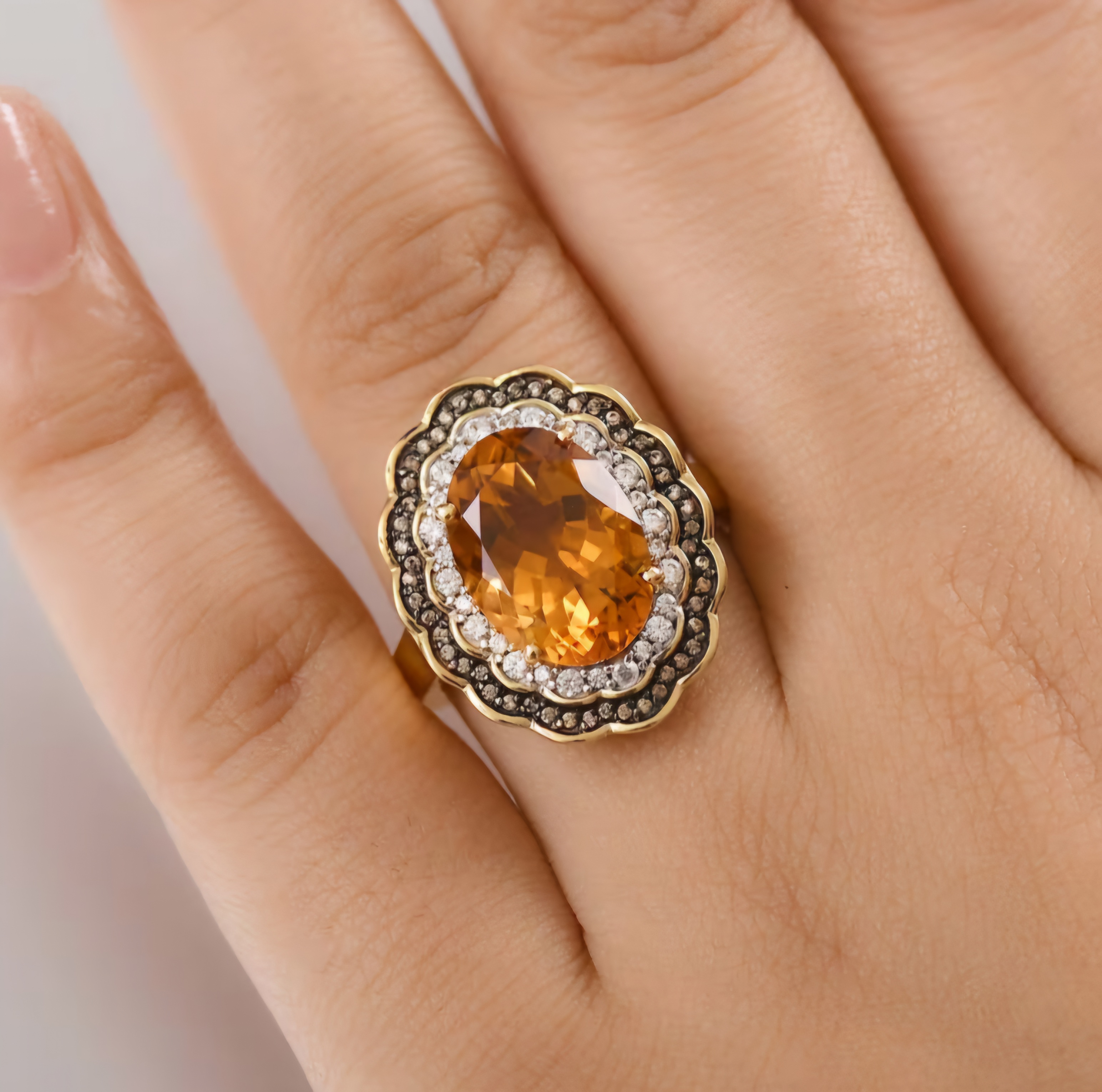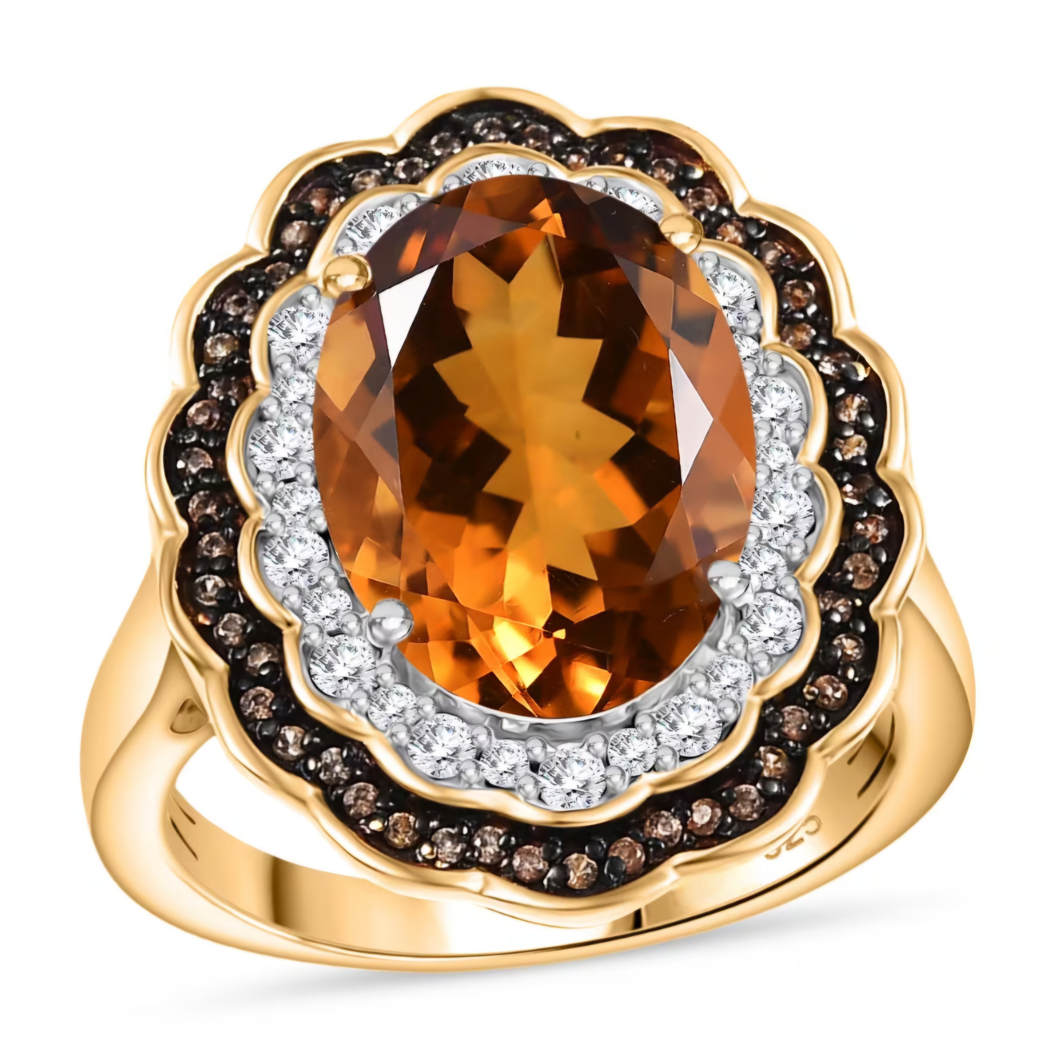 Adorn your finger with the warm, rich hues of autumn. This stunning ring features a magnificent oval Madeira citrine, radiating a deep, golden-orange glow. A double halo of sparkling white and brown zircon surrounds the citrine, creating a captivating contrast and enhancing its brilliance. The 18K yellow gold overlay on sterling silver adds a touch of luxurious warmth. With a total gemstone weight of 6.35 carats, this ring is a statement of sophisticated elegance. Crafted to your exact ring size, this piece is a personalized treasure. Design your own autumnal radiance today.