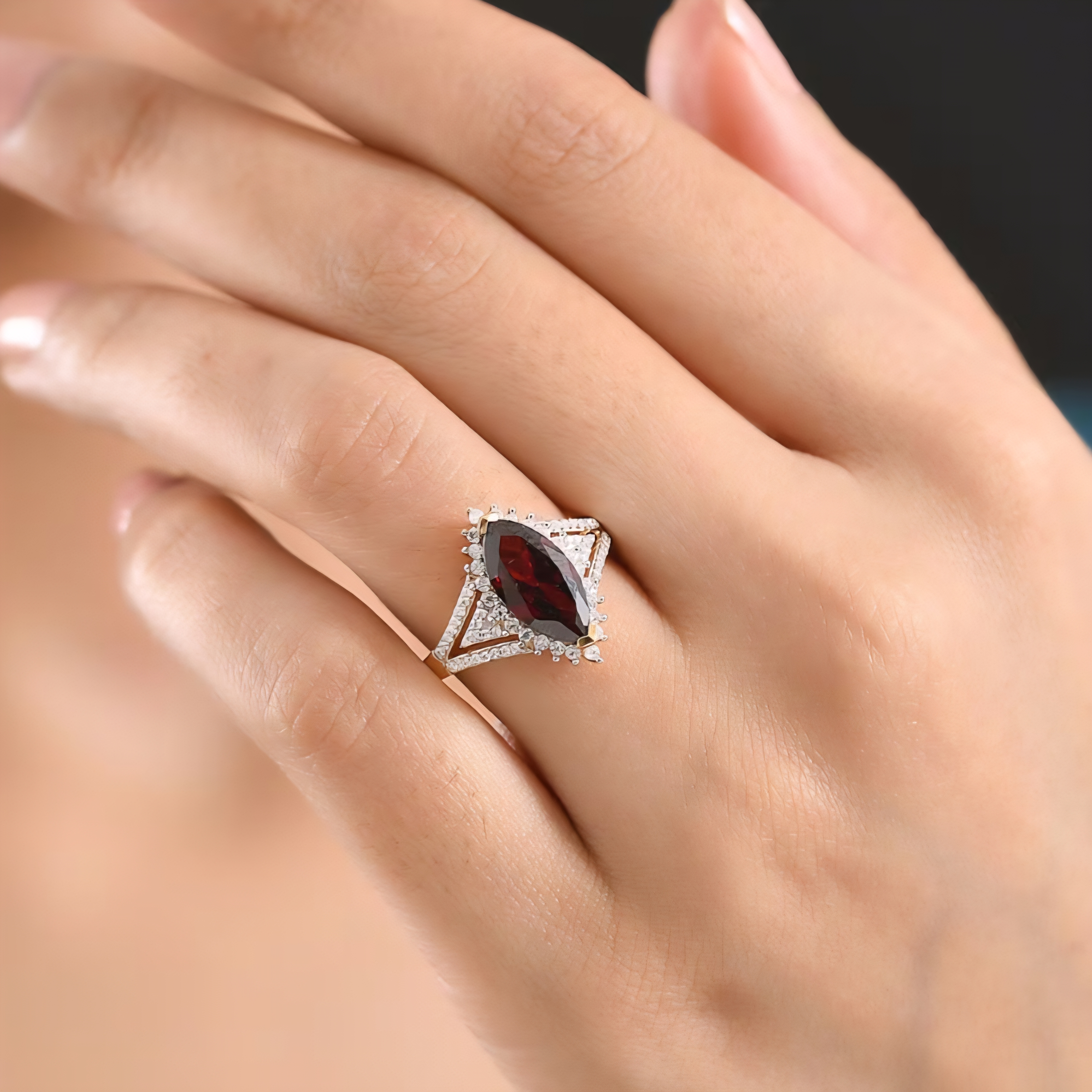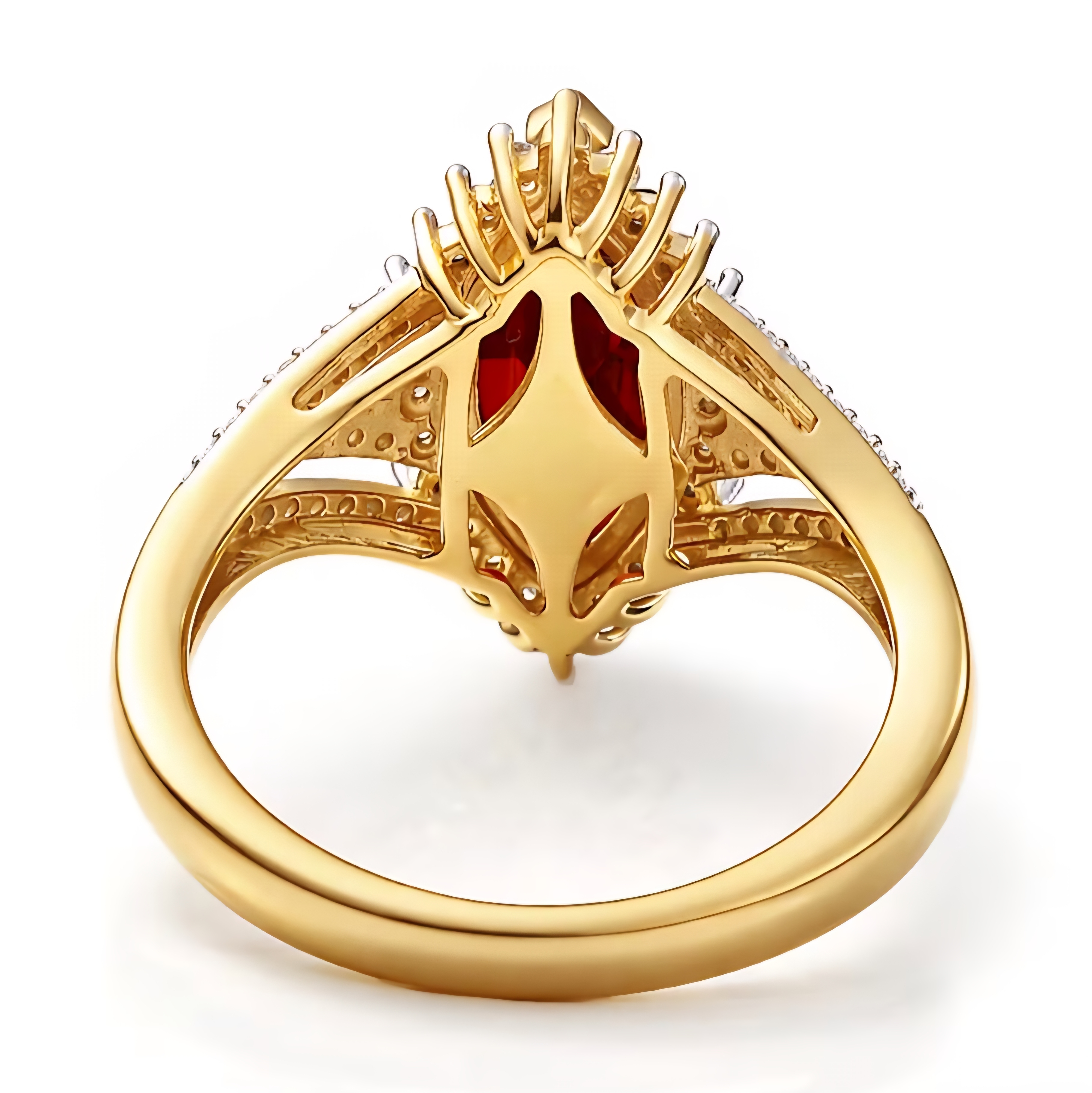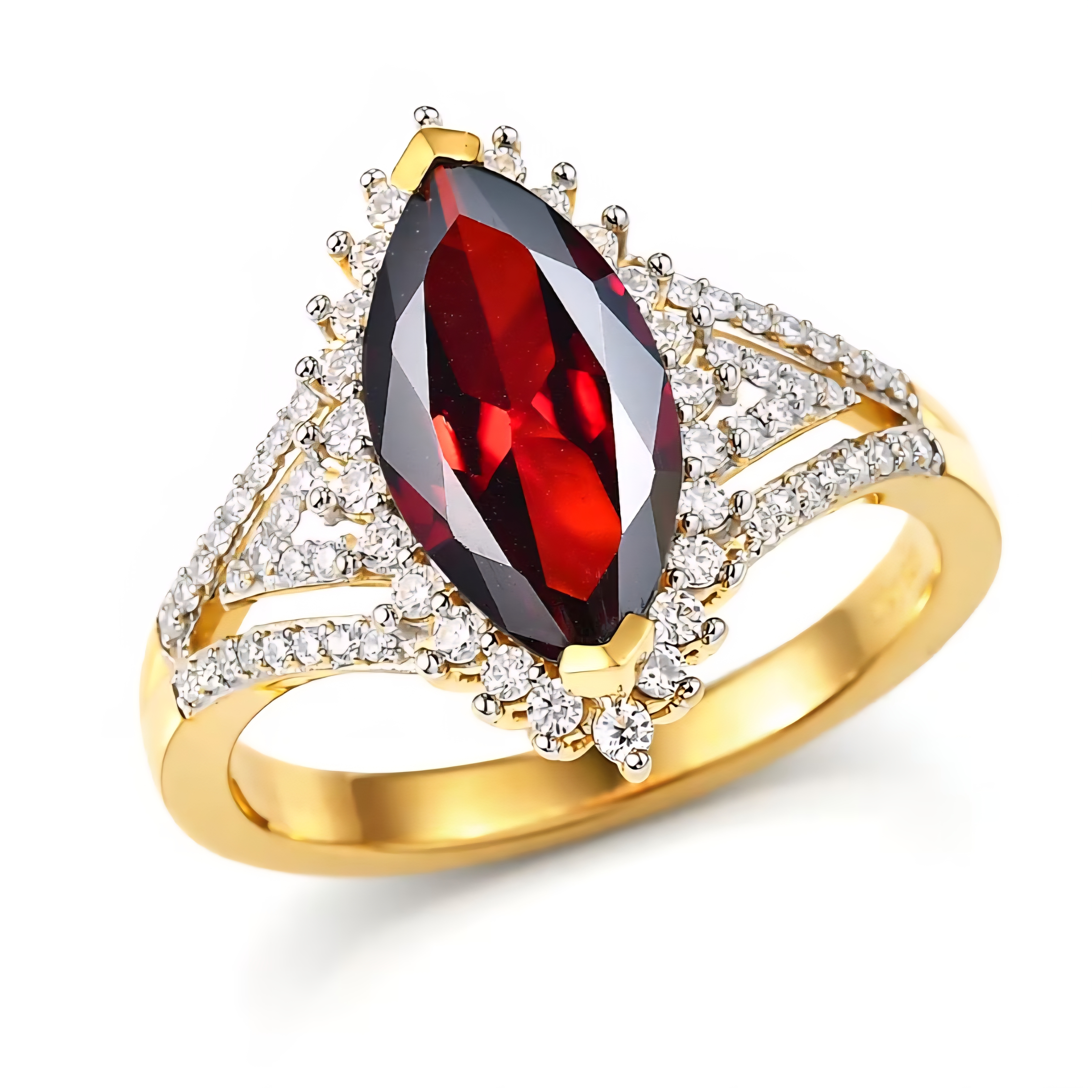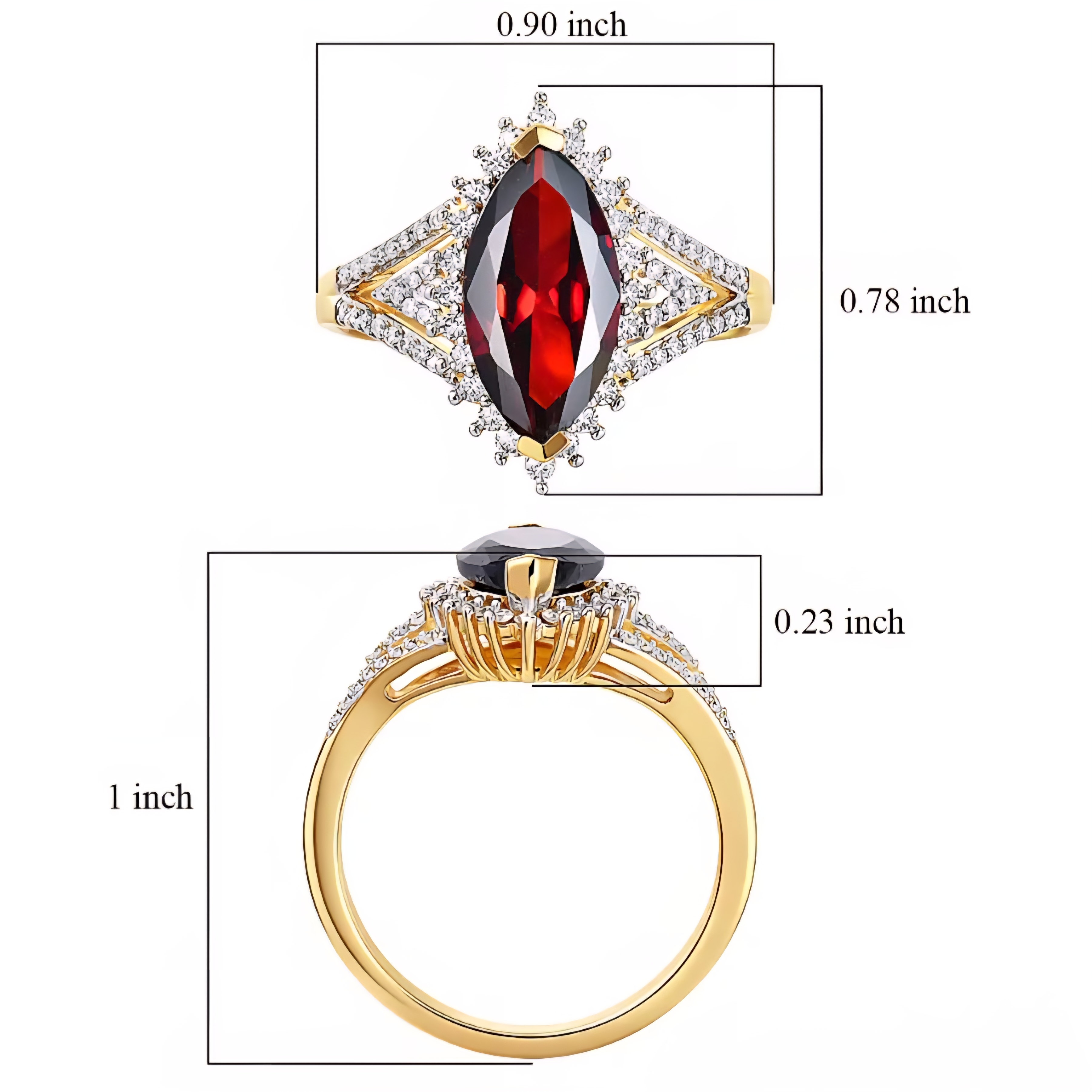 This ring is built around a long marquise cut garnet that delivers depth, saturation, and unmistakable presence. The elongated shape pulls the eye vertically, giving the stone dominance without excess bulk. A structured halo and split shank of colorless moissanite sharpen the profile and amplify light without stealing attention from the center. Finished in rich 18K yellow gold over solid sterling silver with rhodium detailing, this design balances classic form with modern edge.