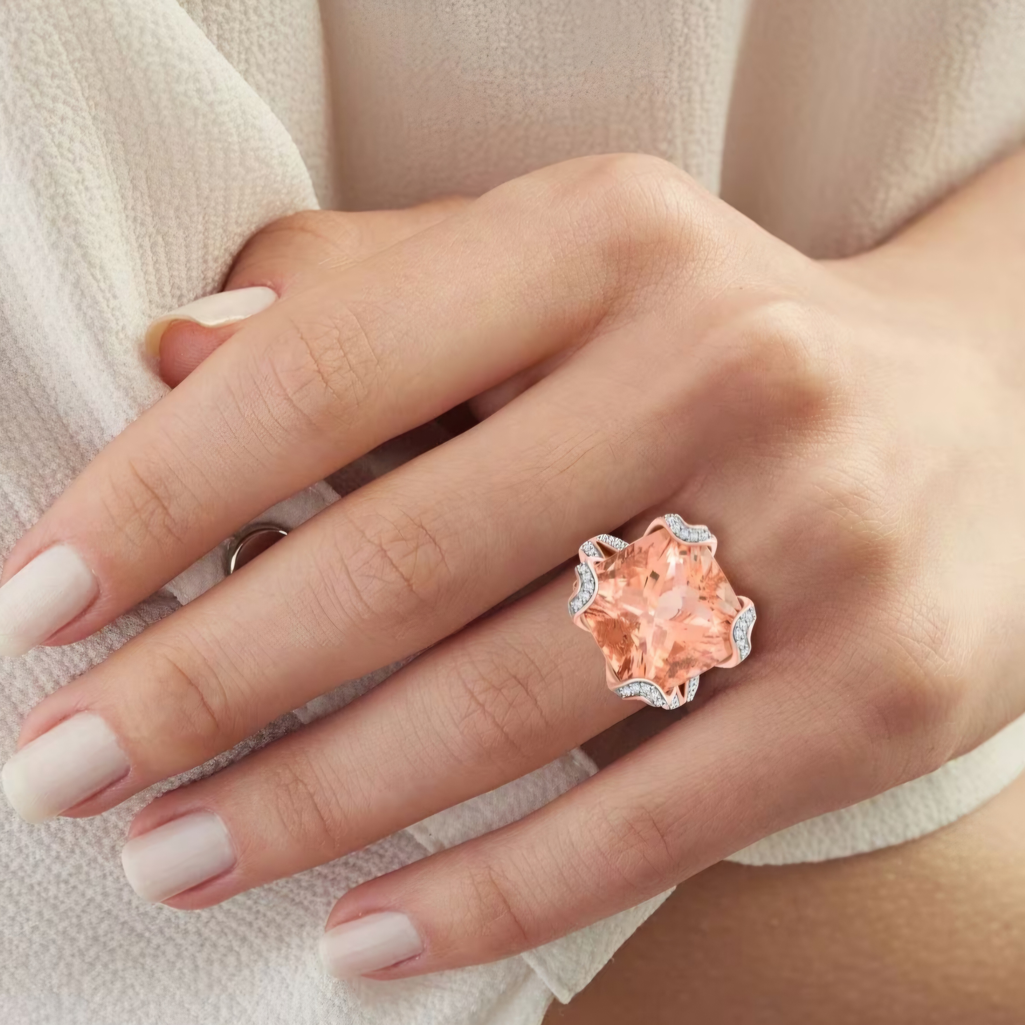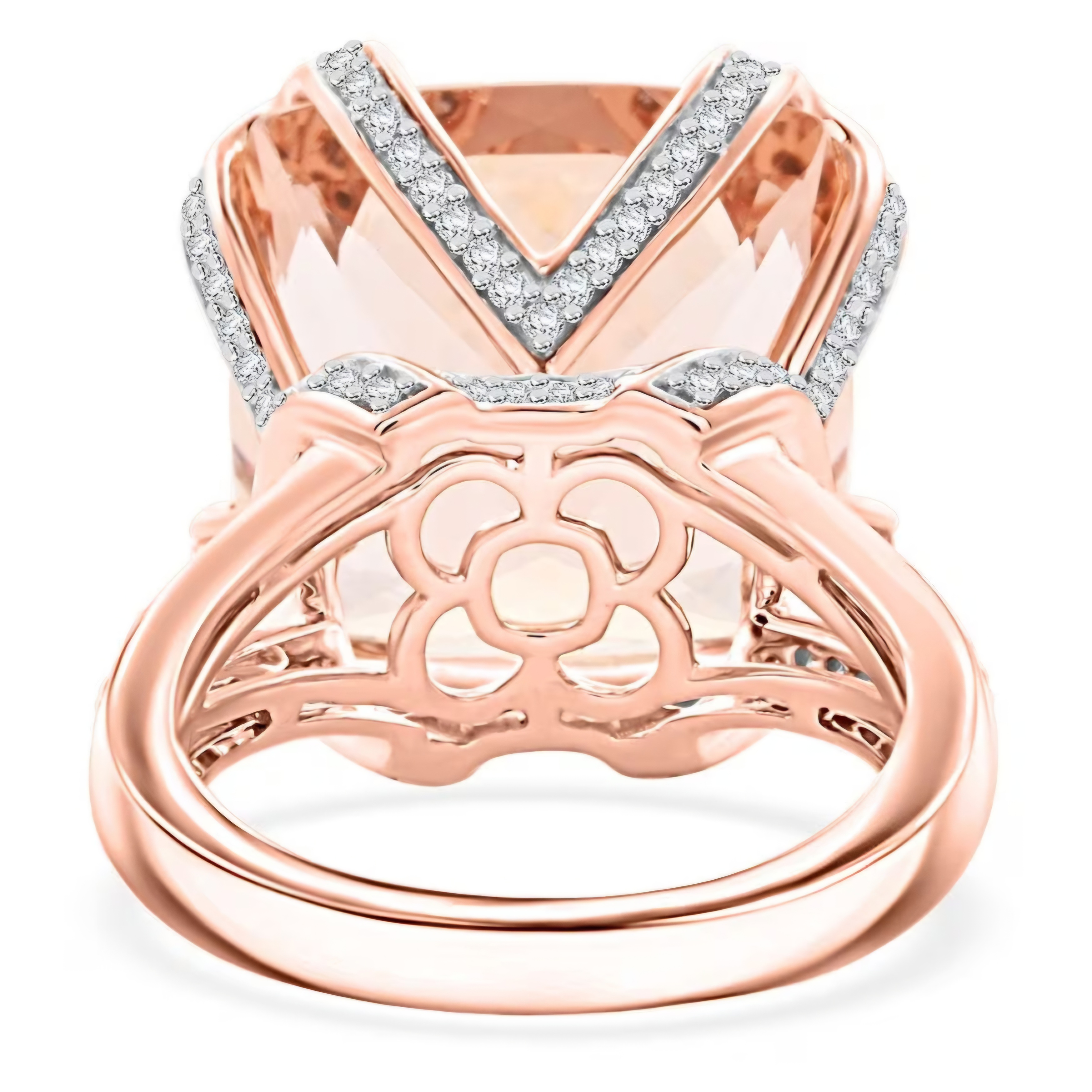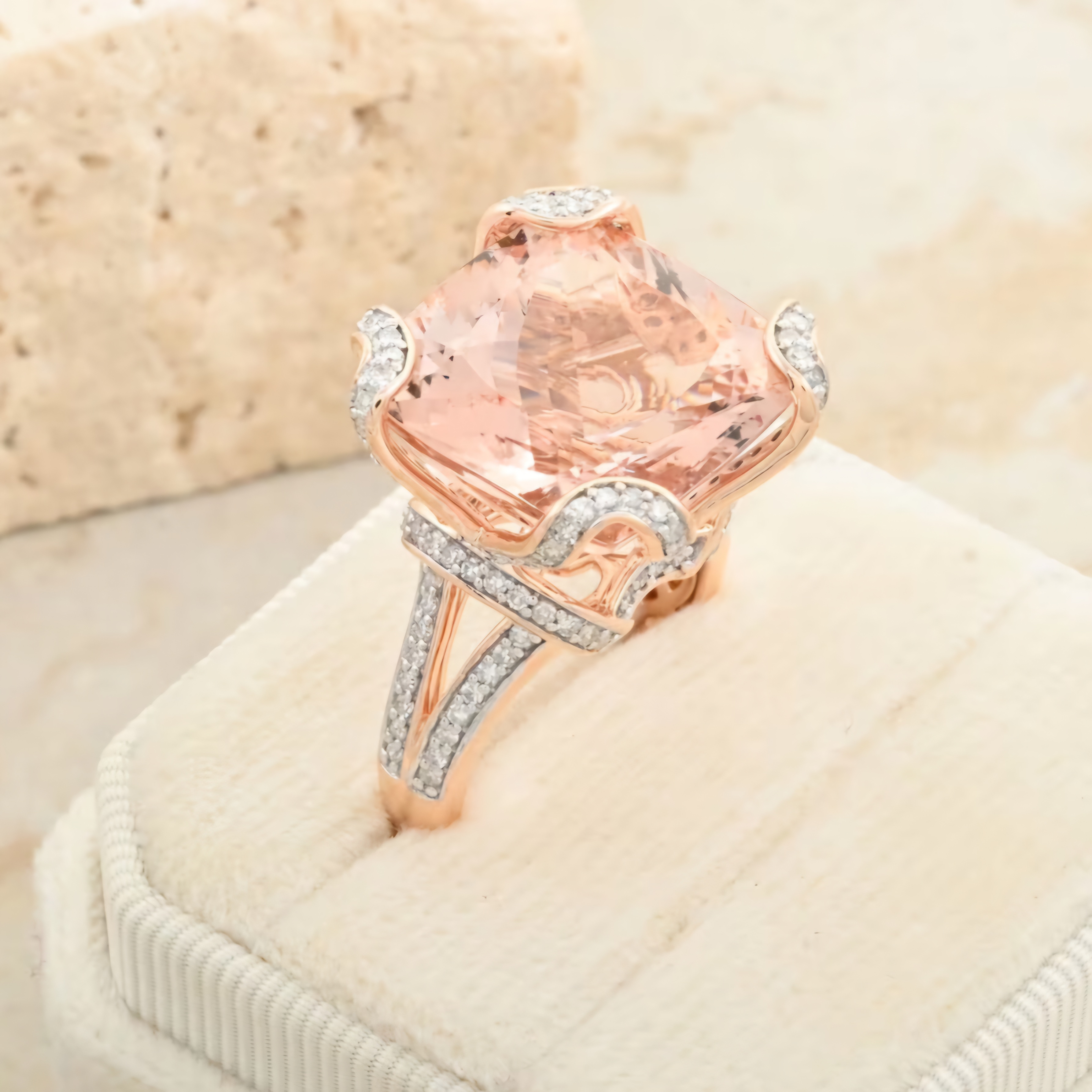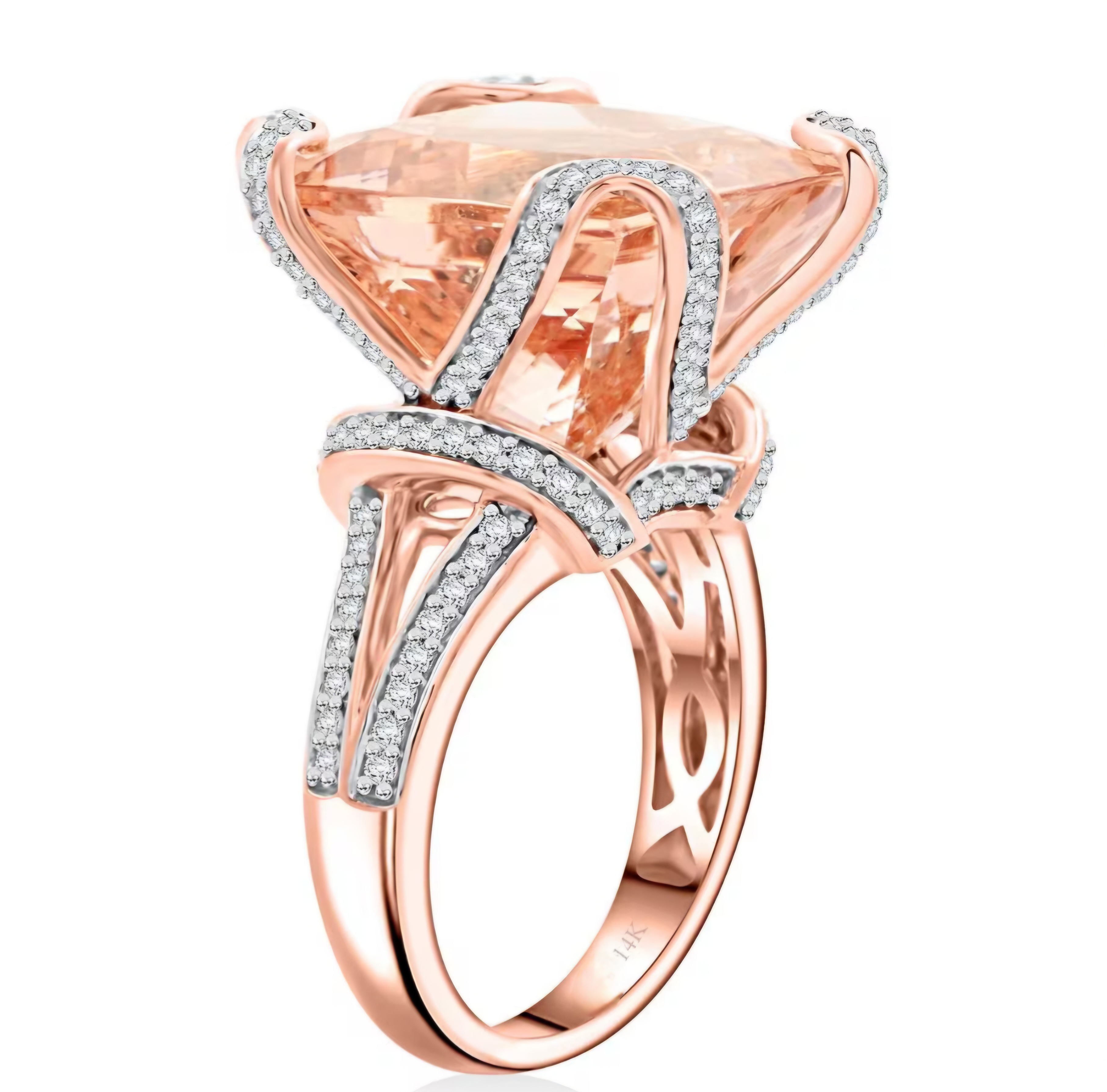 Indulge in the captivating allure of this statement ring. A magnificent cushion-cut morganite, with its soft, peachy hue, takes center stage. Intricate diamond-accented detailing, including a unique geometric design on the back, enhances the ring's opulence. The 14K rose gold setting adds a touch of romantic warmth. Crafted to your exact ring size, this ring is a personalized masterpiece. This ring is a celebration of refined elegance and contemporary design. Design your own blush opulence today.