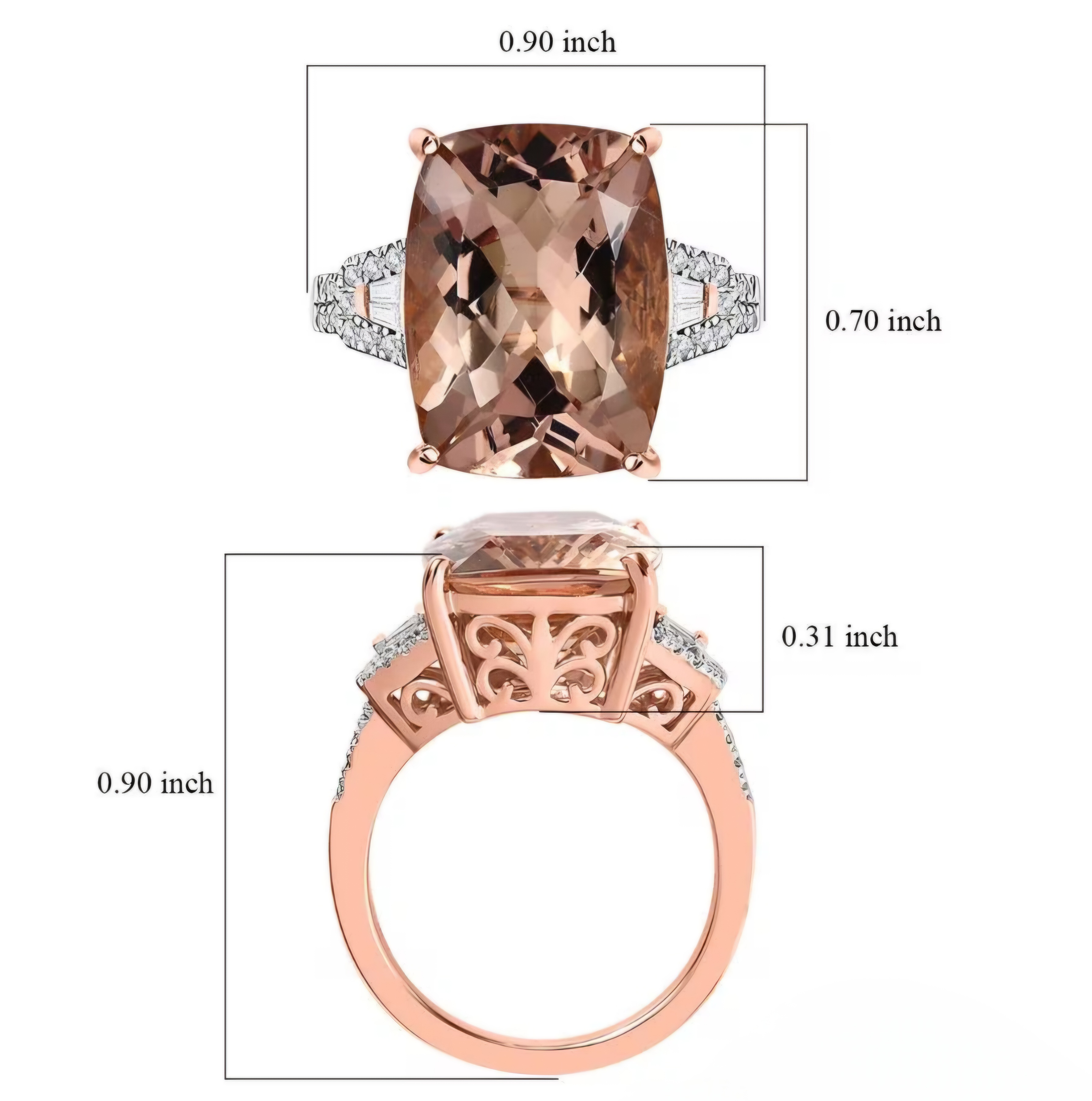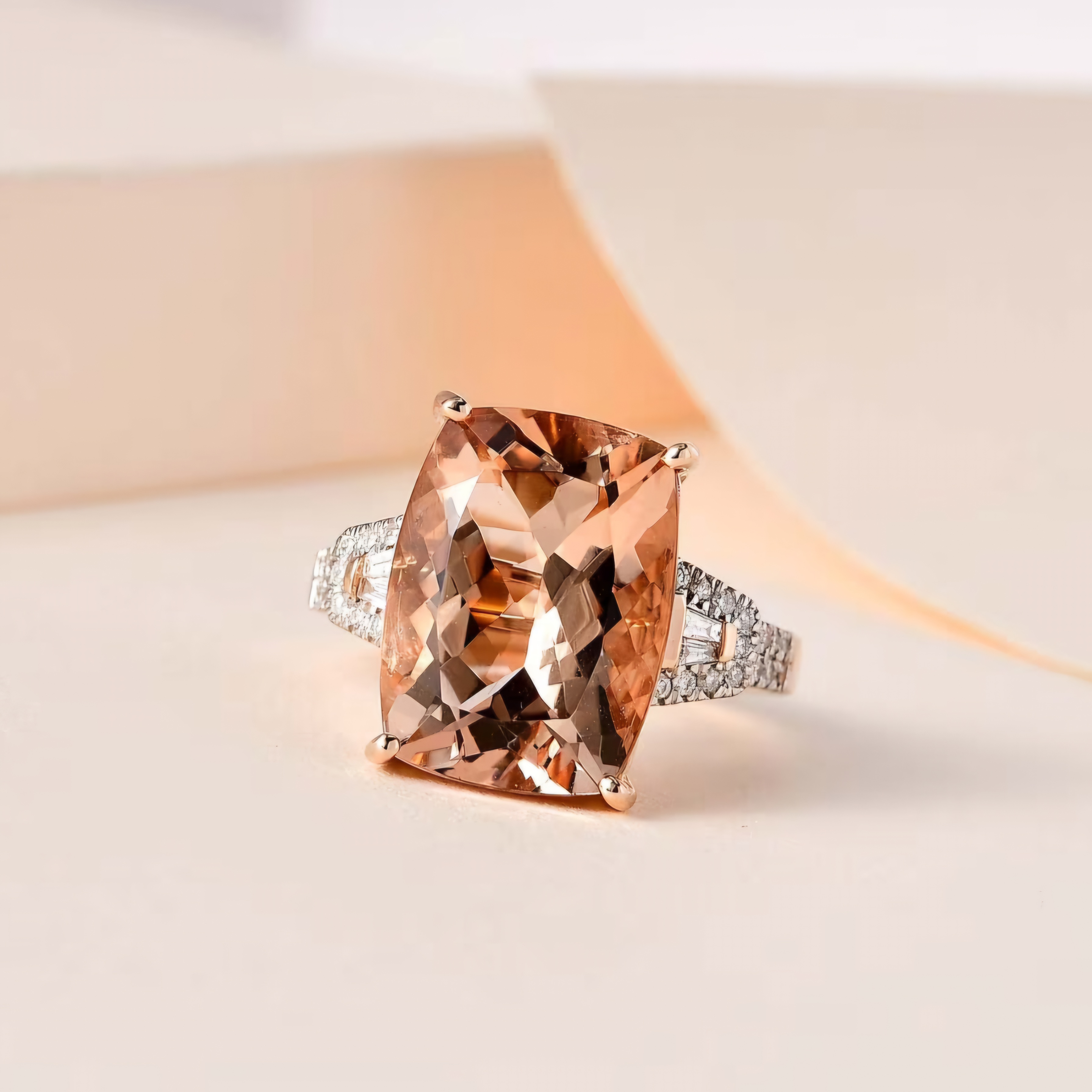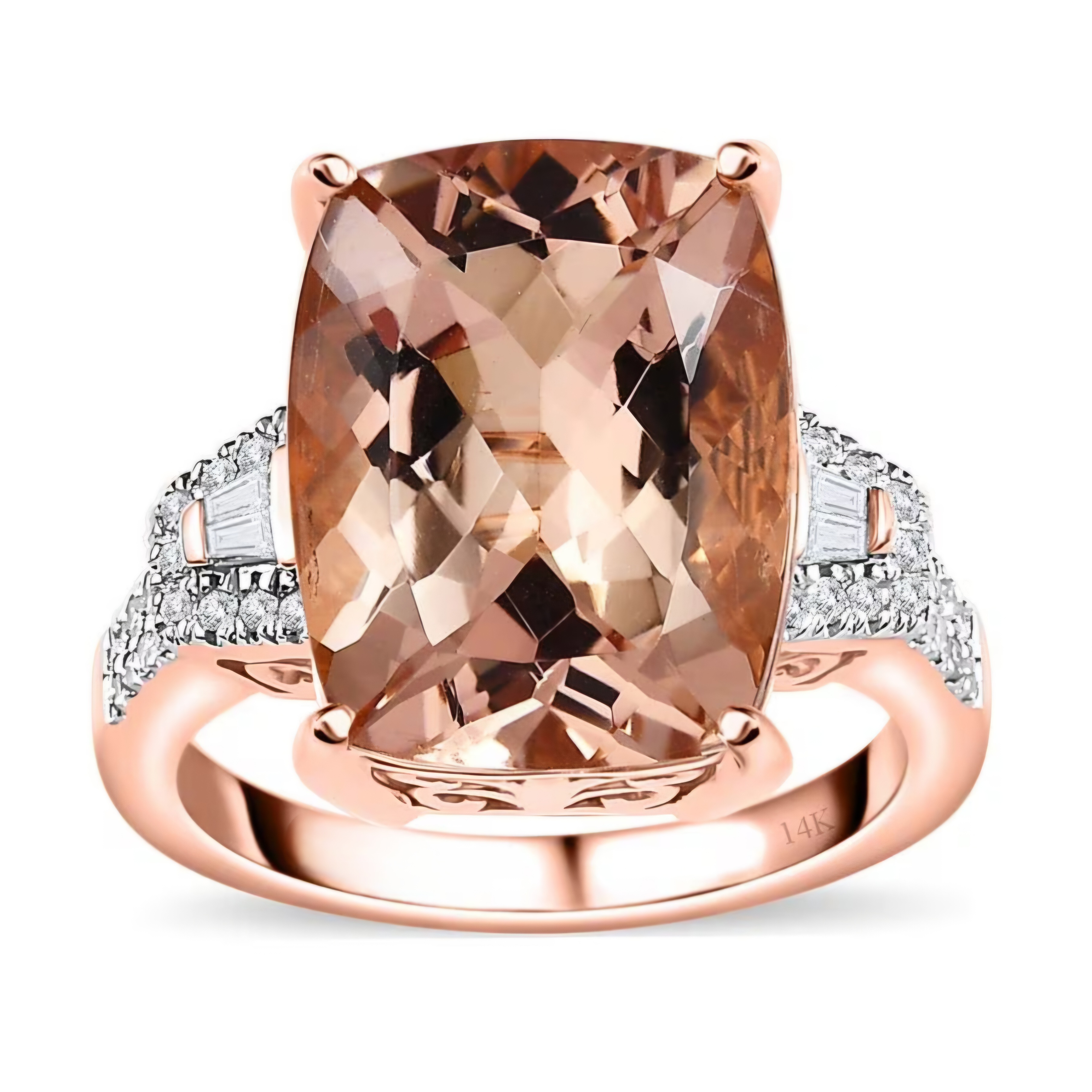 Indulge in the captivating allure of this statement ring. A magnificent cushion-cut morganite, with its soft, peachy hue, takes center stage. Intricate diamond-accented detailing enhances the ring's opulence. The 14K rose gold setting adds a touch of romantic warmth. Crafted to your exact ring size, this ring is a personalized masterpiece. This ring is a celebration of refined elegance and contemporary design. Design your own blush opulence today.