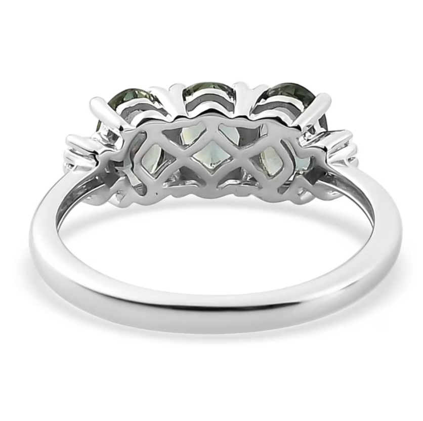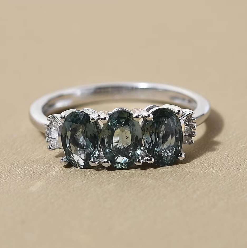 Three Australian parti sapphires are arranged in a traditional trilogy setting, each oval displaying its own blend of green, blue, and yellow tones. The stones are selected to complement one another, allowing their natural zoning to read cohesively across the ring while preserving the individuality that defines parti sapphire.