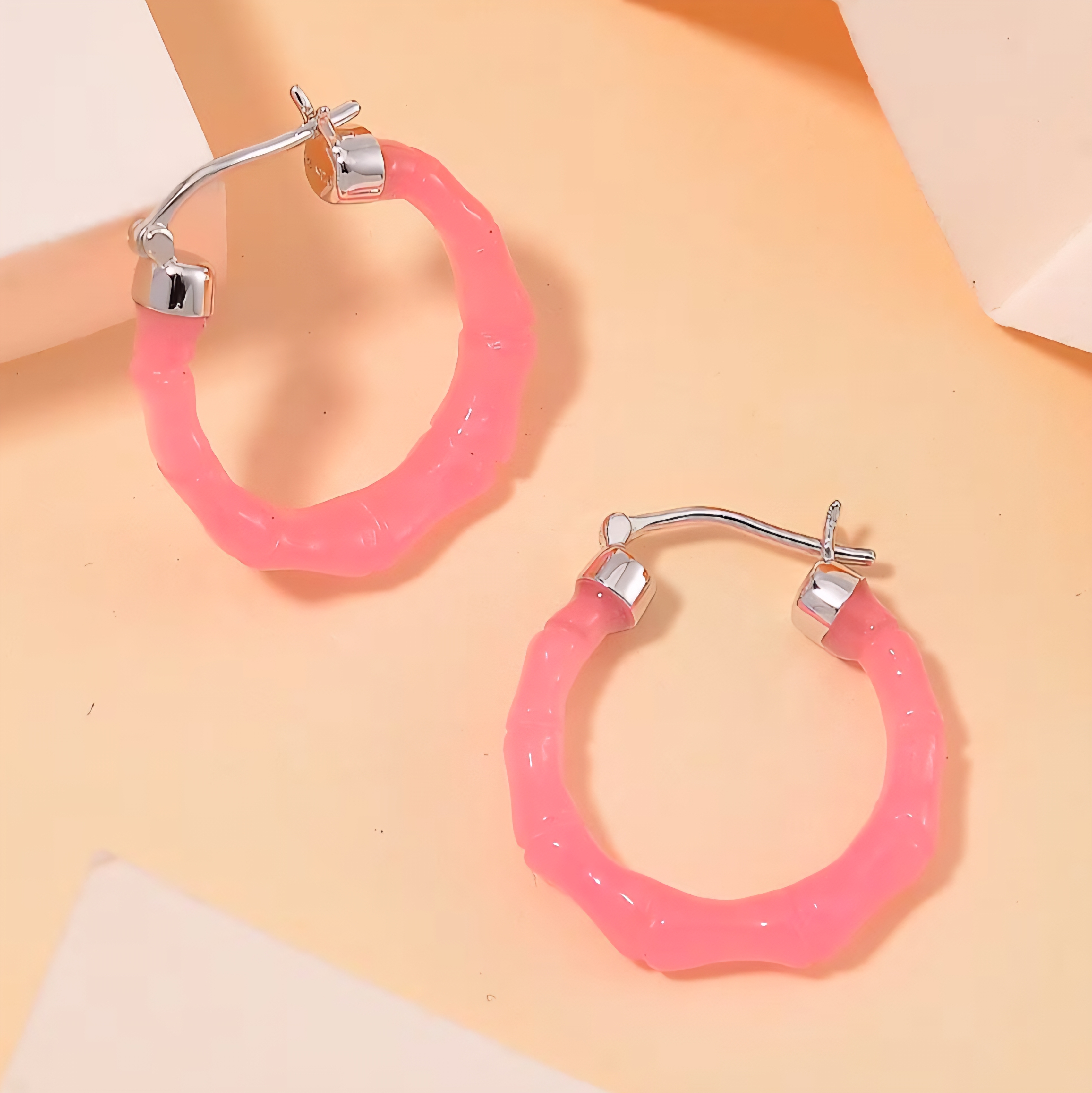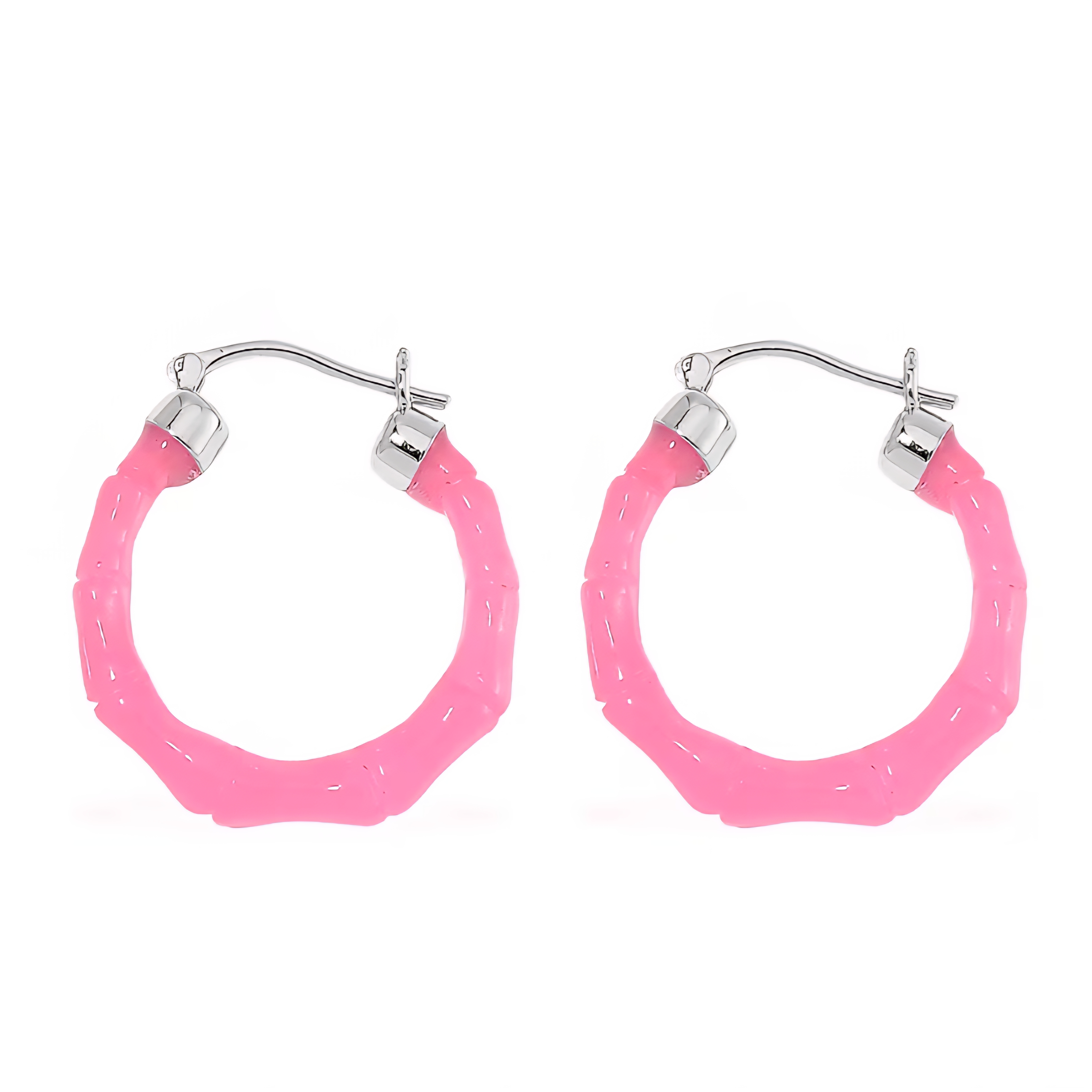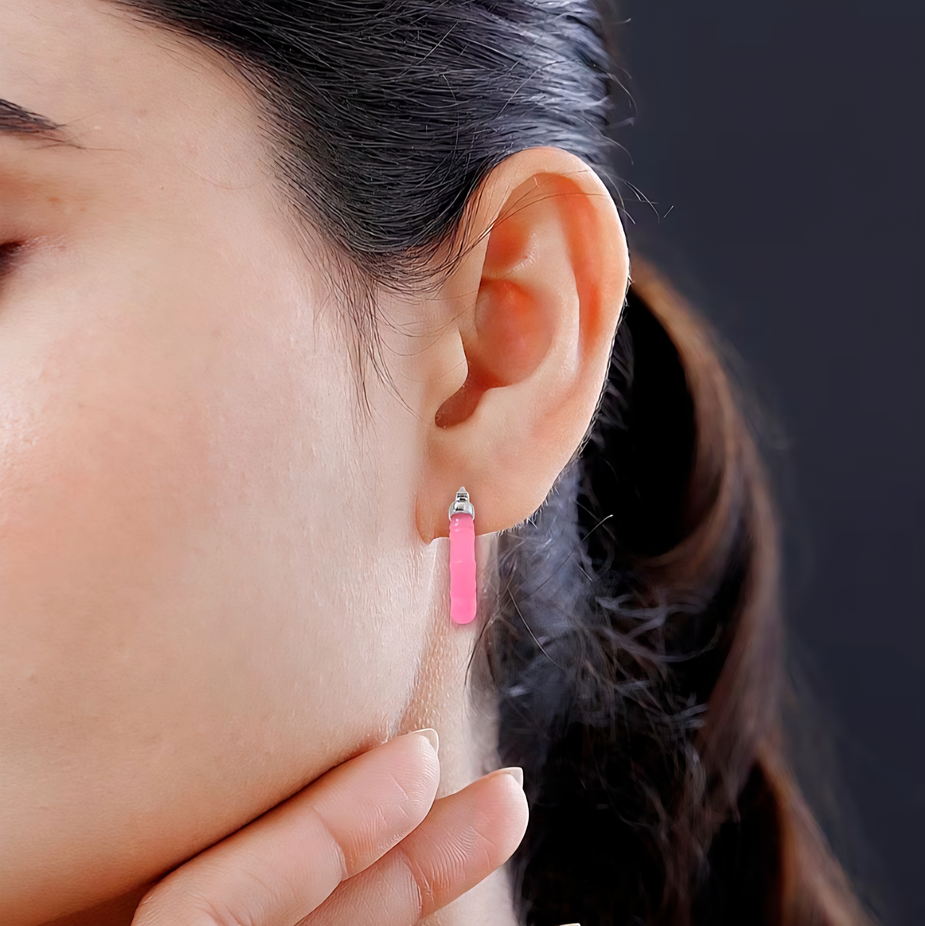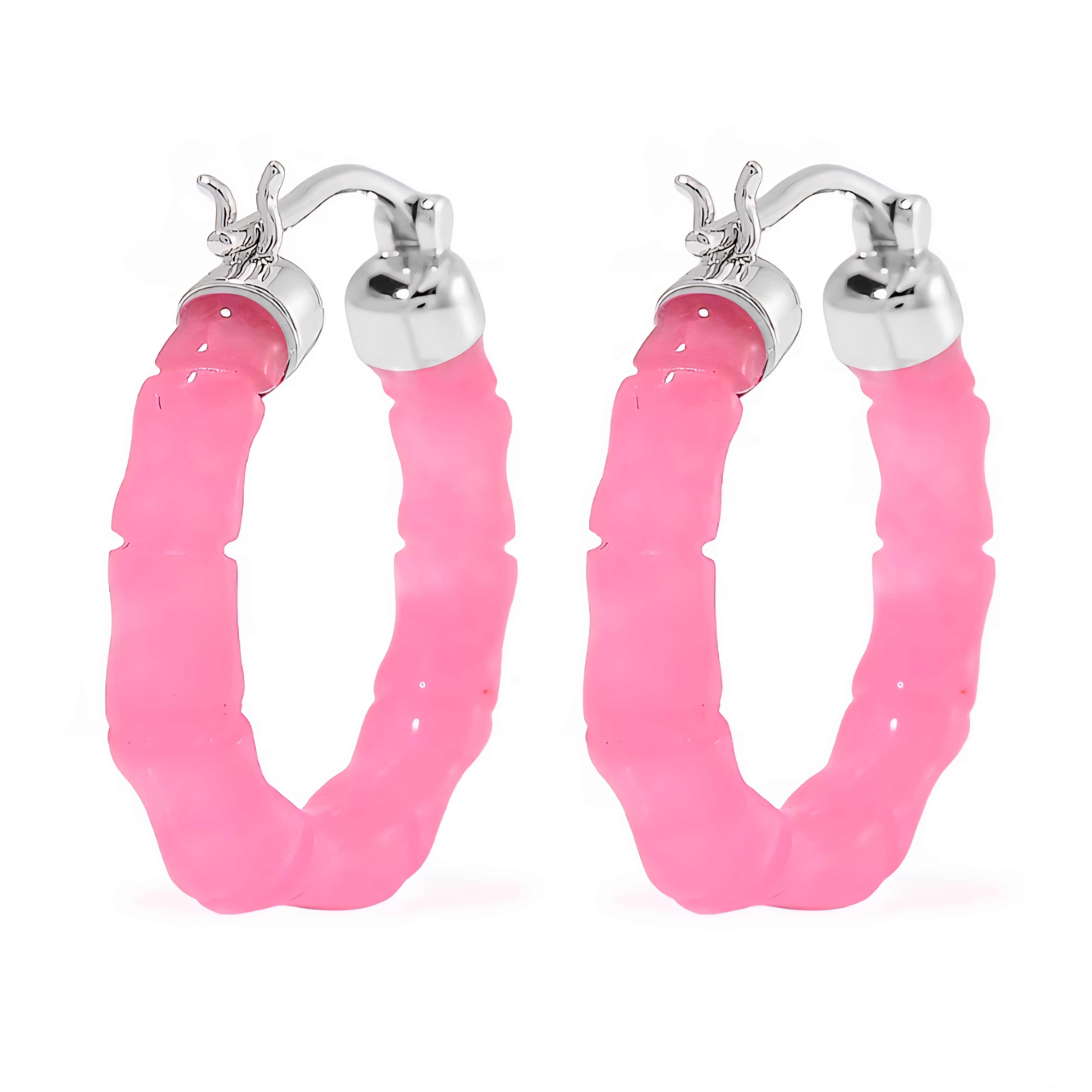 These bamboo-style hoop earrings feature smooth, freeform pink jadeite jade carved into a rounded silhouette that wraps naturally around the ear. The soft translucence and organic texture of the jade give the hoops a sculptural, fluid look that feels both playful and refined.