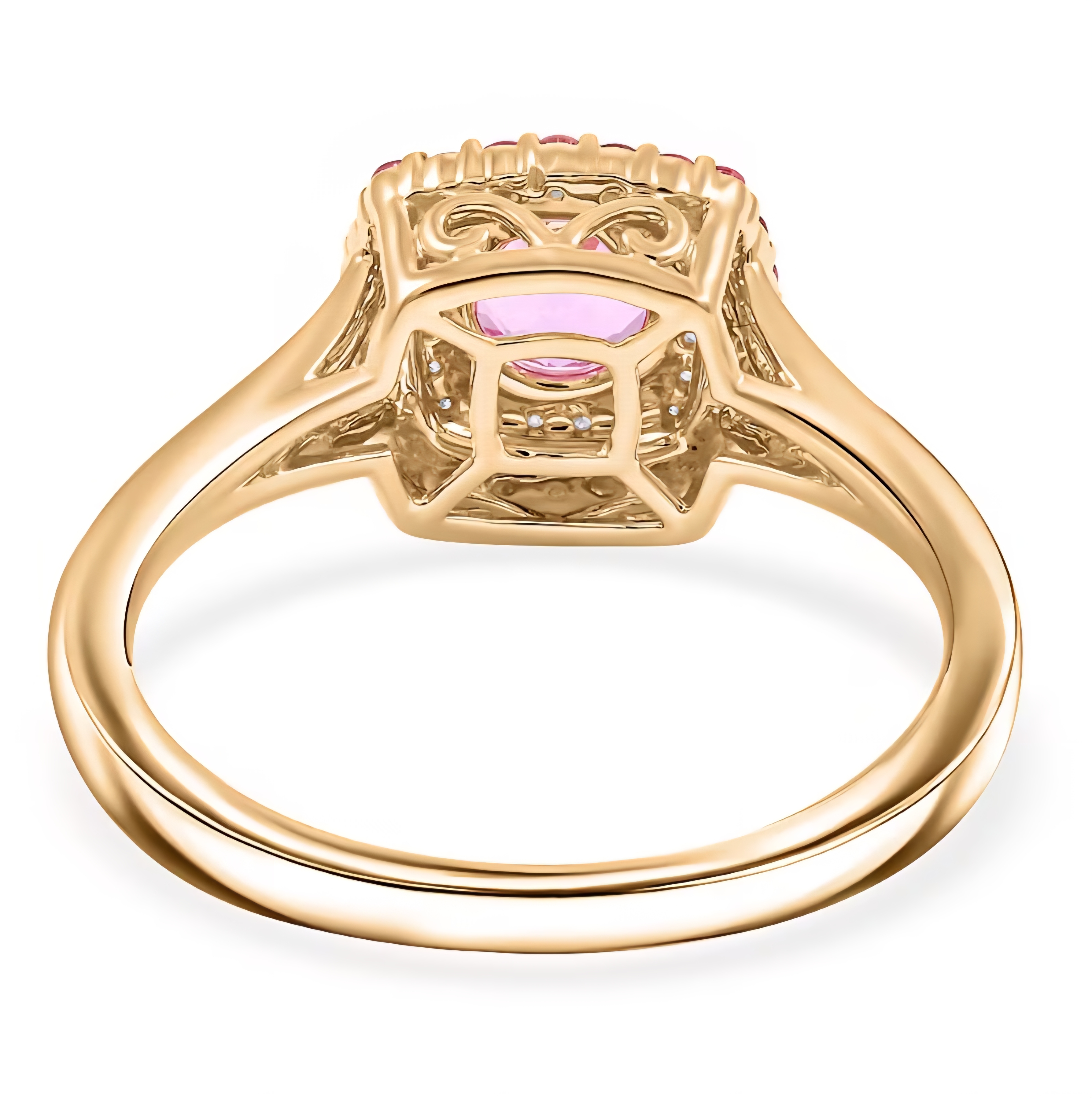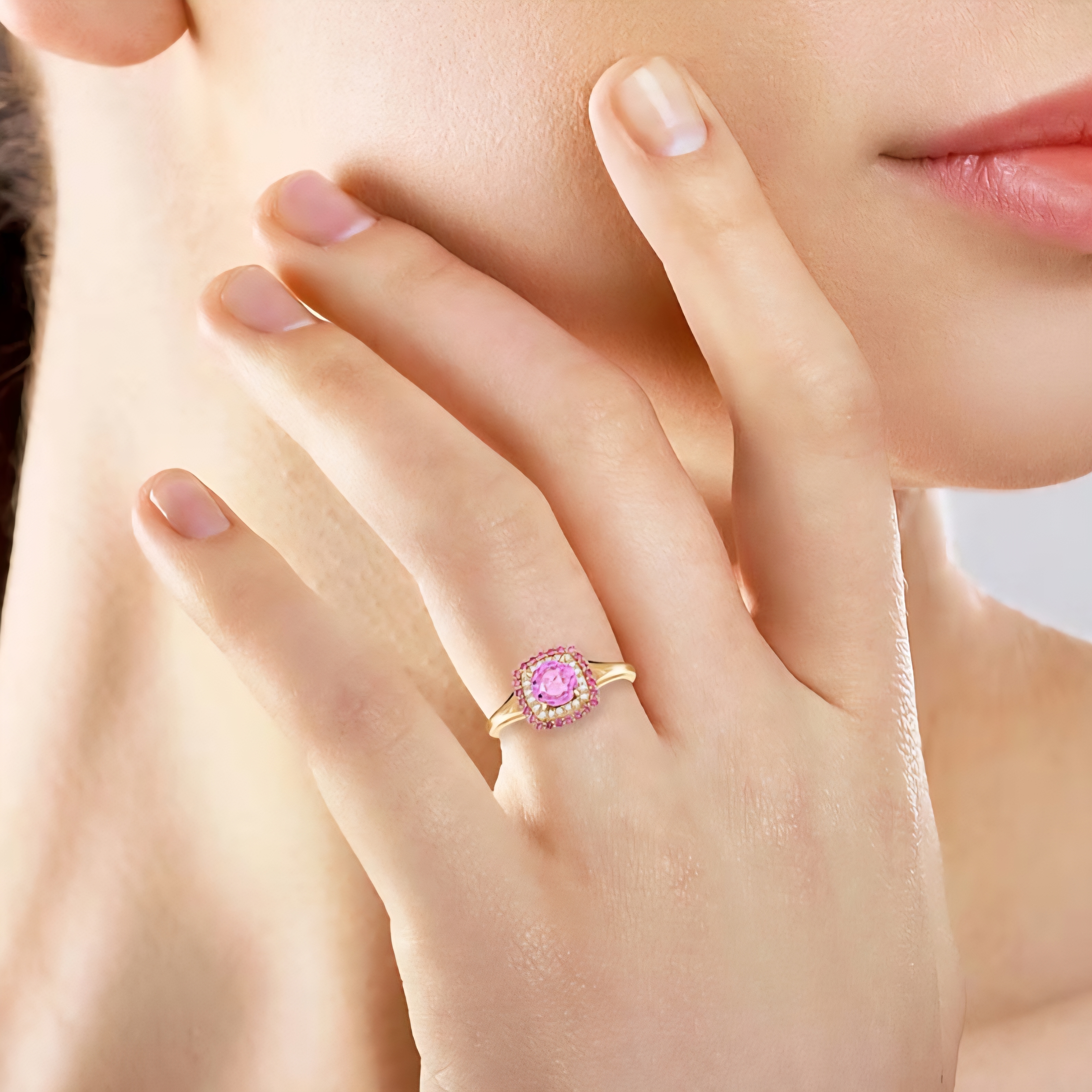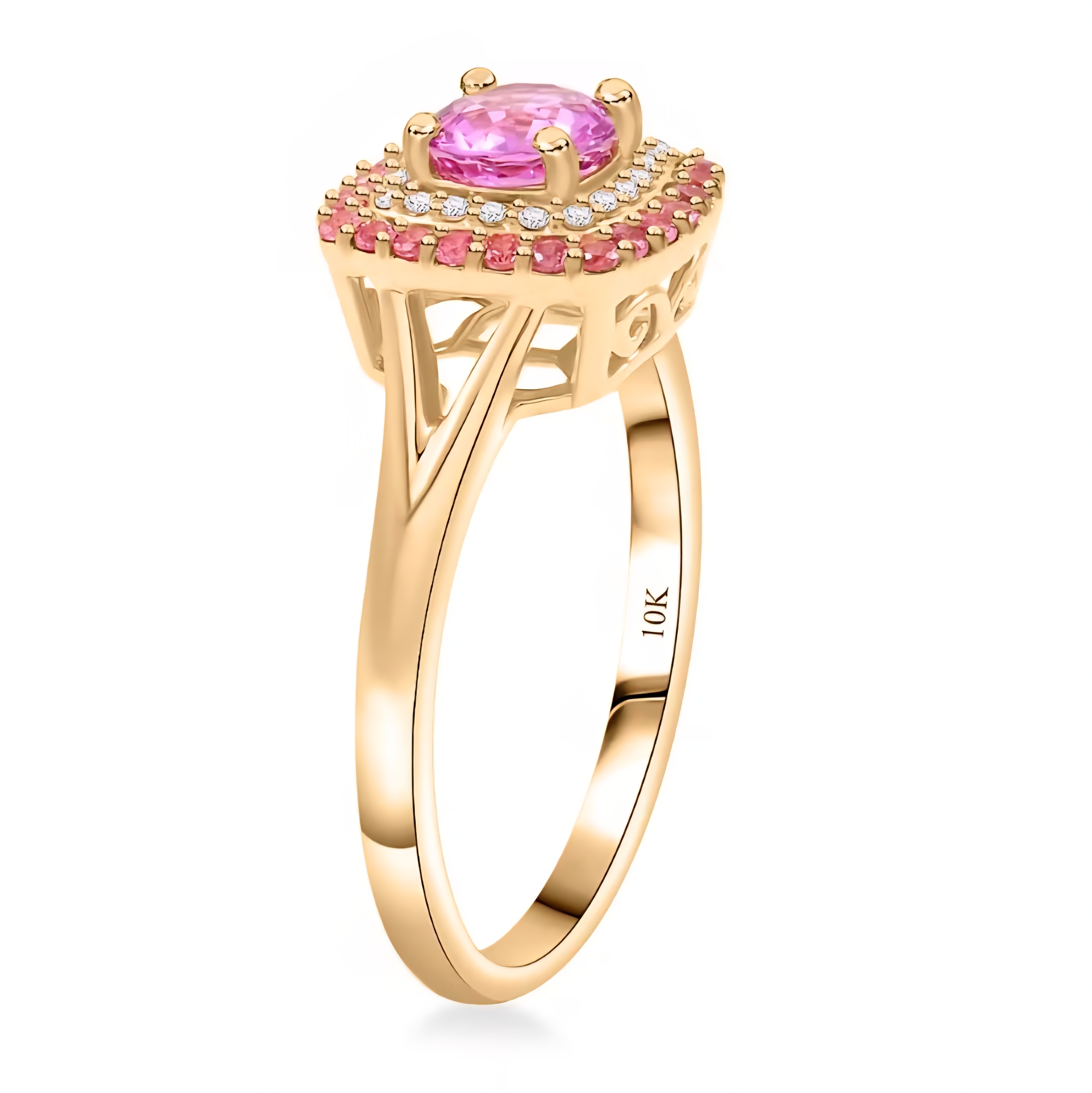 A vivid pink sapphire takes center stage in this refined halo design, surrounded by layers of carefully matched pink spinel and bright white diamond accents. The 6mm round sapphire delivers lively saturation and clarity, while the spinel adds tonal depth and the diamond halo sharpens the contrast.