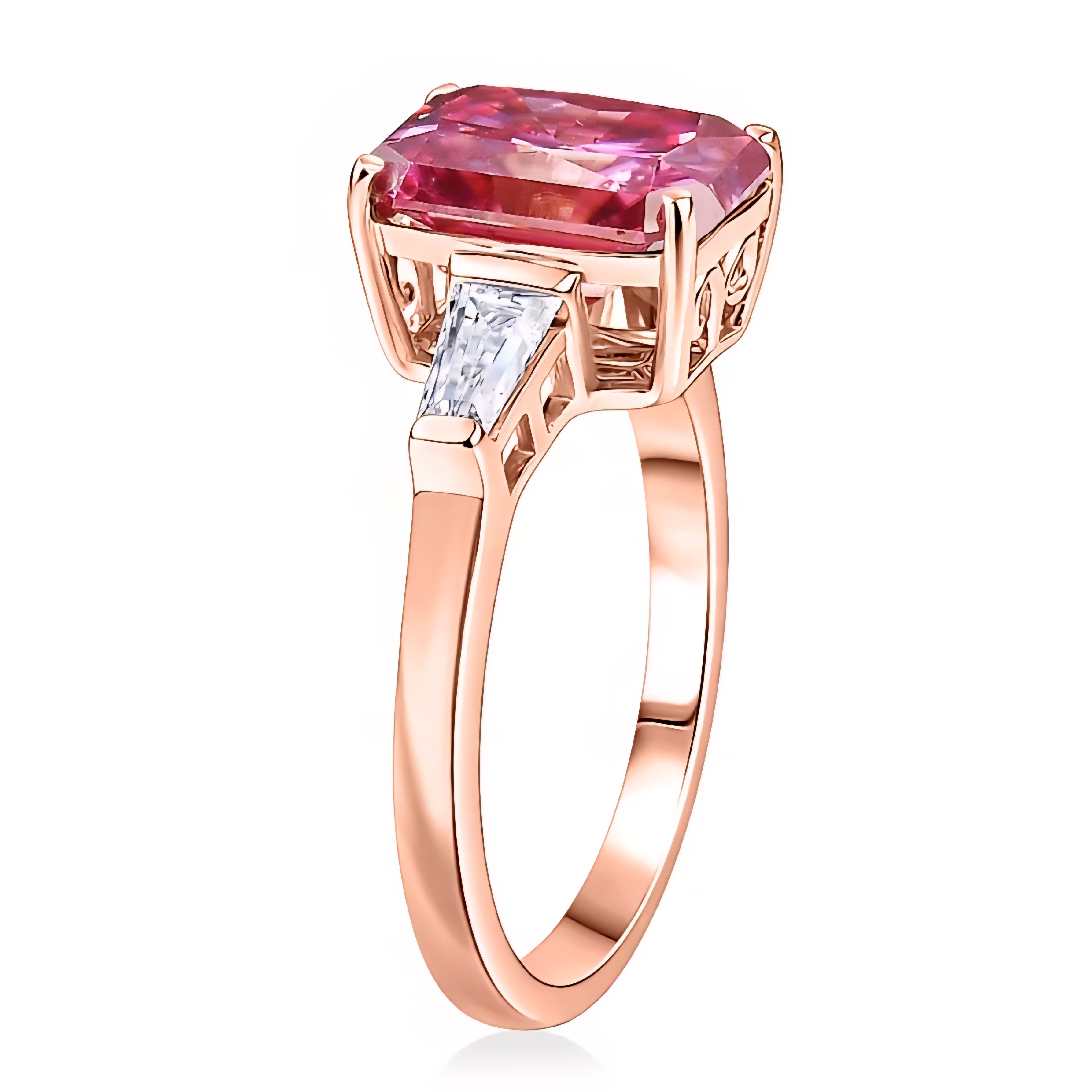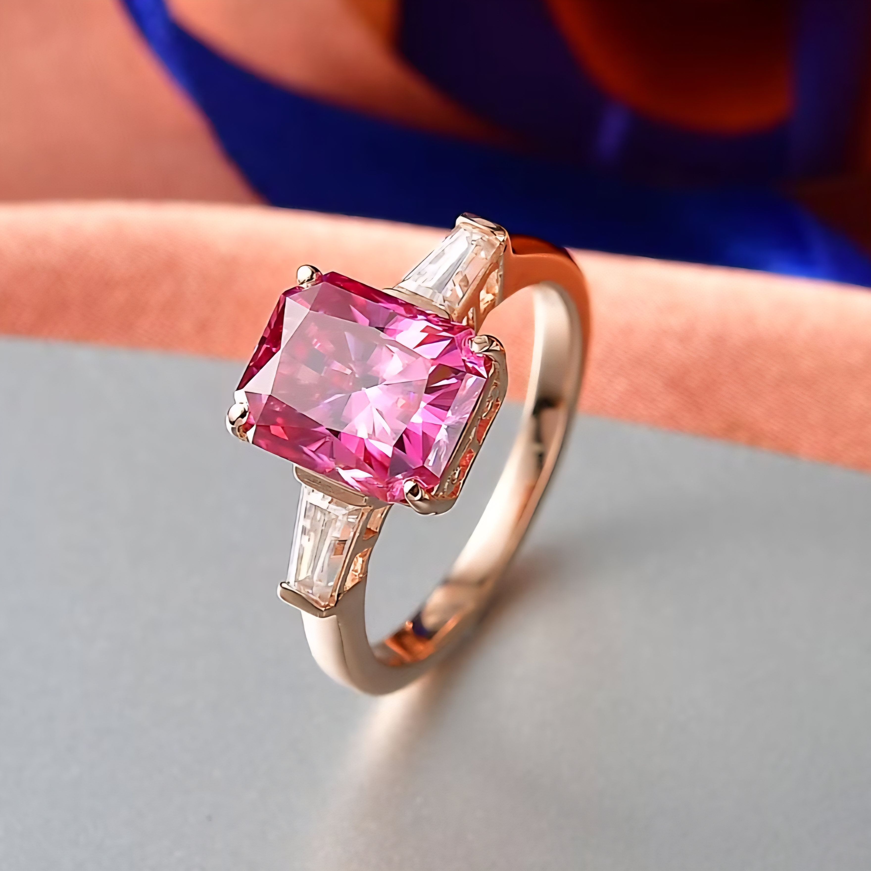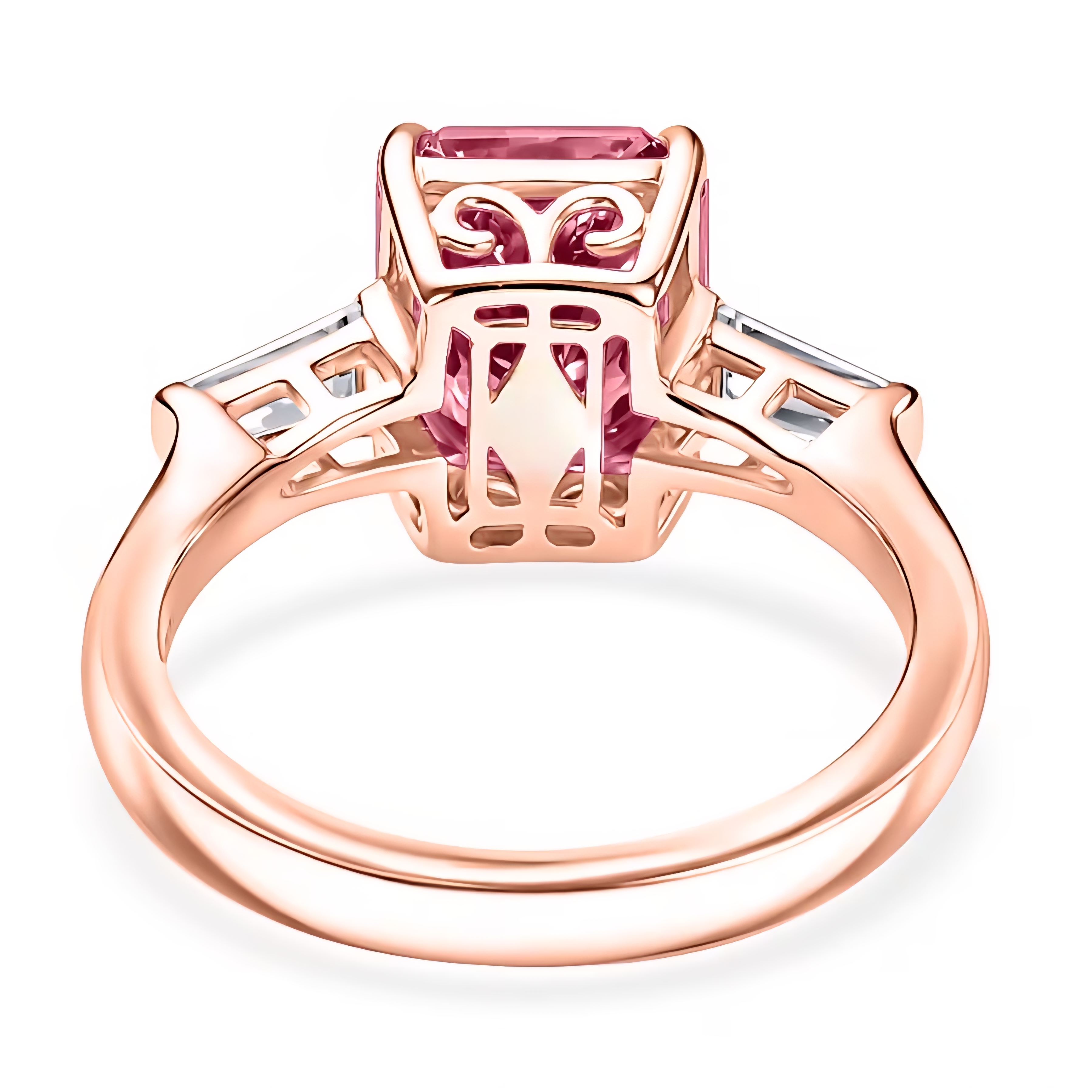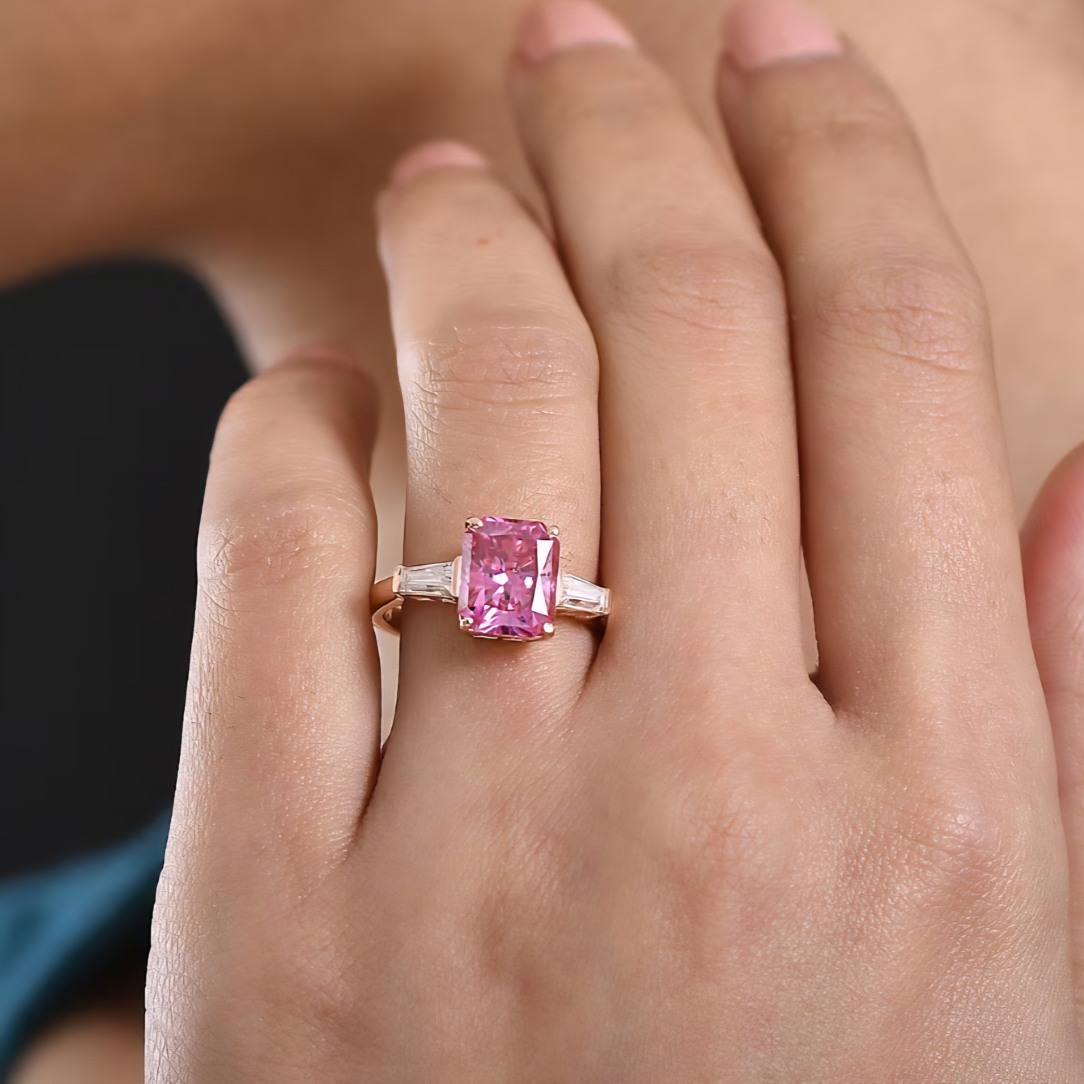 This solitaire ring features a vivid emerald cut pink moissanite set in a sleek, elongated profile. White moissanite tapered baguettes frame the center stone, adding precision and balance without overpowering the design. Finished in 18K rose gold over sterling silver, this piece delivers warmth, contrast, and modern elegance in a strong, streamlined silhouette.