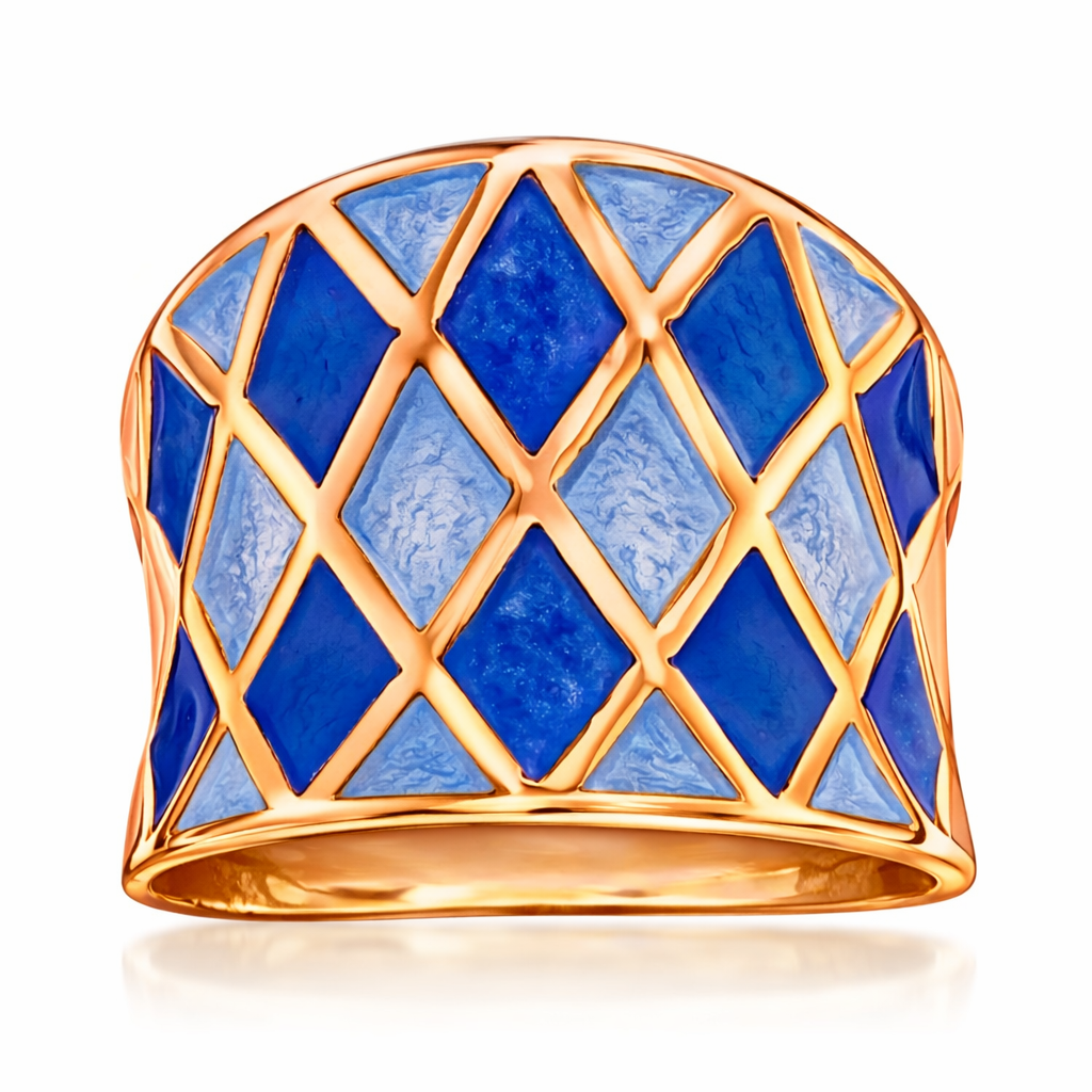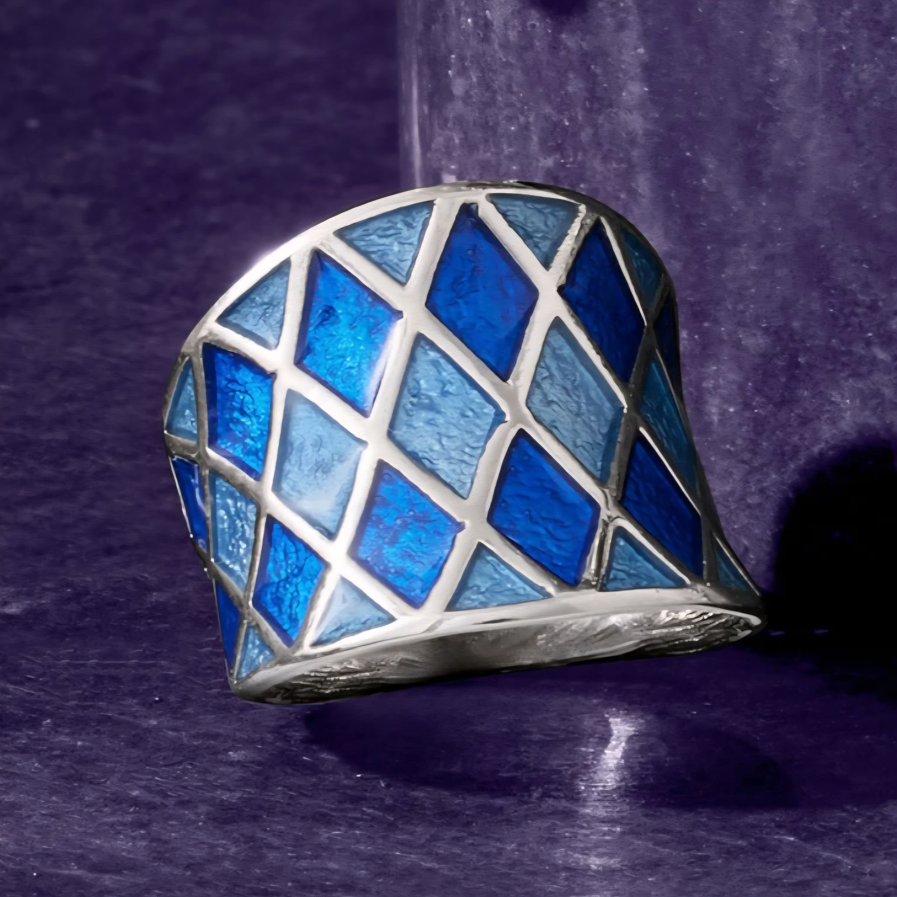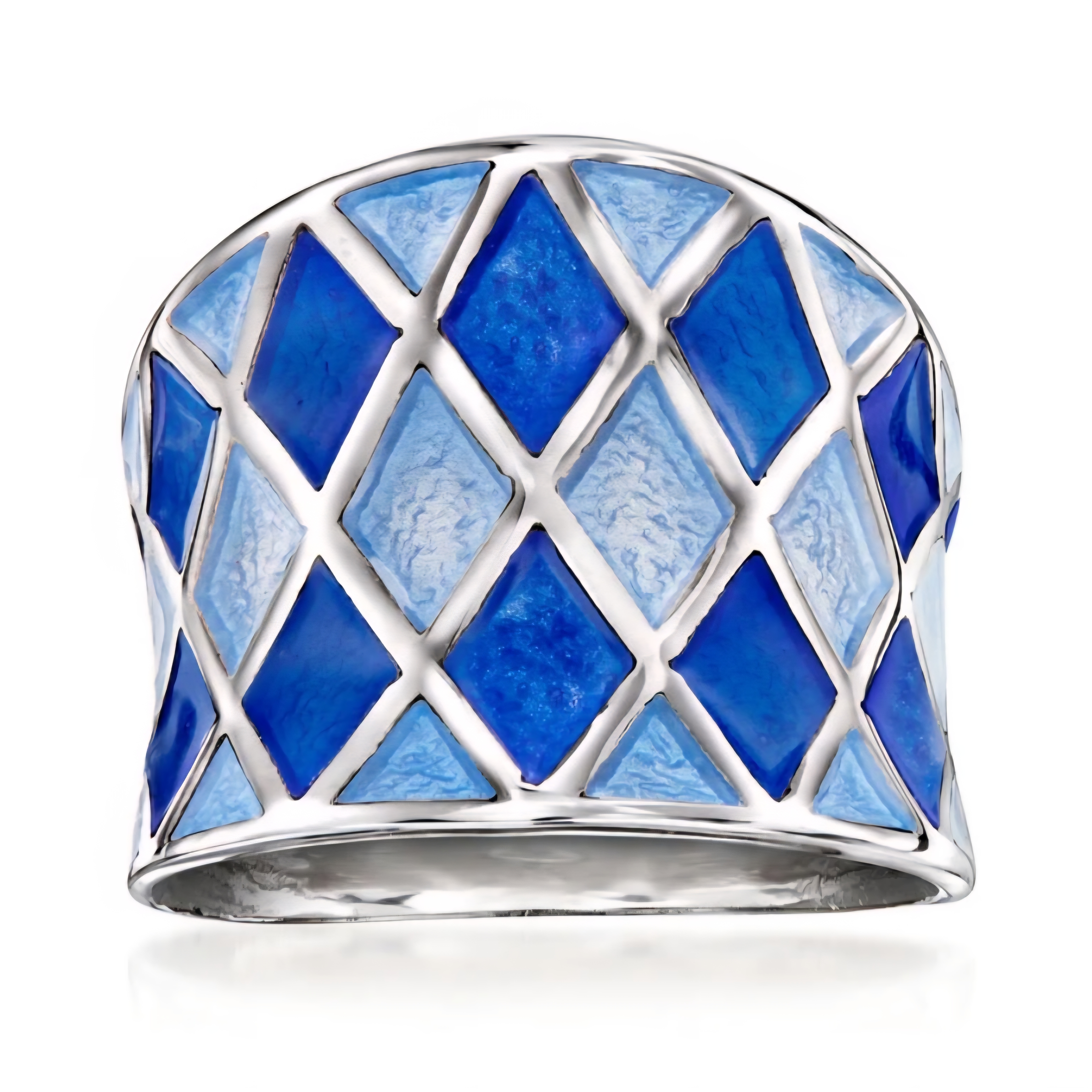 This wide band showcases a classic harlequin layout in layered shades of blue enamel. Alternating deep cobalt and soft sky tones create visual rhythm across the domed surface, while the crisp rhodium plated framework defines each diamond shape with sharp contrast.