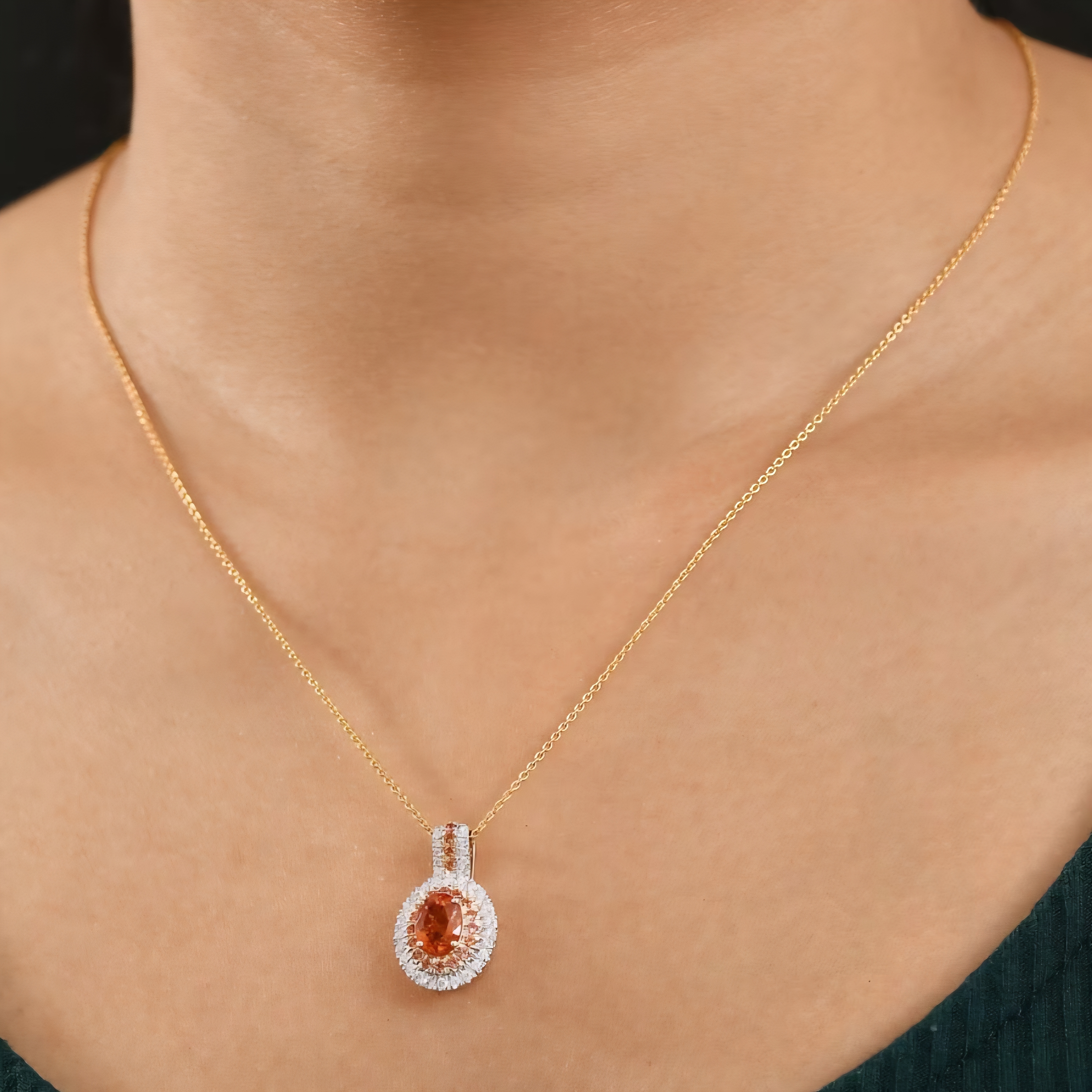 Adorn yourself with the captivating glow of this exquisite halo pendant necklace. A vibrant oval spessartine garnet, with its rich mandarin orange hue, takes center stage, radiating warmth and energy. It's embraced by a delicate inner halo of rare padparadscha sapphires, their unique blend of pink and orange adding a touch of subtle elegance. A further outer halo of sparkling white diamonds enhances the brilliance of the central gemstones, creating a truly captivating effect. The pendant is crafted in warm 10K yellow gold, suspended from a matching chain.