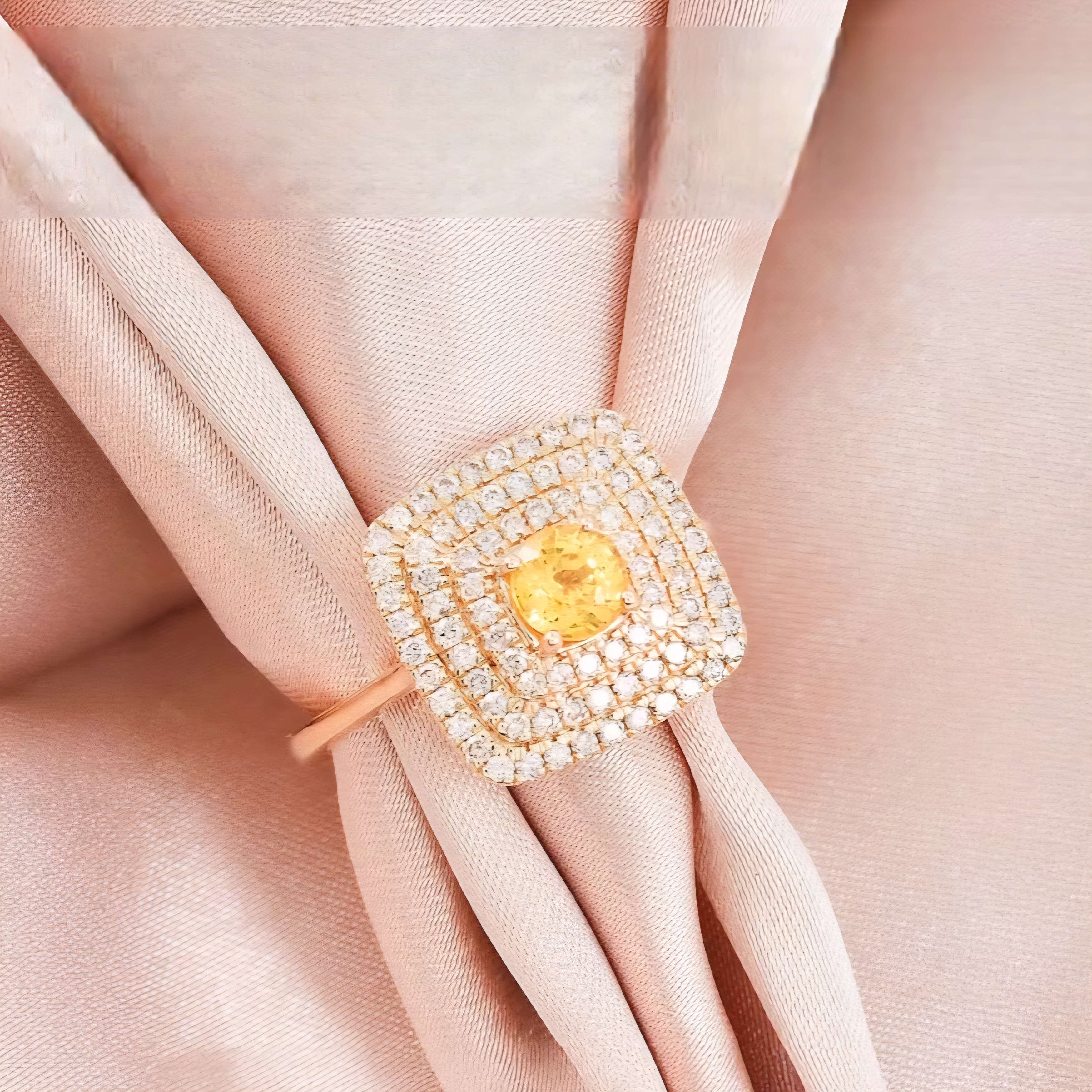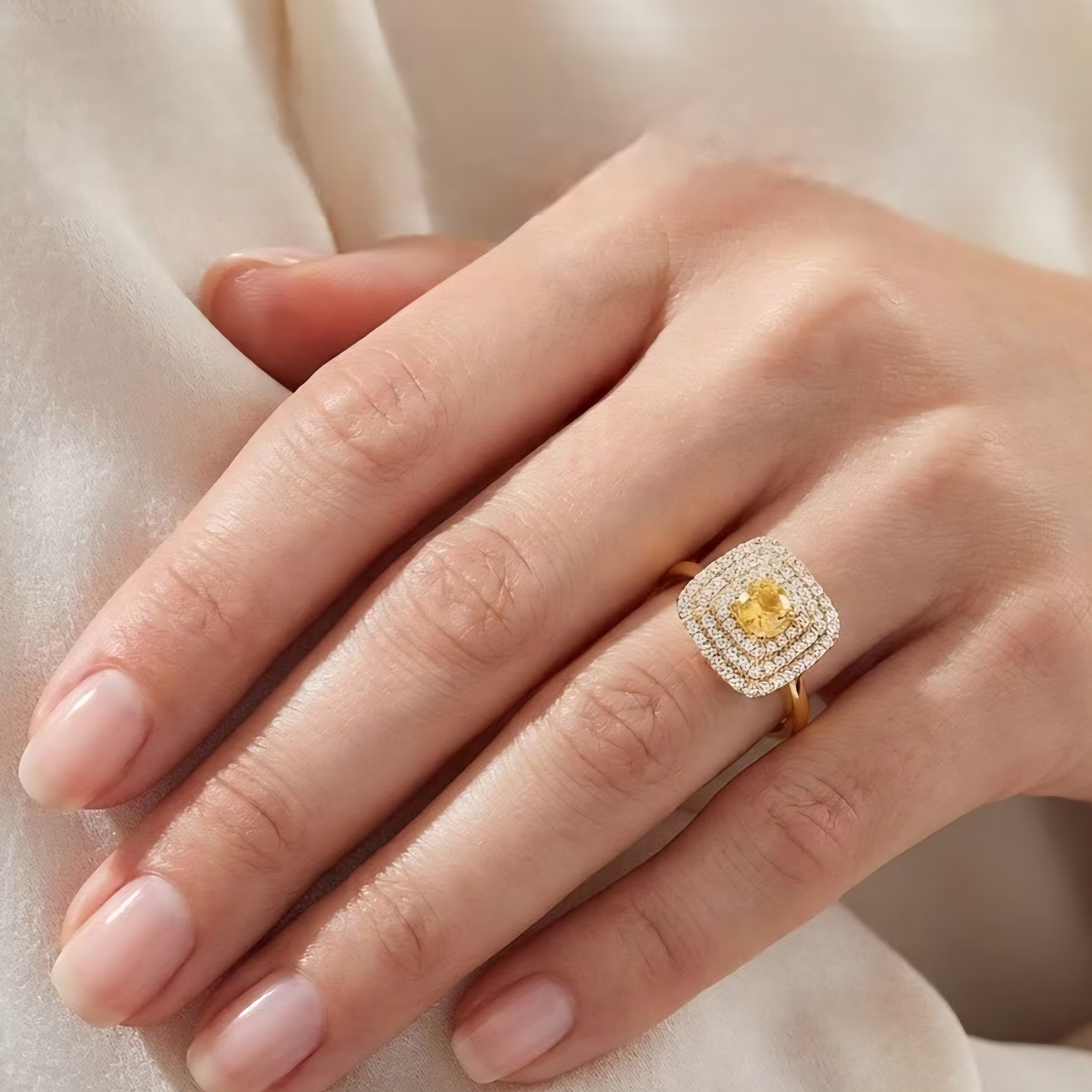 This ring is unapologetically bold. A vivid yellow sapphire from Madagascar anchors the design, cut in a precise 5.5mm round that delivers brightness without dilution. The color reads warm, saturated, and intentional, not pale, not washed out.
