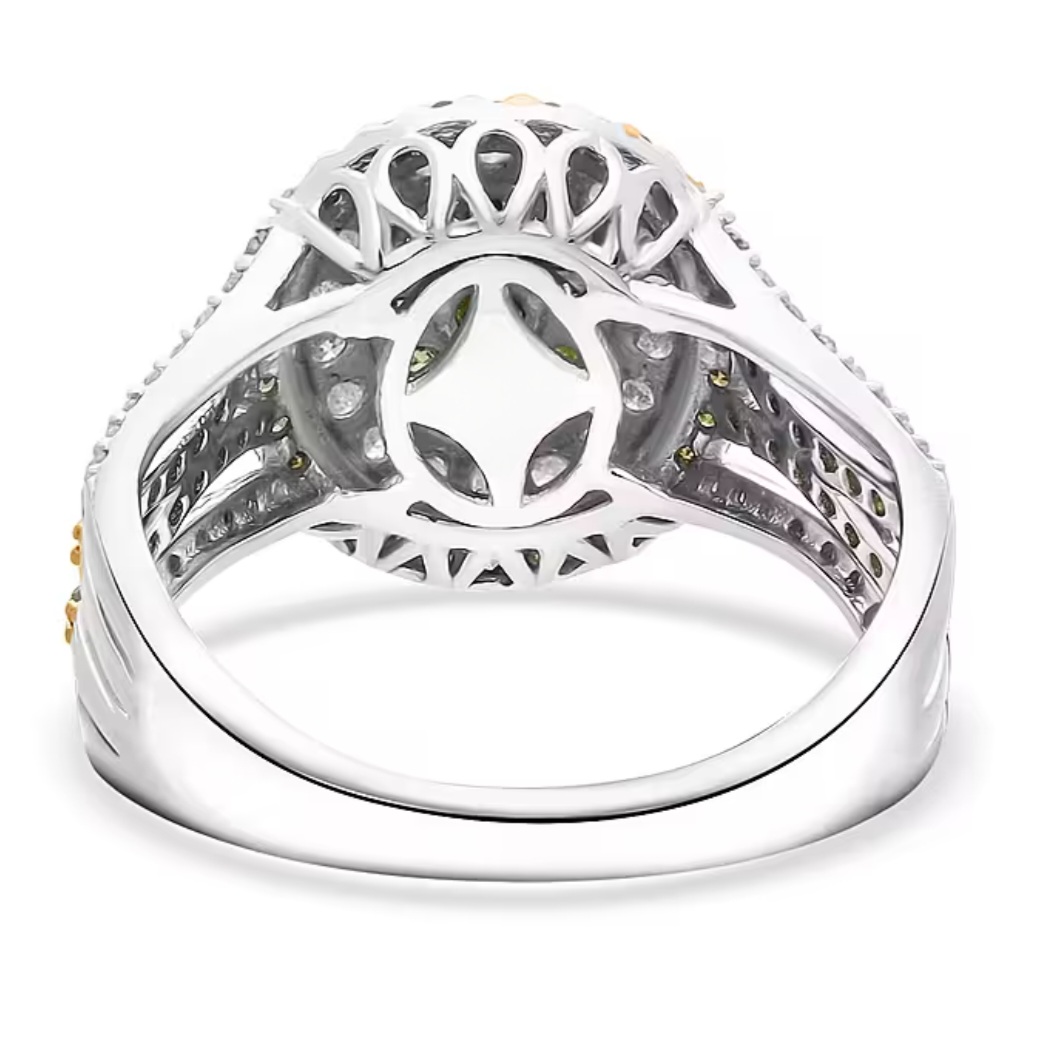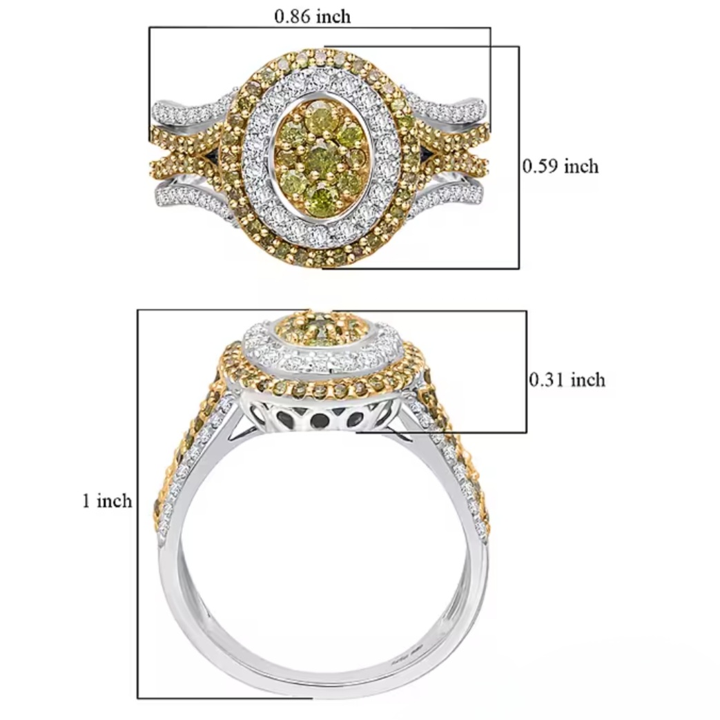 This cluster halo ring features a dense arrangement of yellow diamonds at the center, set in 18K yellow gold plating to enhance warmth and depth of color. A surrounding halo of white diamonds adds contrast and structure, while diamond-accented shoulders extend the sparkle across the band.