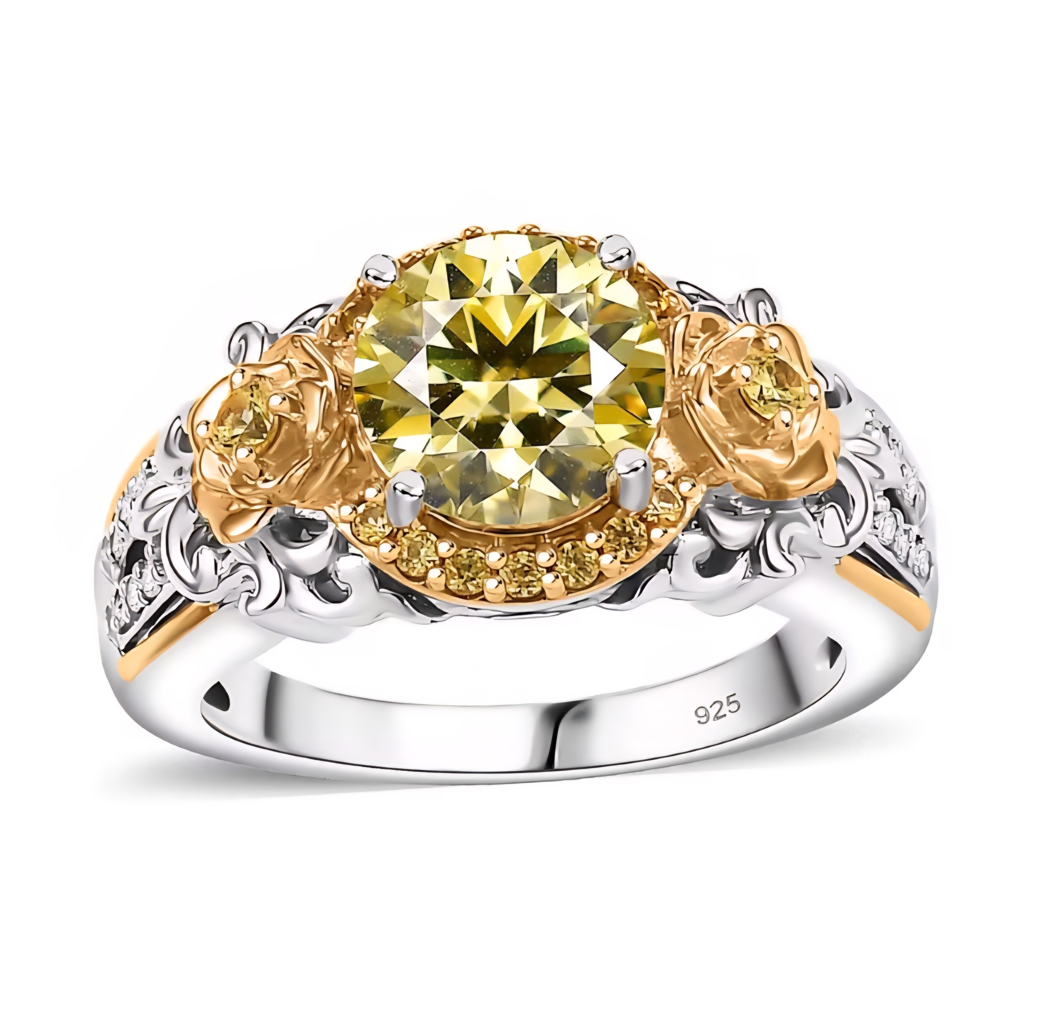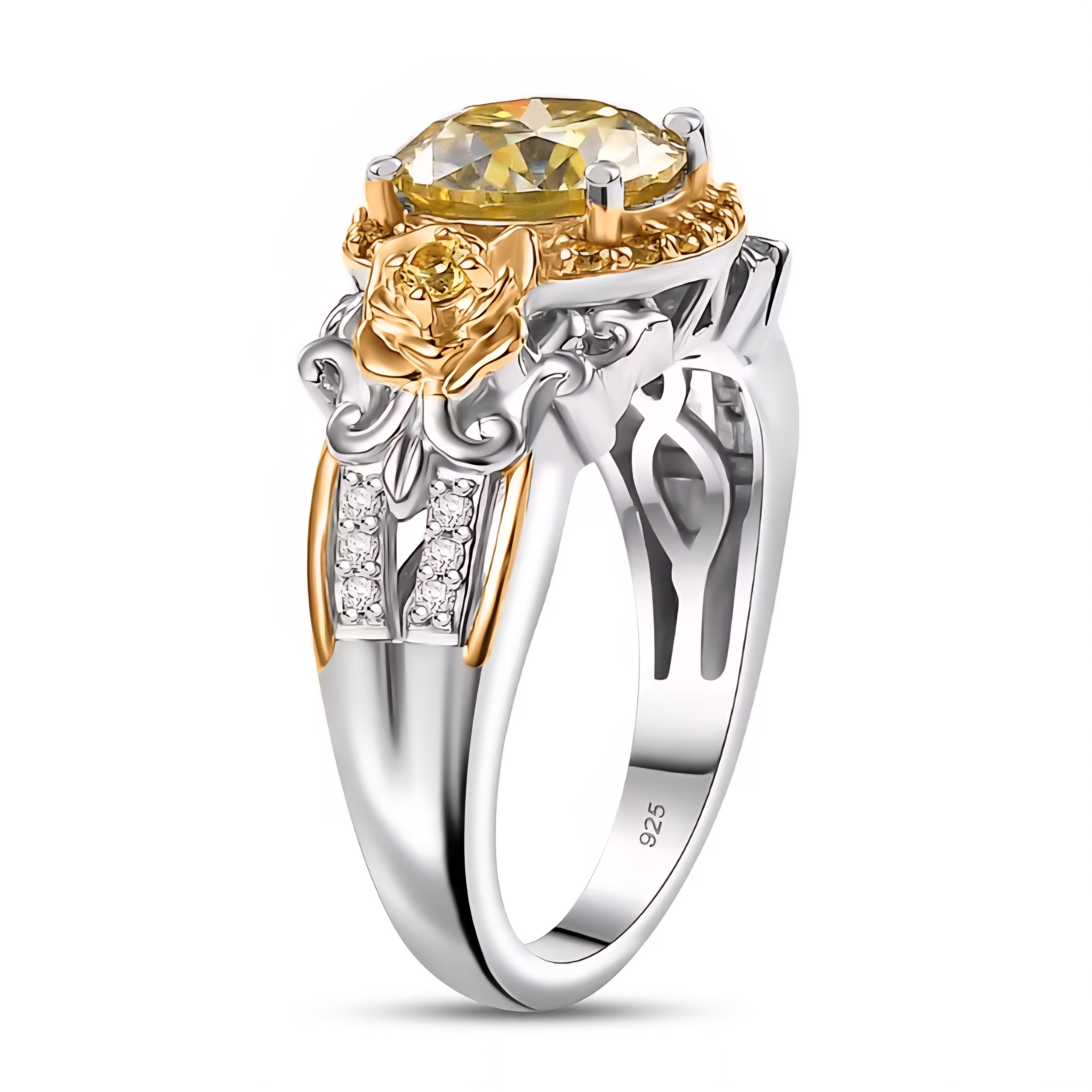 This floral-inspired ring balances warmth, contrast, and precision. A vivid yellow moissanite center anchors the design, framed by a half halo of yellow sapphires that enhance depth and saturation. White moissanite accents add brightness and structure, giving the piece dimension without softening its edge.